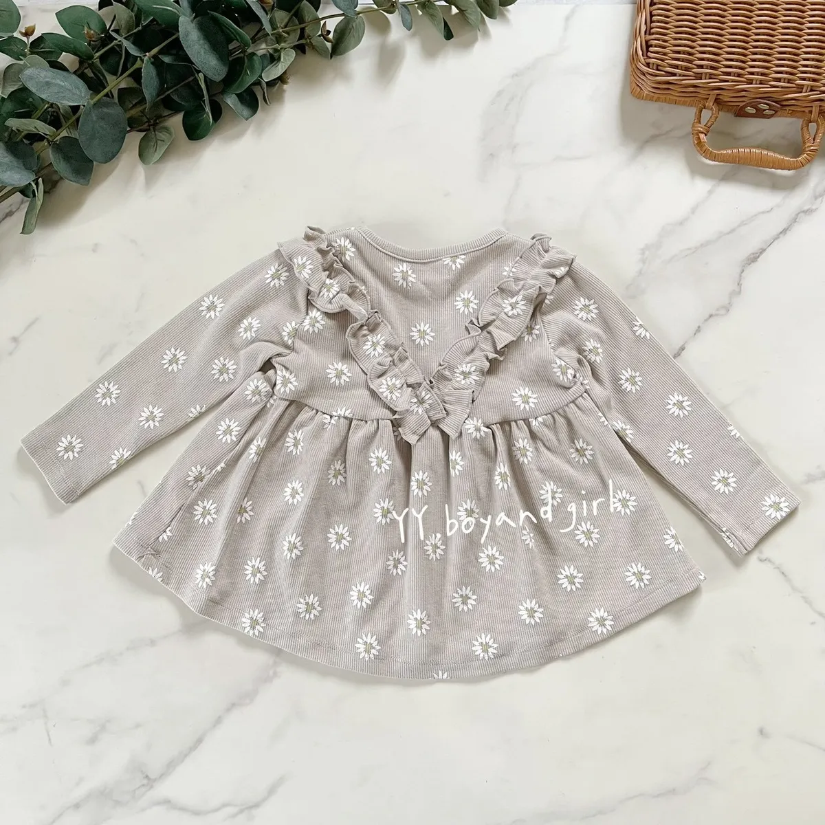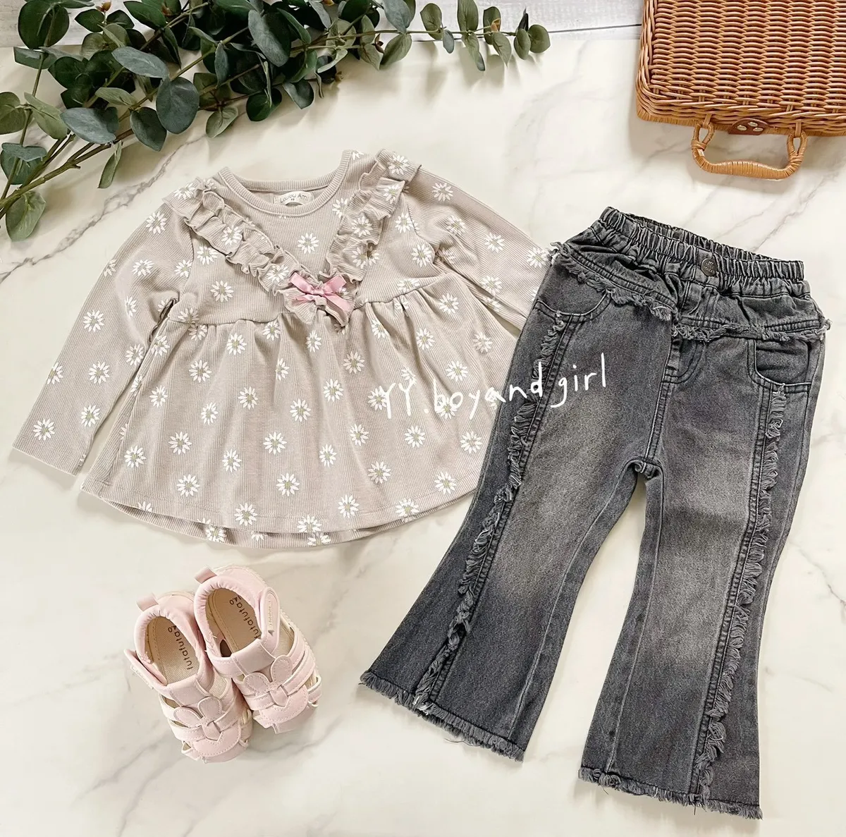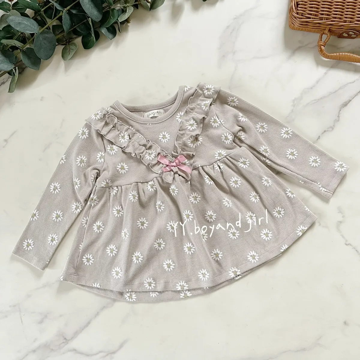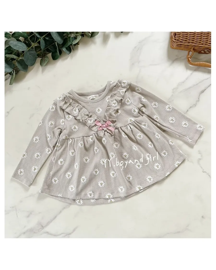 ✨質感奶灰色小雛菊上衣, 胸前荷葉V字設計,再加上蝴蝶結點綴, 穿上甜美可愛~下身搭配牛仔褲修飾身形又有俏皮感~布料柔軟舒適, 日常百搭,是小女孩的甜美氣質必備款~ 材質: 55%棉彈力: 有標籤: 剪標款