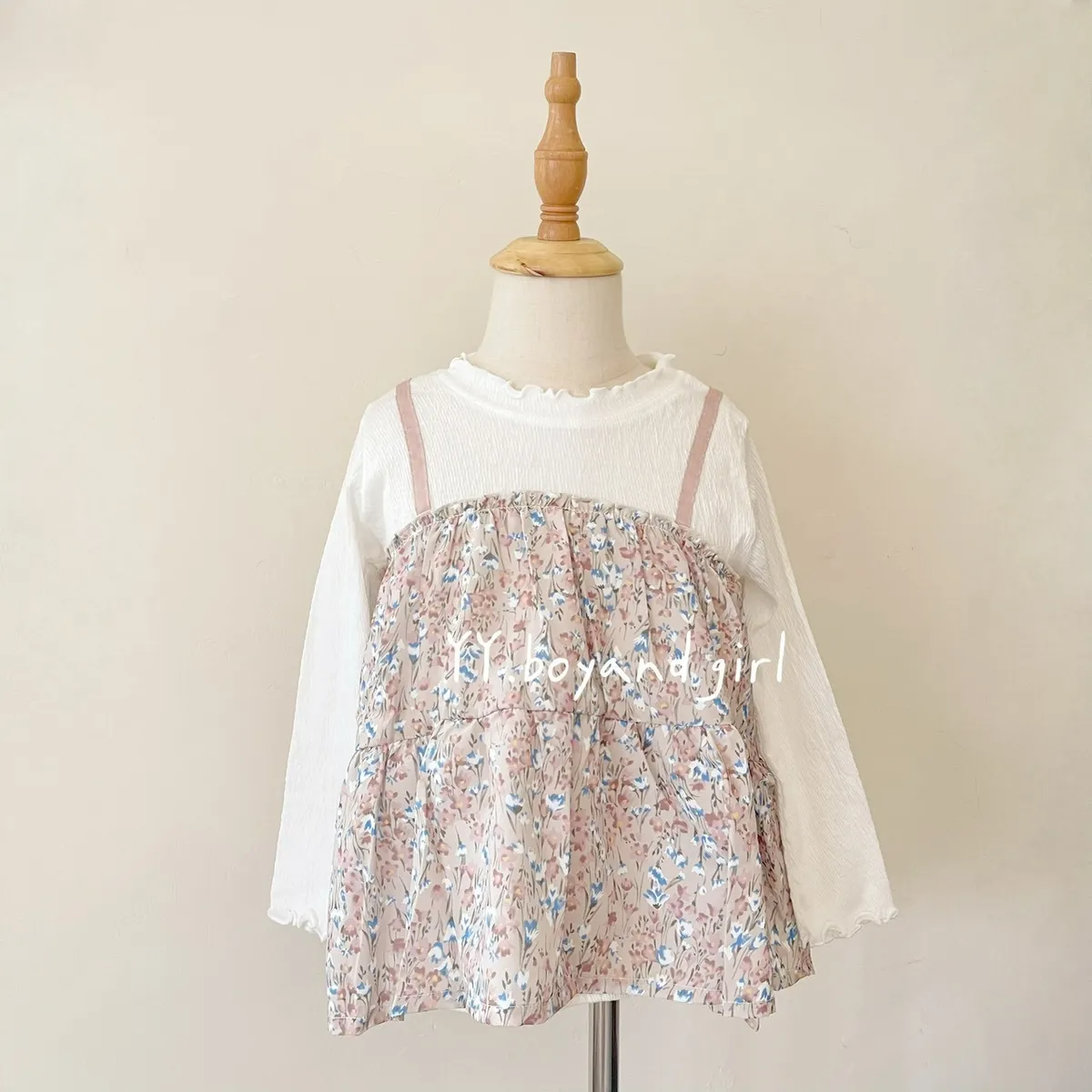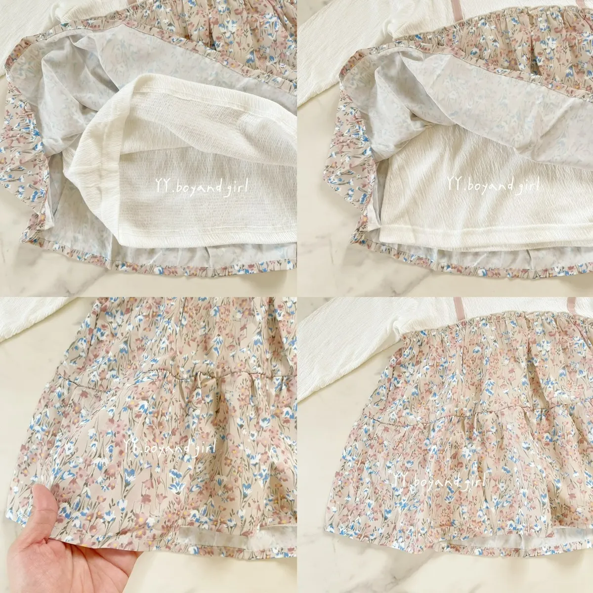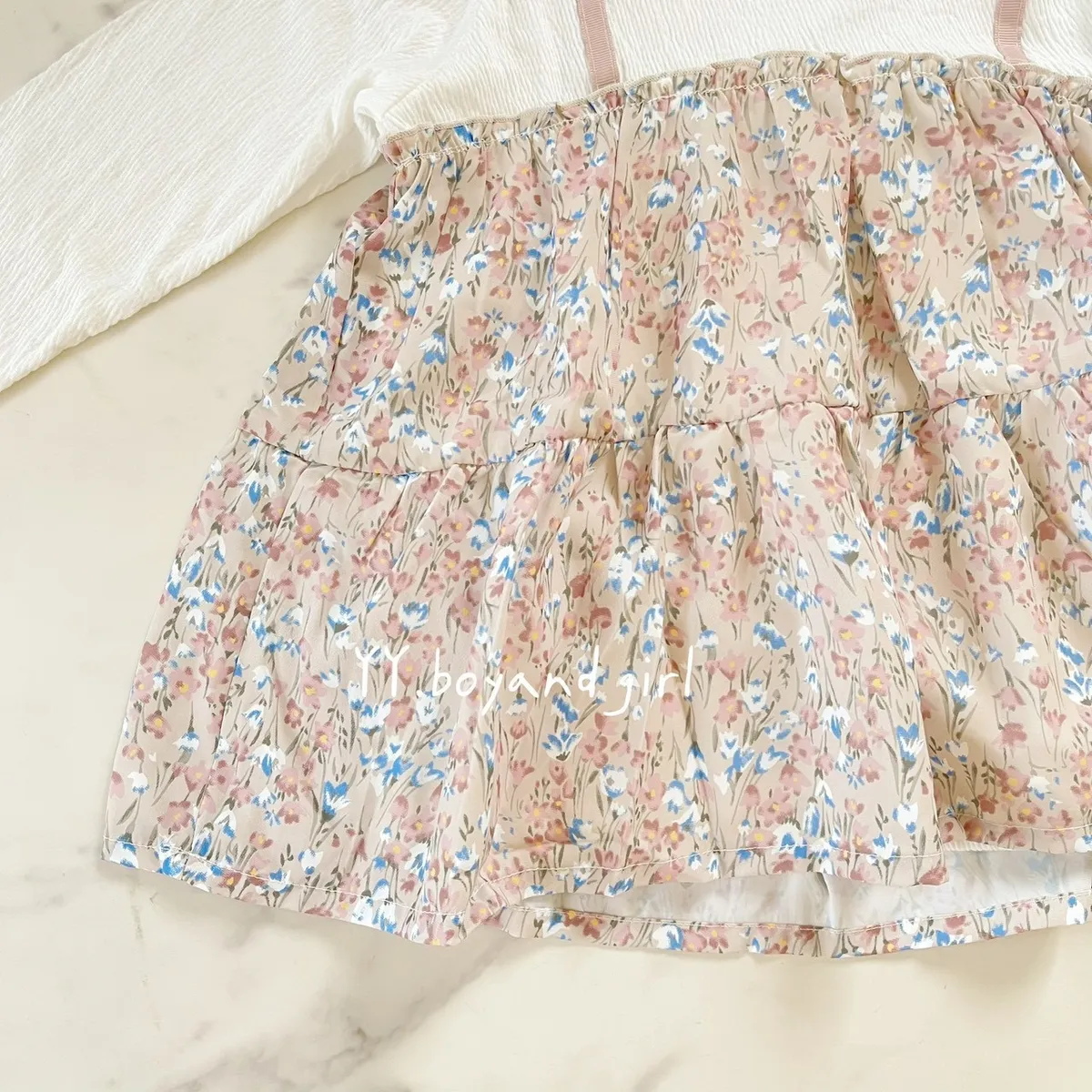 細緻壓紋奶白打底+高級奶杏小碎花飄逸裙擺,