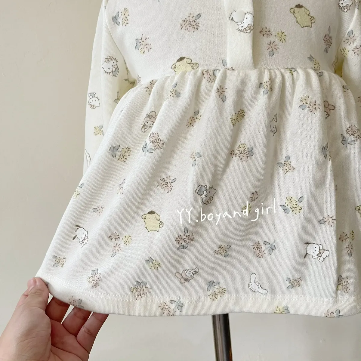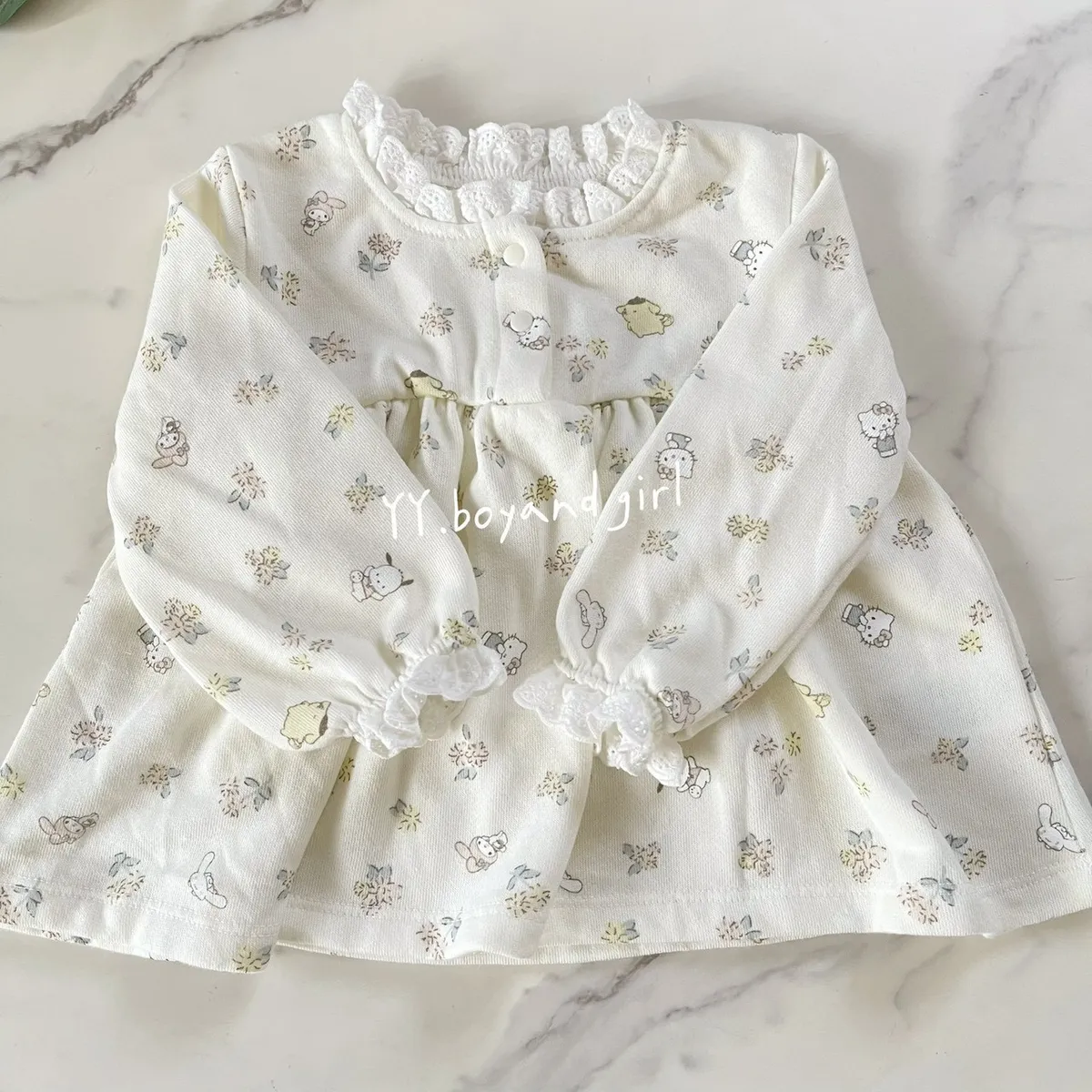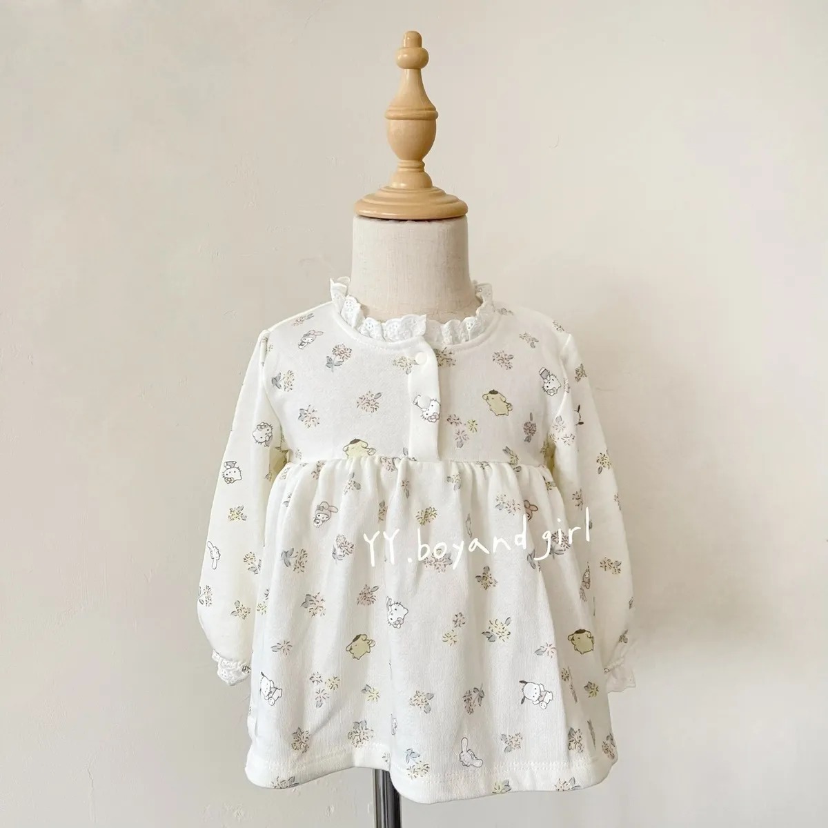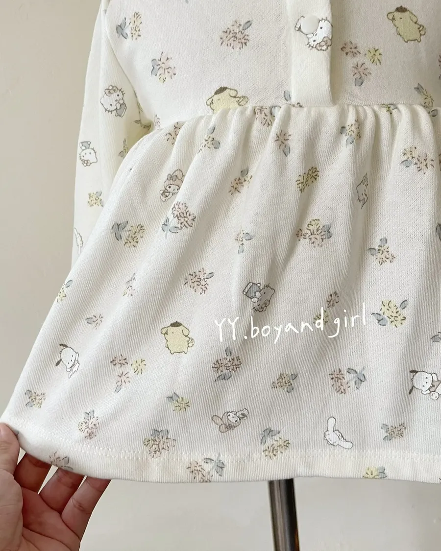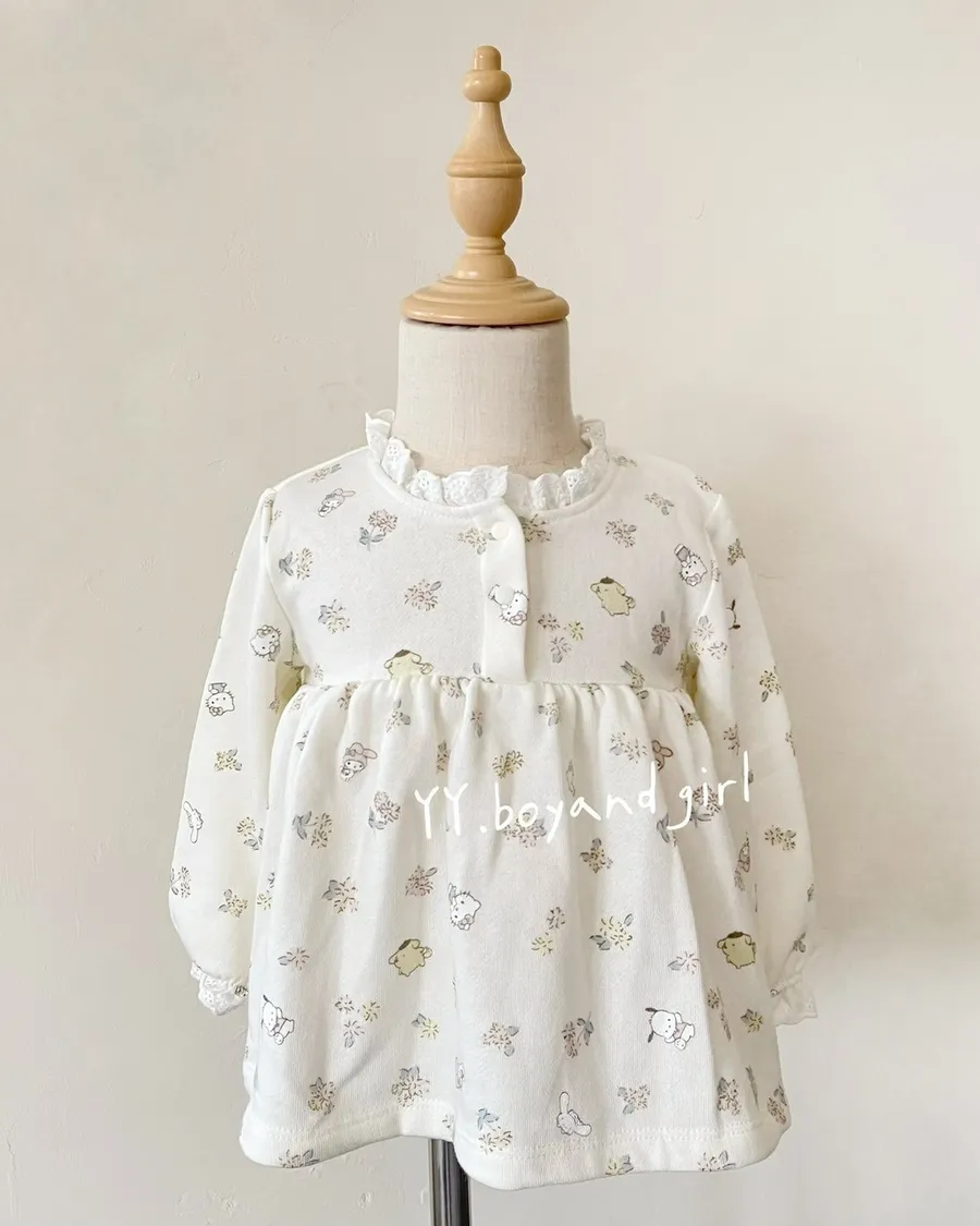 材質: 98%棉彈力: 佳✨ 溫柔奶油白底×淡彩可愛人氣腳色 x 小碎花,有怕洽狗, 美樂蒂, 布丁狗, 大耳狗,KT...等, 一起在森林裡開party!!領口跟袖口有細緻蕾絲點綴讓小女寶穿上乖巧又療育~最好搭配的顏色, 下半身隨便搭都好看內裡毛圈材質, 彈力佳