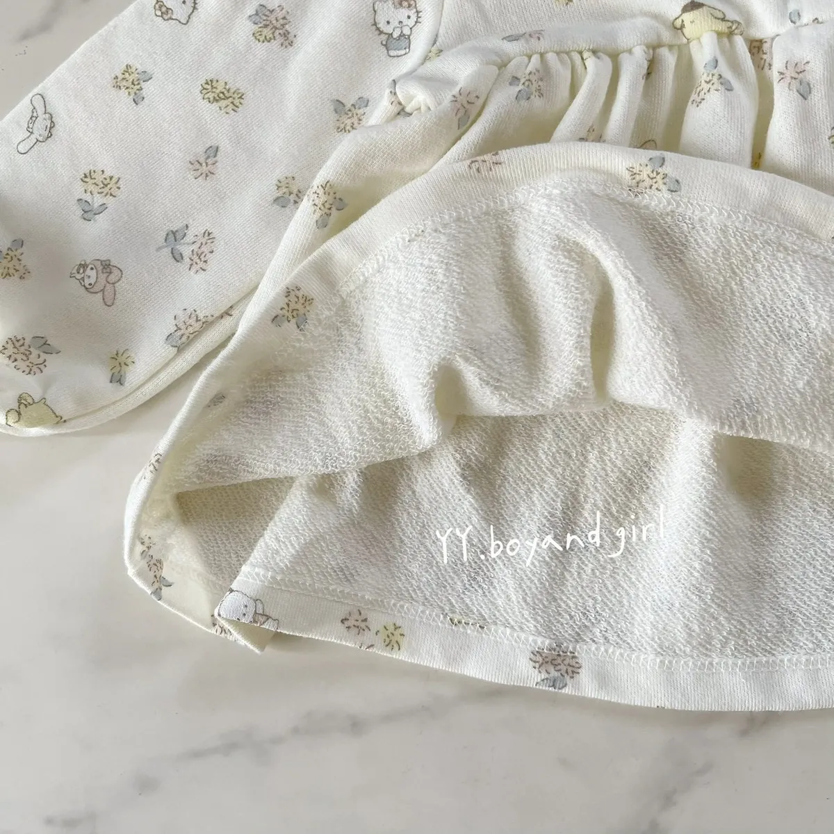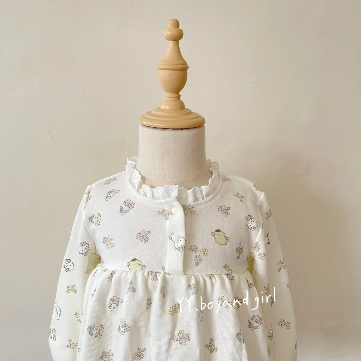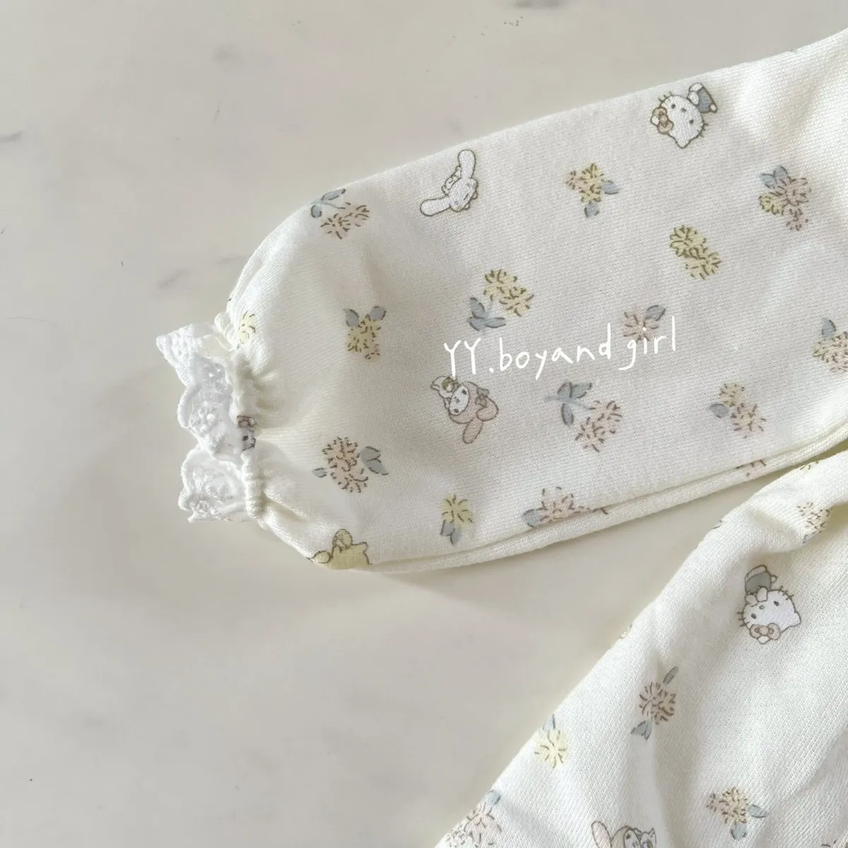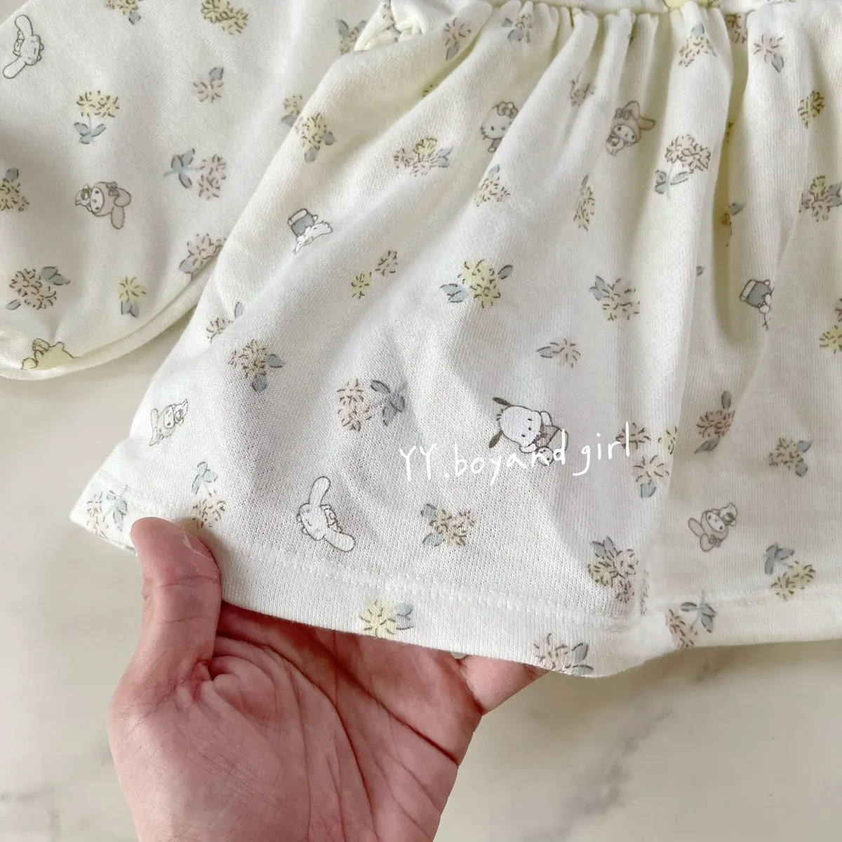 材質: 98%棉彈力: 佳✨ 溫柔奶油白底×淡彩可愛人氣腳色 x 小碎花,有怕洽狗, 美樂蒂, 布丁狗, 大耳狗,KT...等, 一起在森林裡開party!!領口跟袖口有細緻蕾絲點綴讓小女寶穿上乖巧又療育~最好搭配的顏色, 下半身隨便搭都好看內裡毛圈材質, 彈力佳