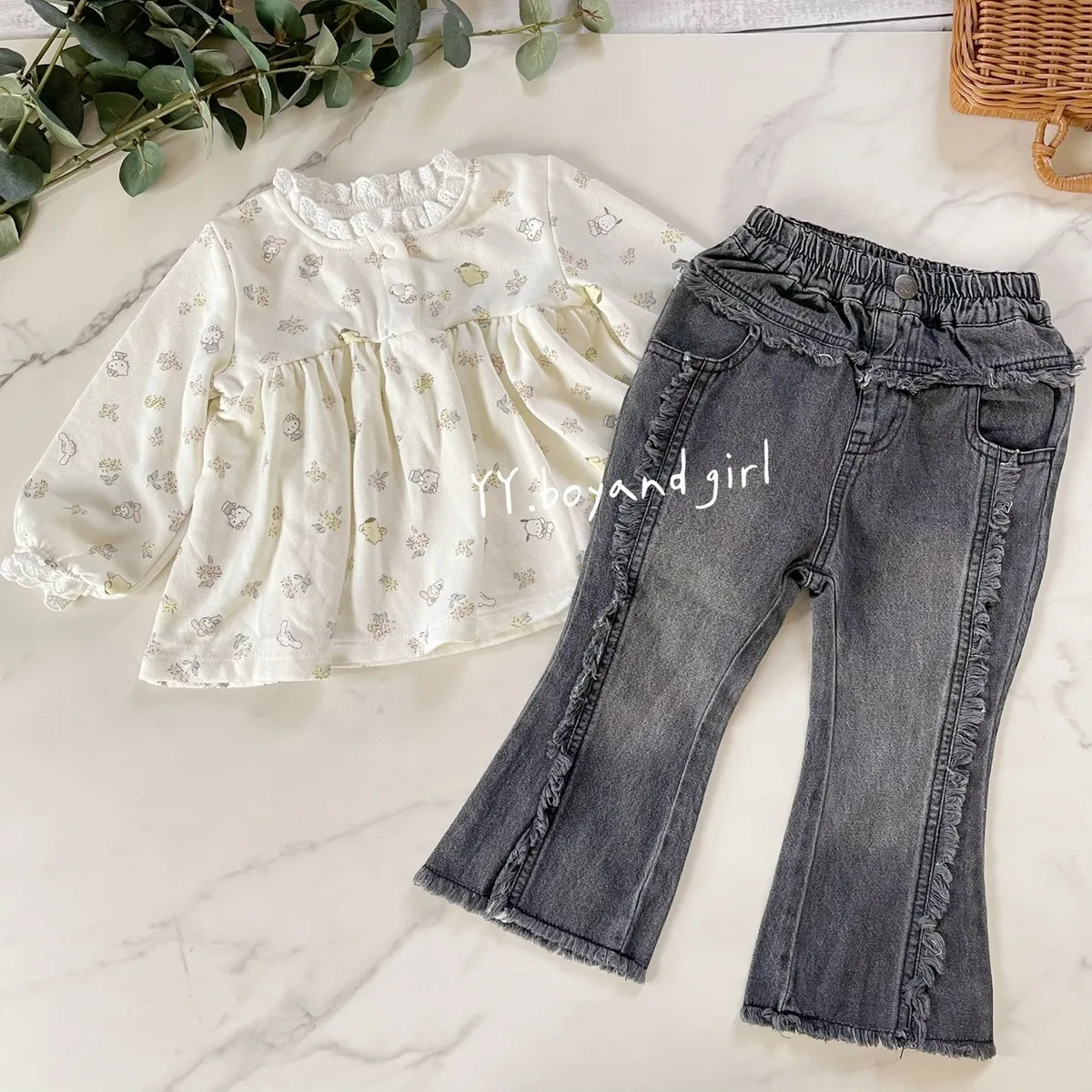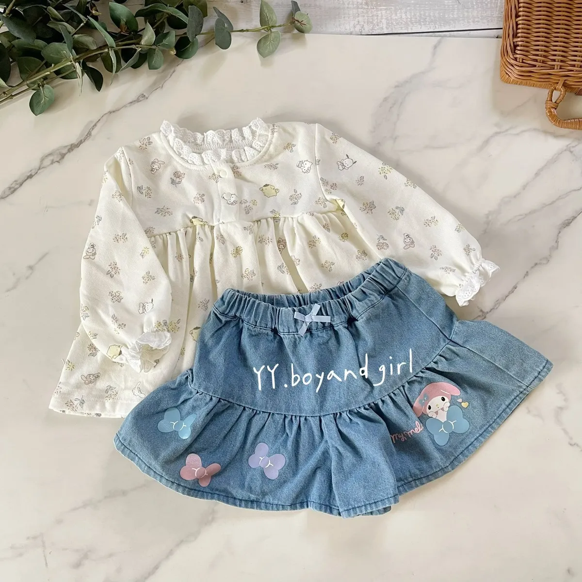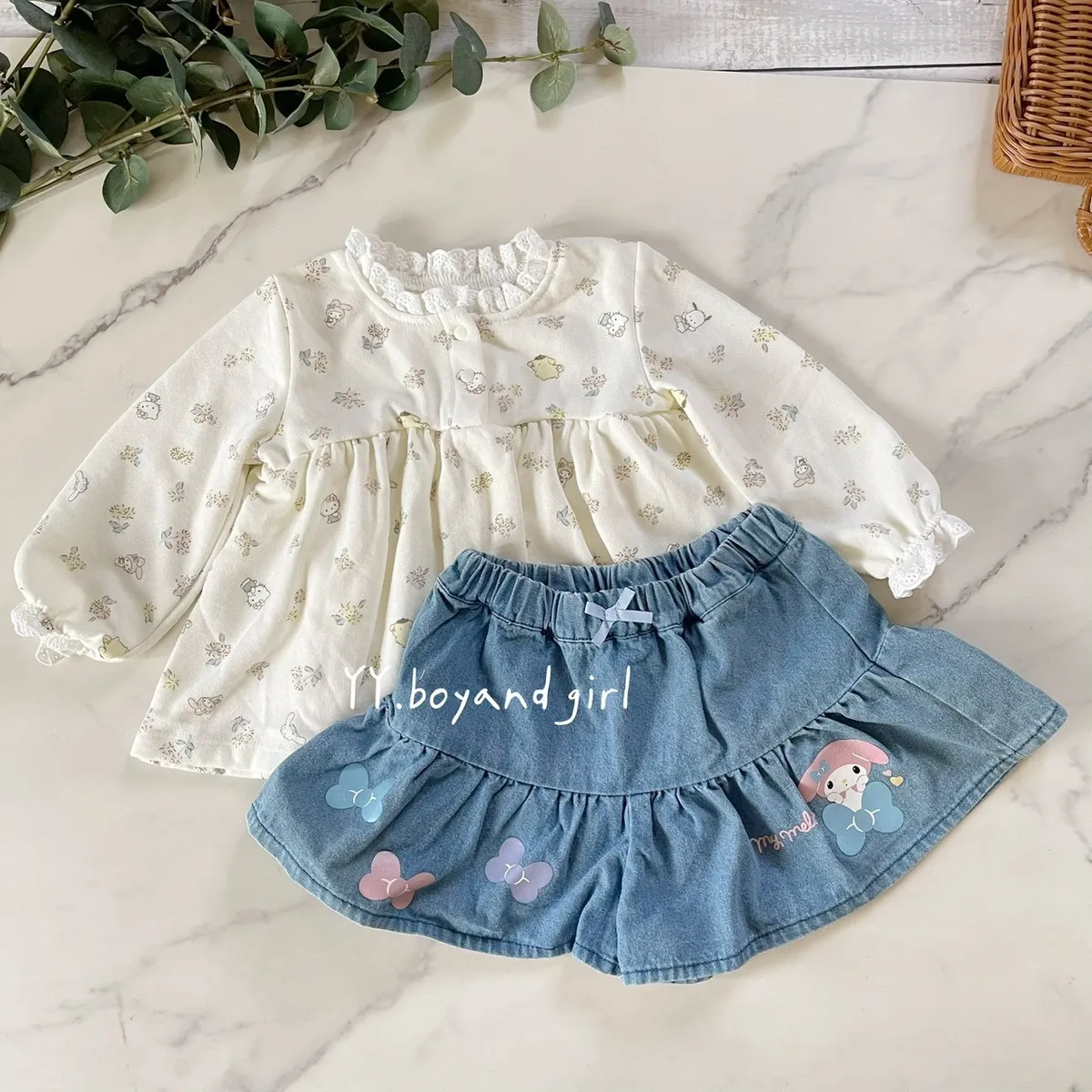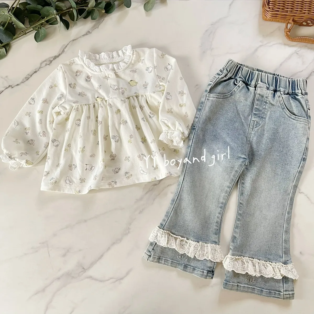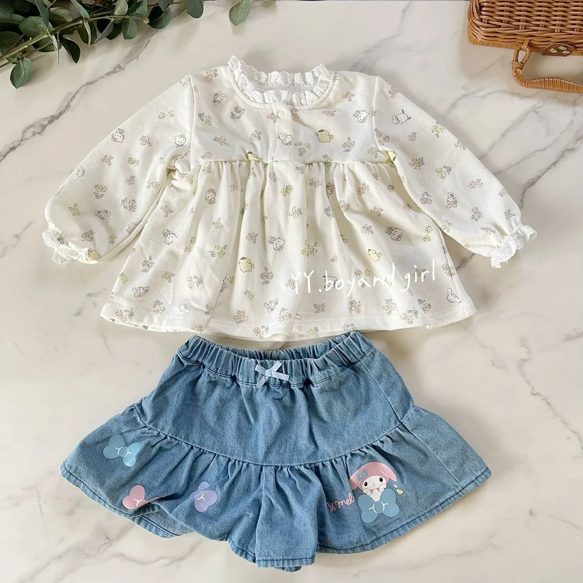 材質: 98%棉彈力: 佳✨ 溫柔奶油白底×淡彩可愛人氣腳色 x 小碎花,有怕洽狗, 美樂蒂, 布丁狗, 大耳狗,KT...等, 一起在森林裡開party!!領口跟袖口有細緻蕾絲點綴讓小女寶穿上乖巧又療育~最好搭配的顏色, 下半身隨便搭都好看內裡毛圈材質, 彈力佳