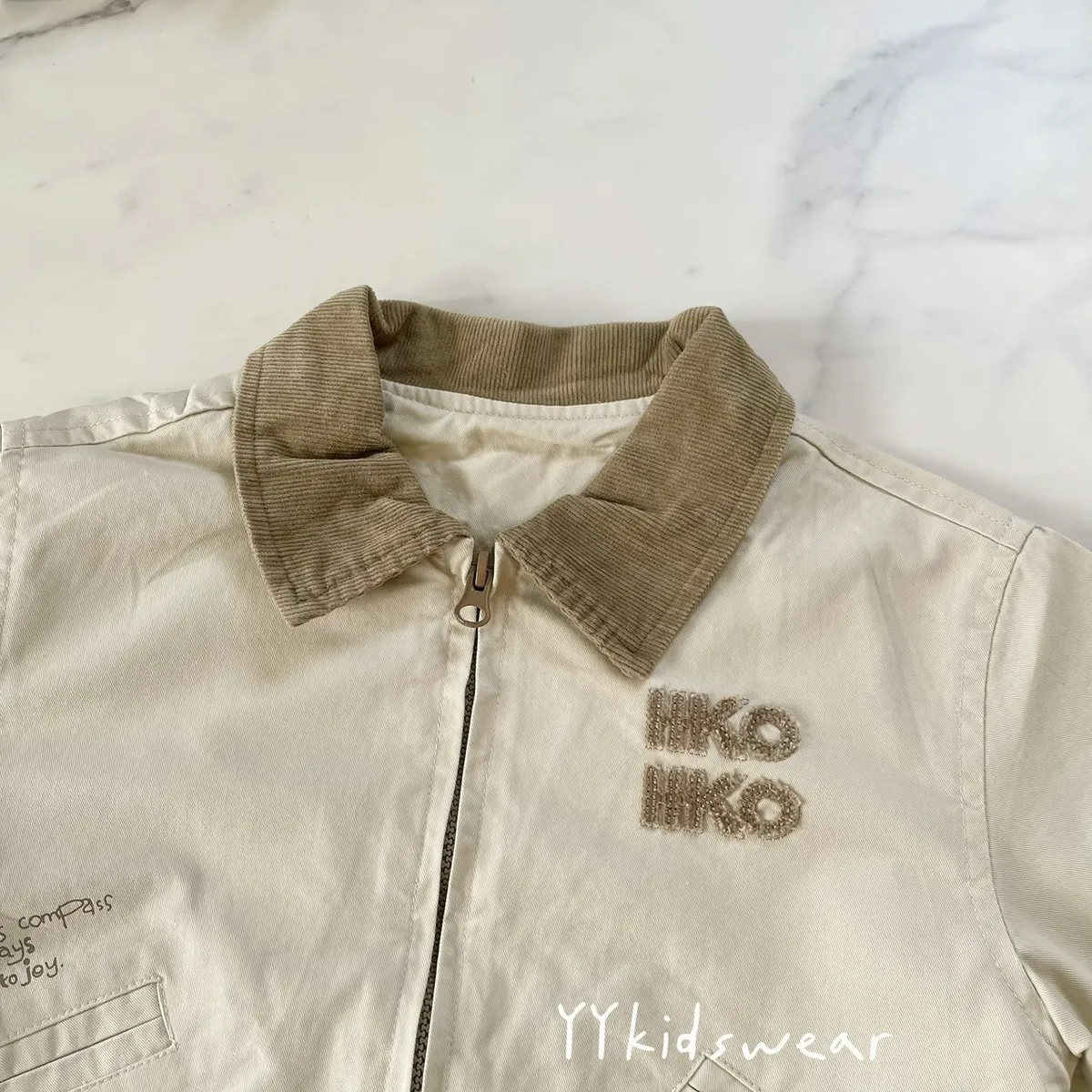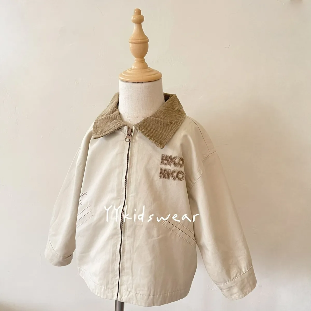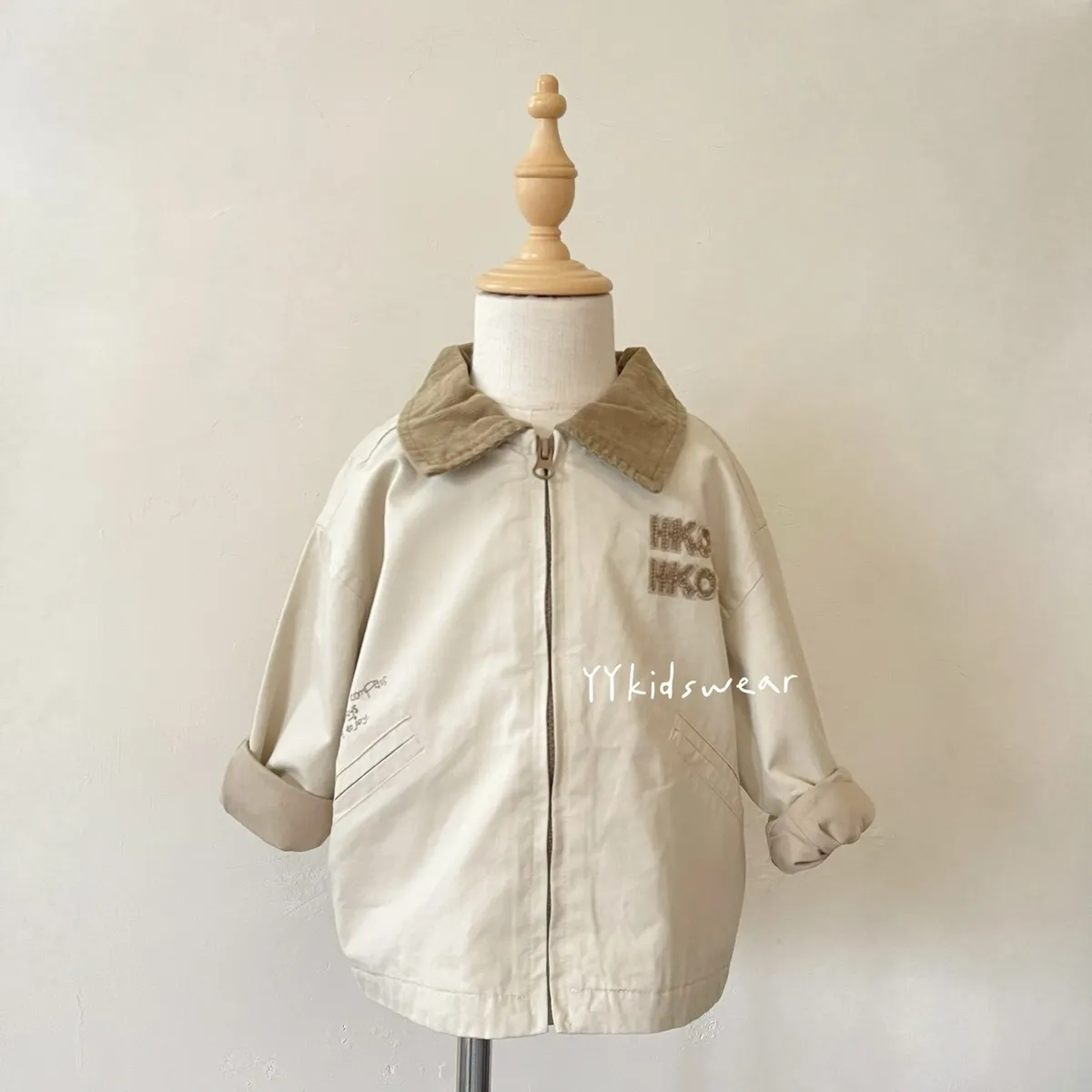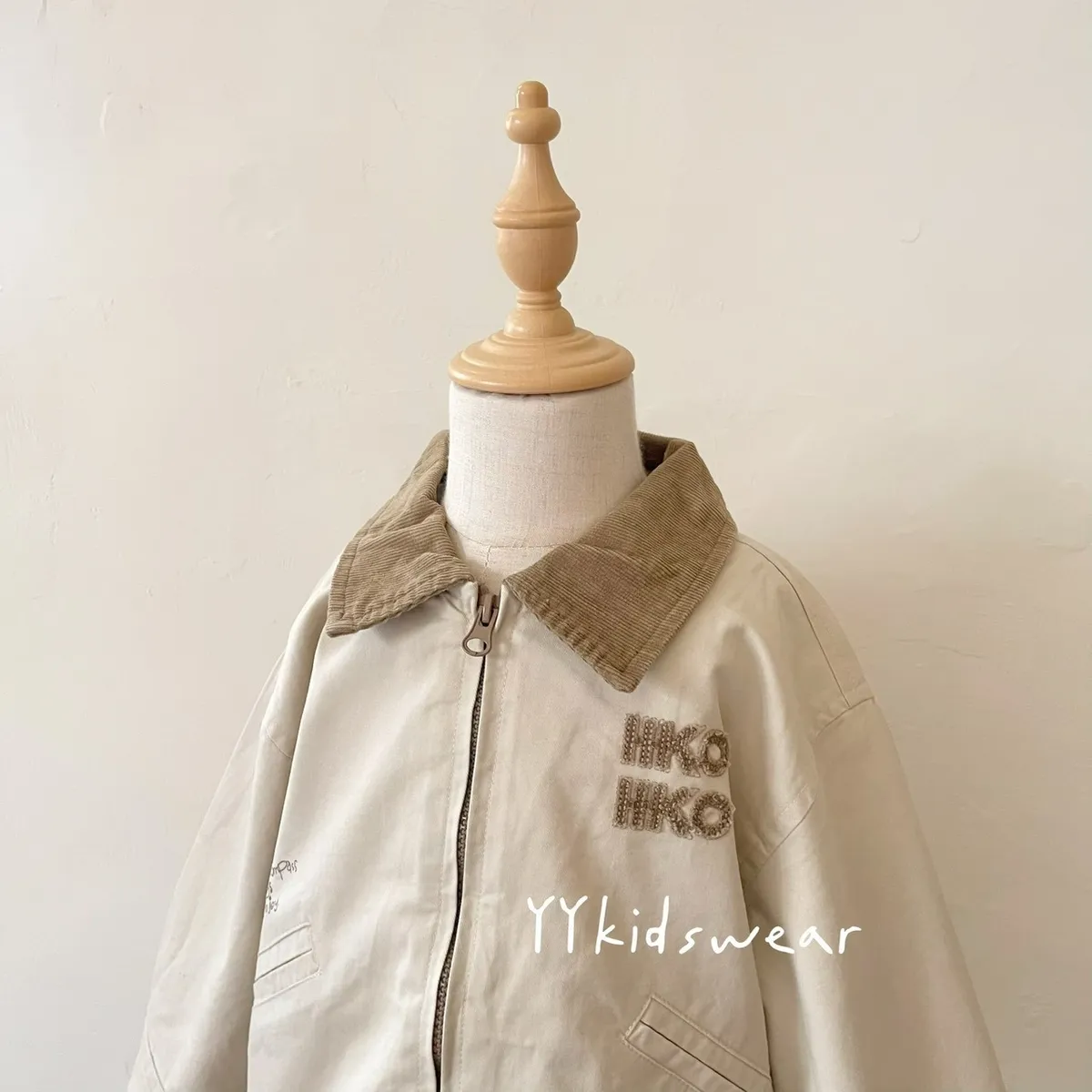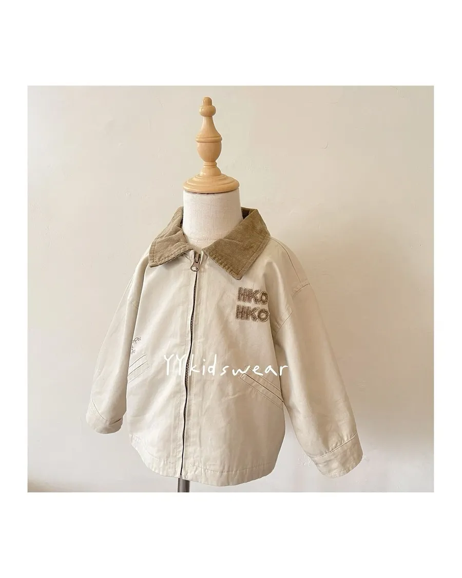 這款外套以溫柔奶茶色為基底,搭配短絨布領與毛巾布立體字母刺繡, 細節滿滿,質感不馬虎。