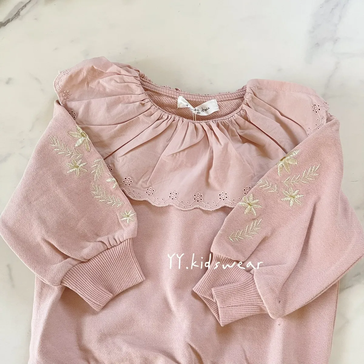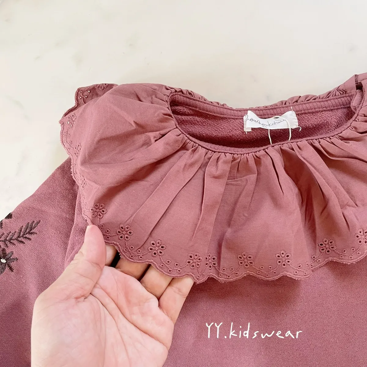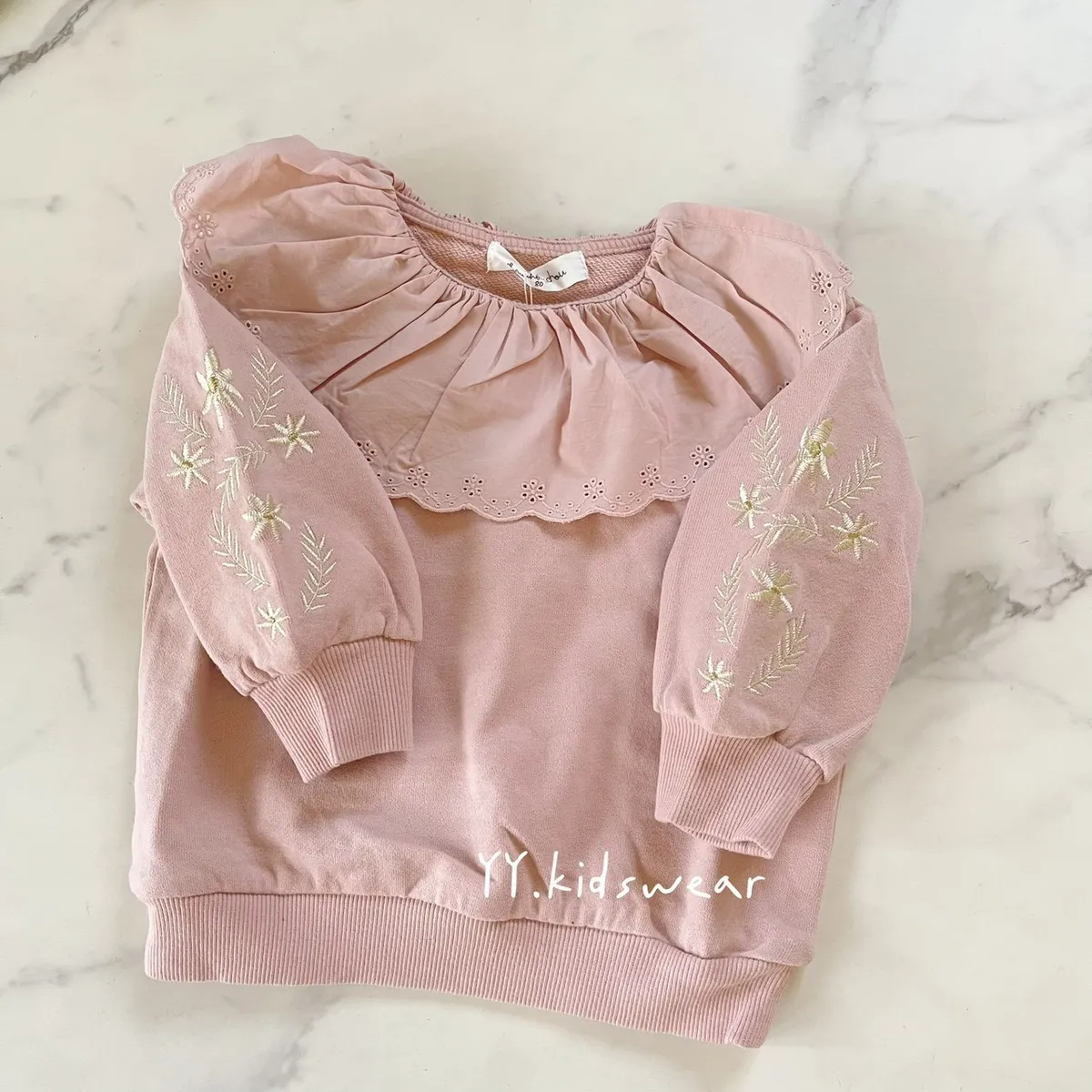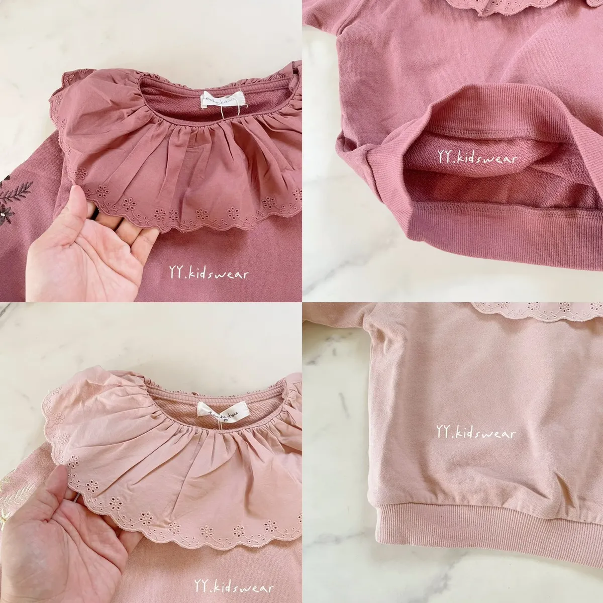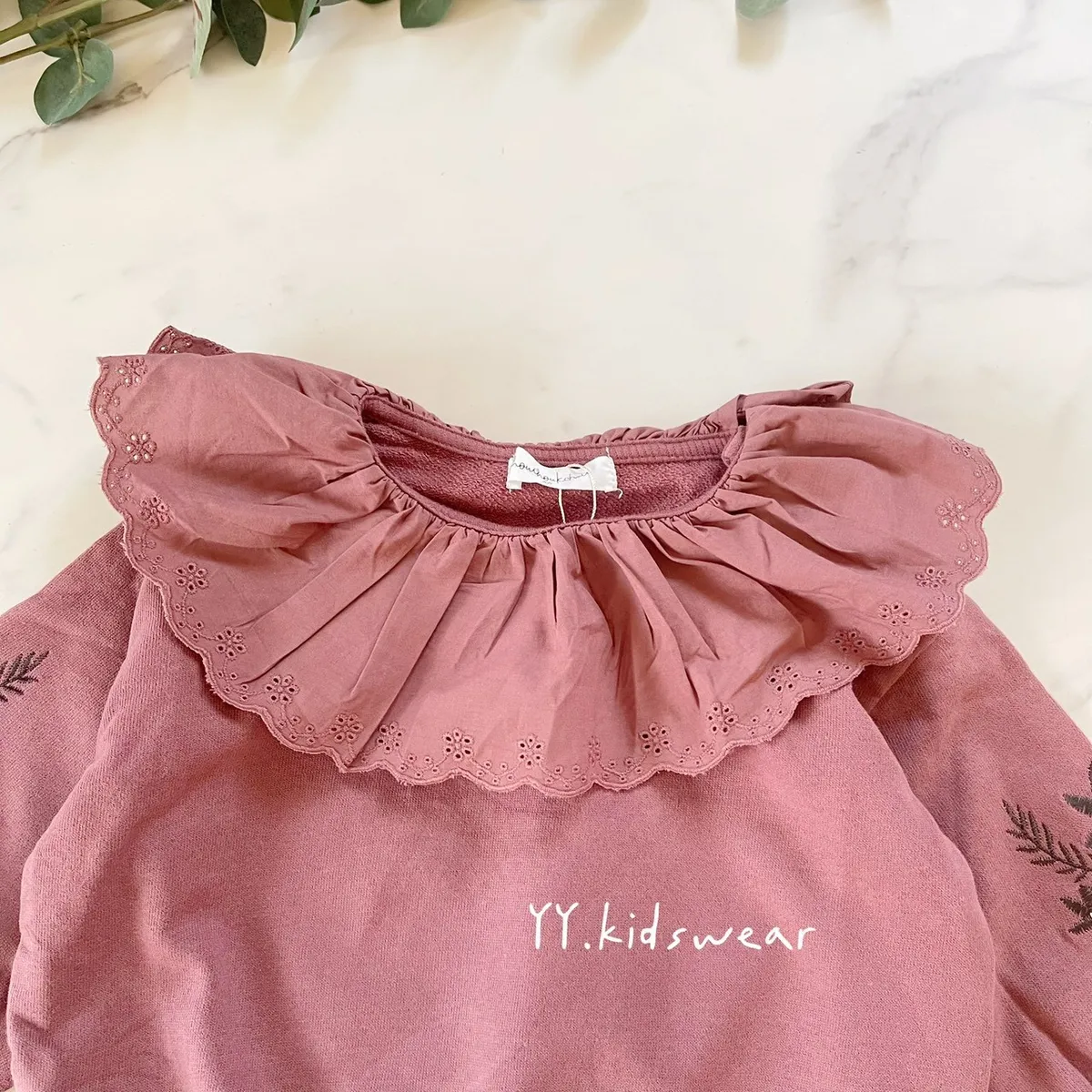 ✨優雅小女孩的秋日上衣,看似簡單,卻細節多多,純棉上衣, 結合立體刺繡花草刺繡,搭配大荷葉領翻翻, 上面還有雕花,細節滿滿、質感極佳~