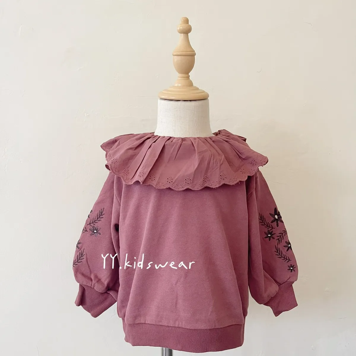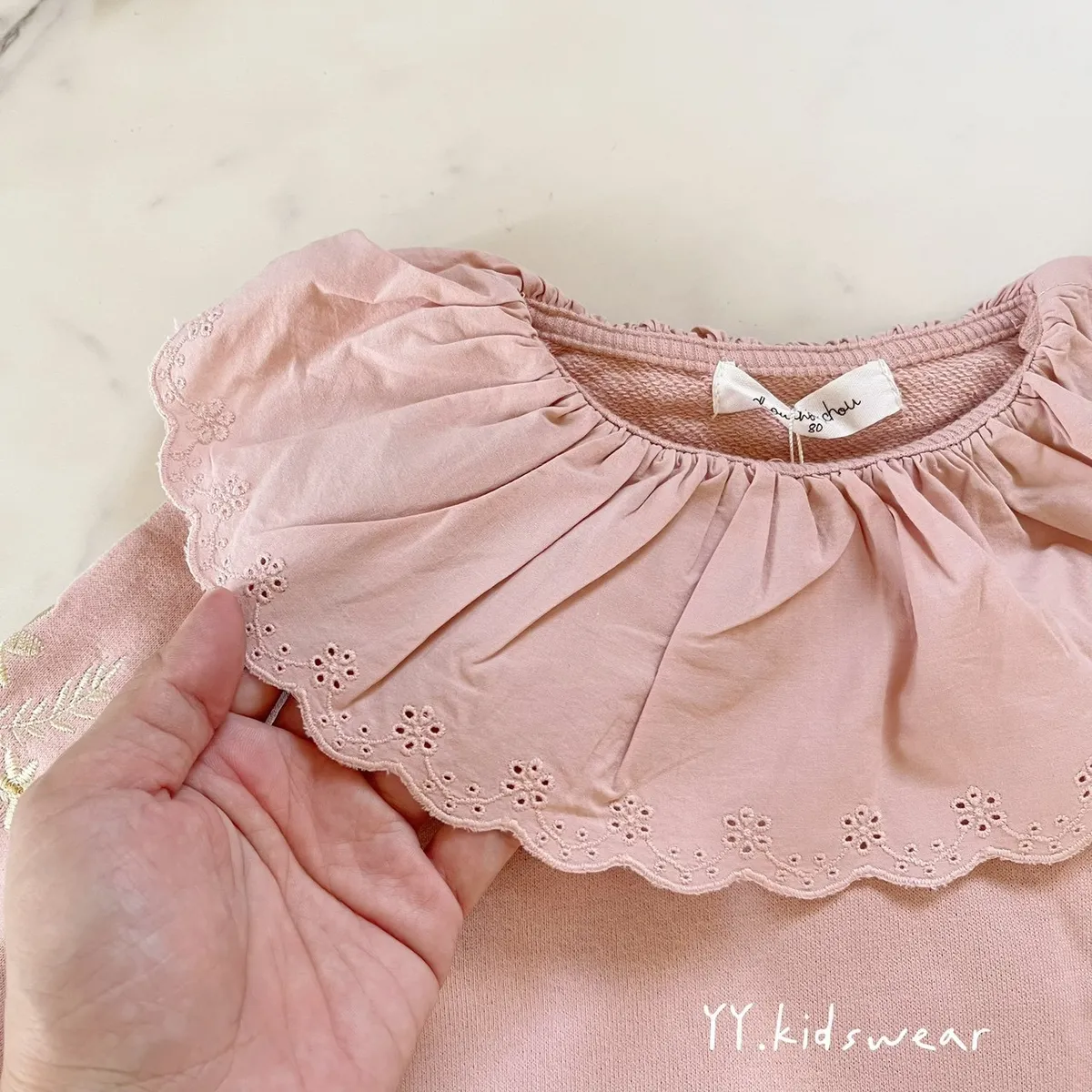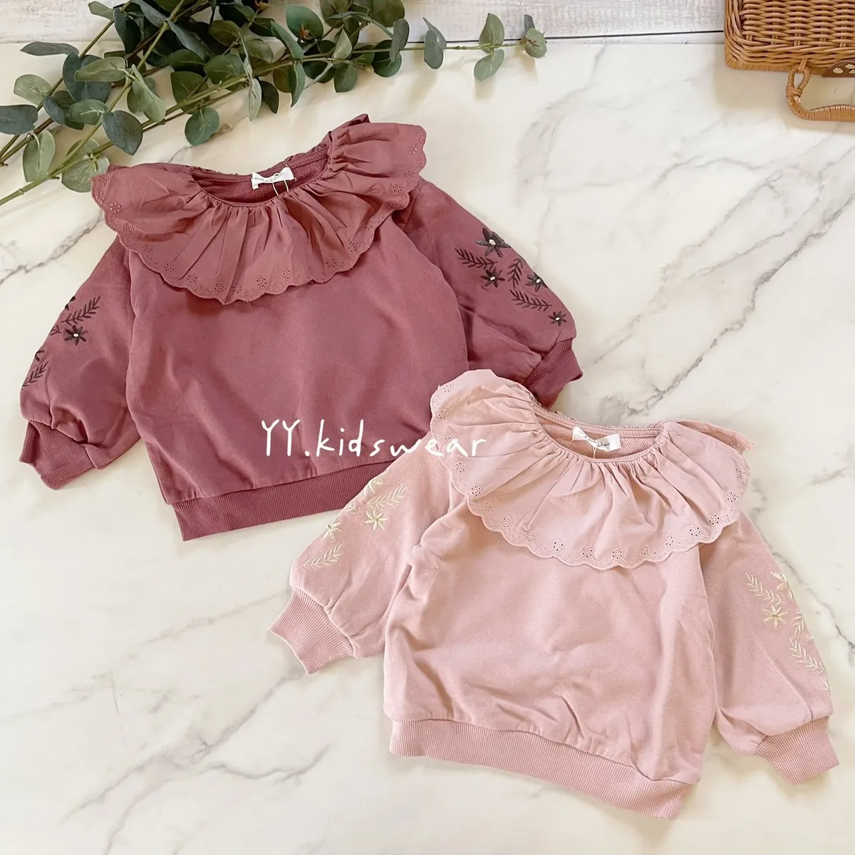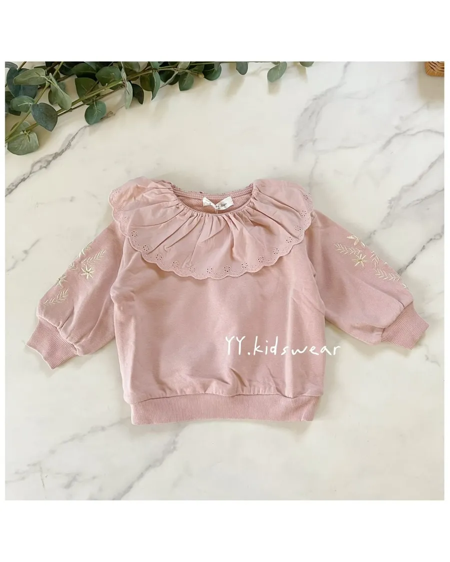 ✨優雅小女孩的秋日上衣,看似簡單,卻細節多多,純棉上衣, 結合立體刺繡花草刺繡,搭配大荷葉領翻翻, 上面還有雕花,細節滿滿、質感極佳~