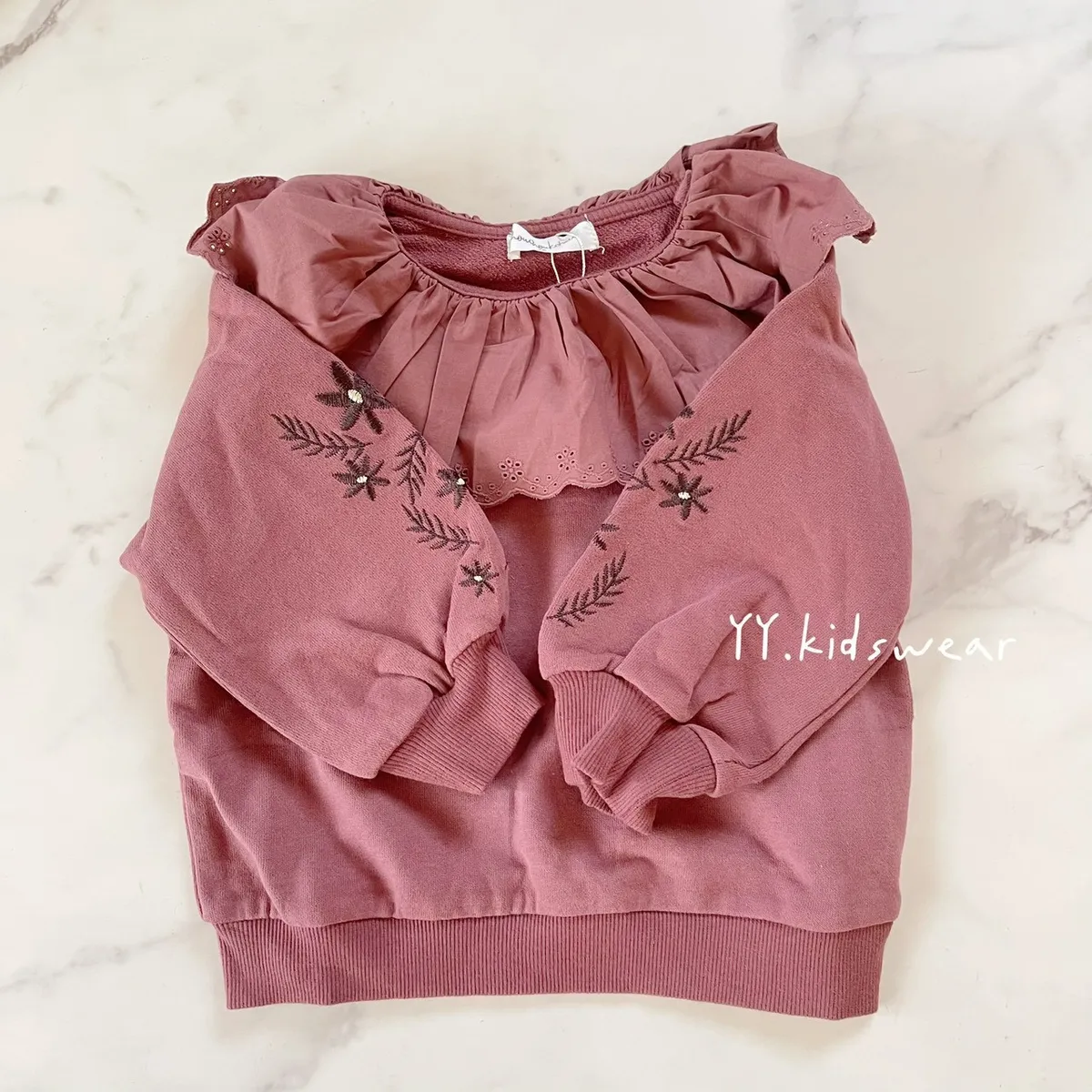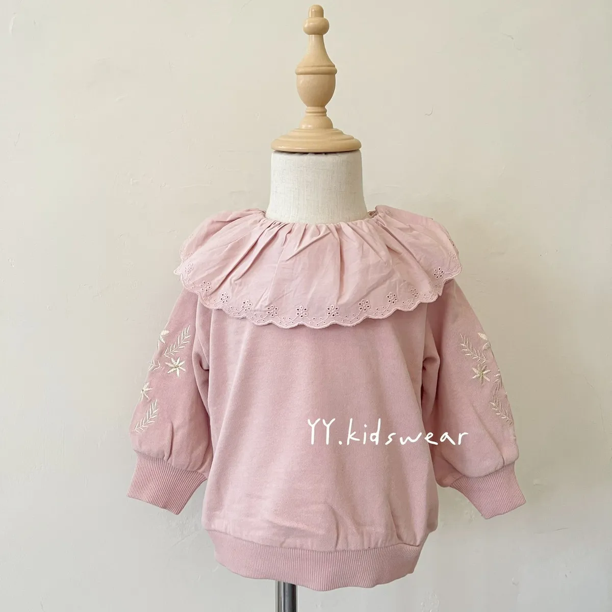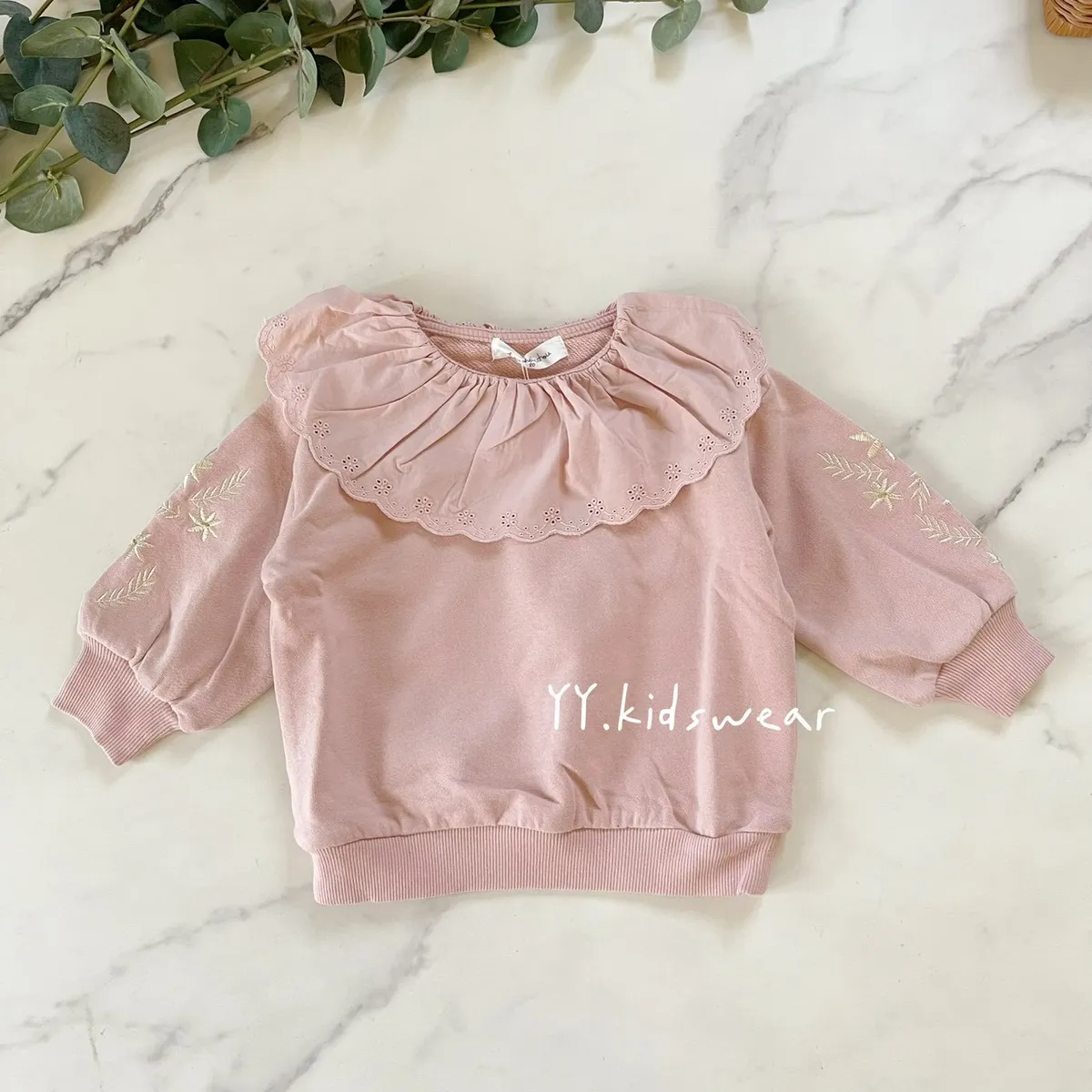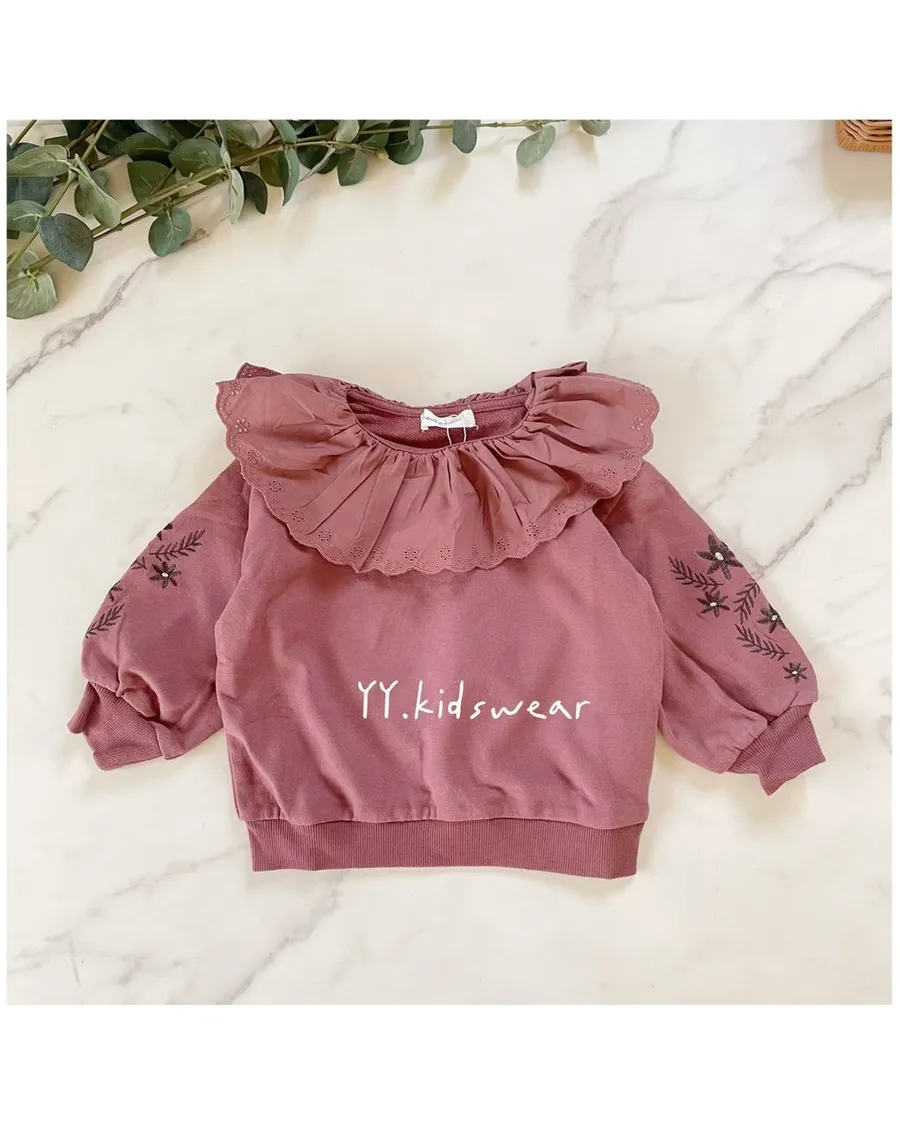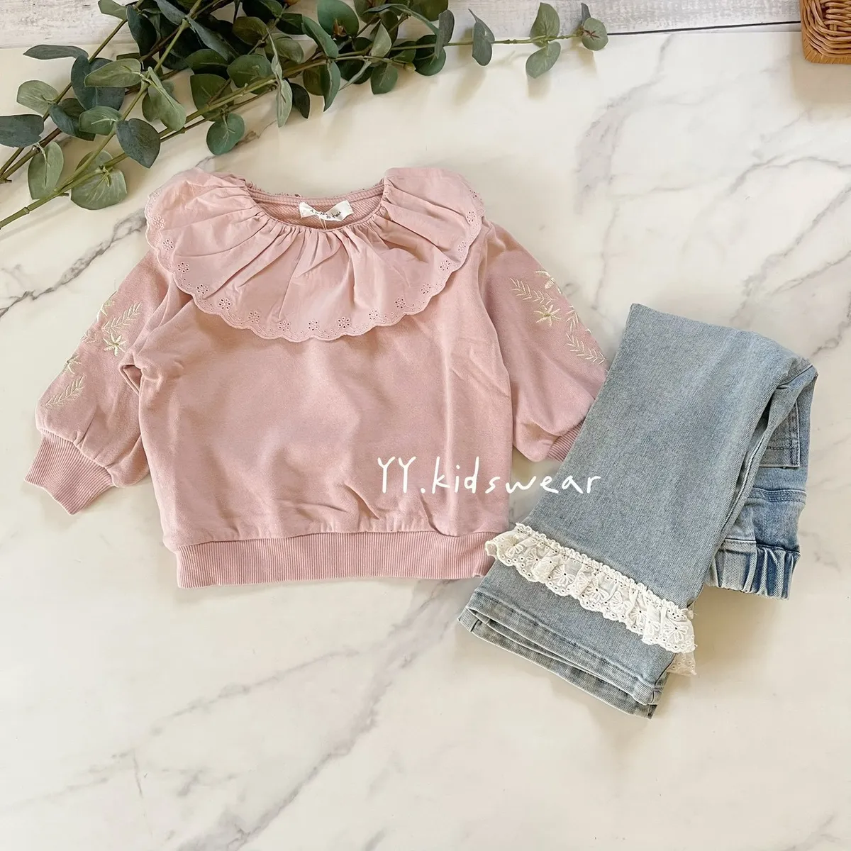 ✨優雅小女孩的秋日上衣,看似簡單,卻細節多多,純棉上衣, 結合立體刺繡花草刺繡,搭配大荷葉領翻翻, 上面還有雕花,細節滿滿、質感極佳~