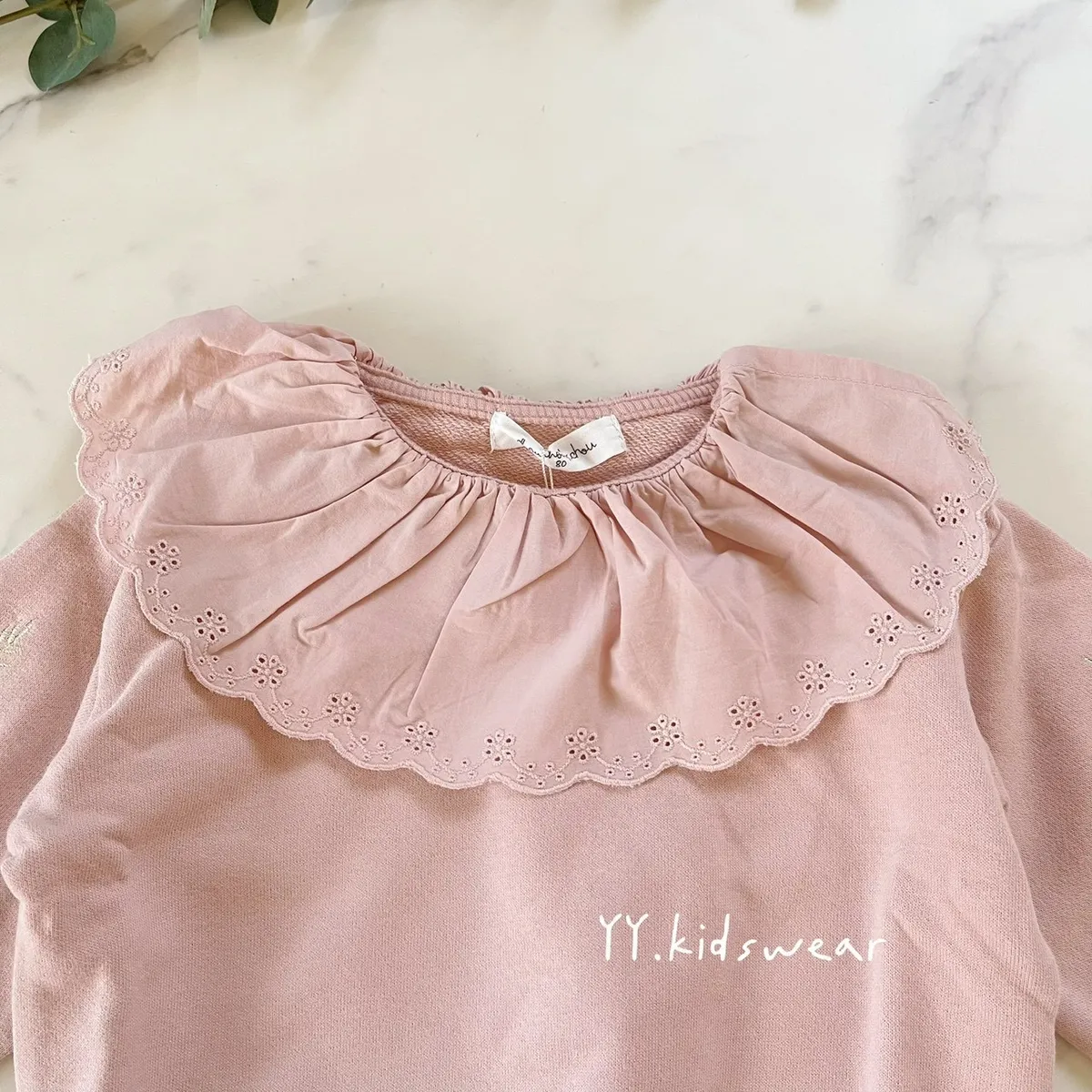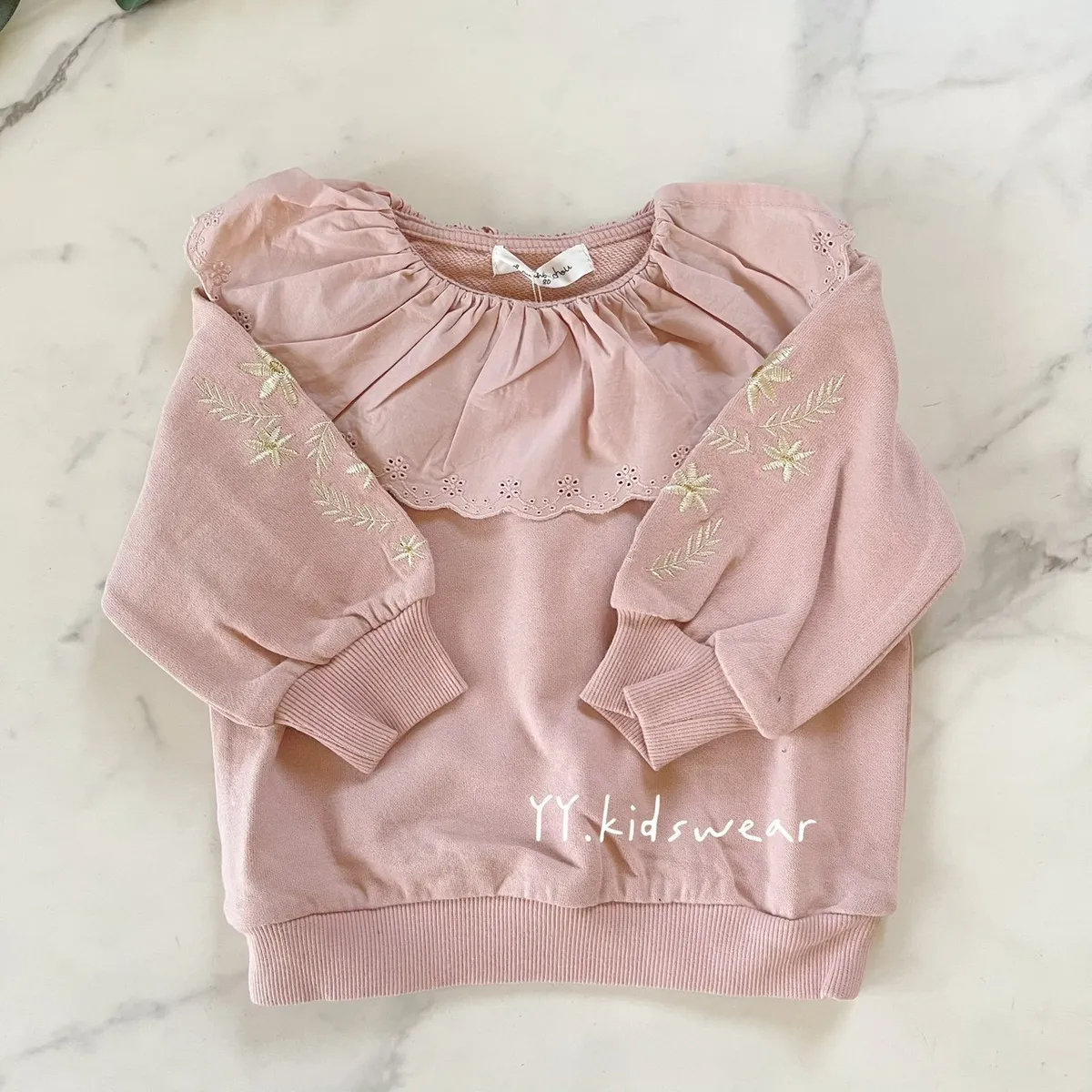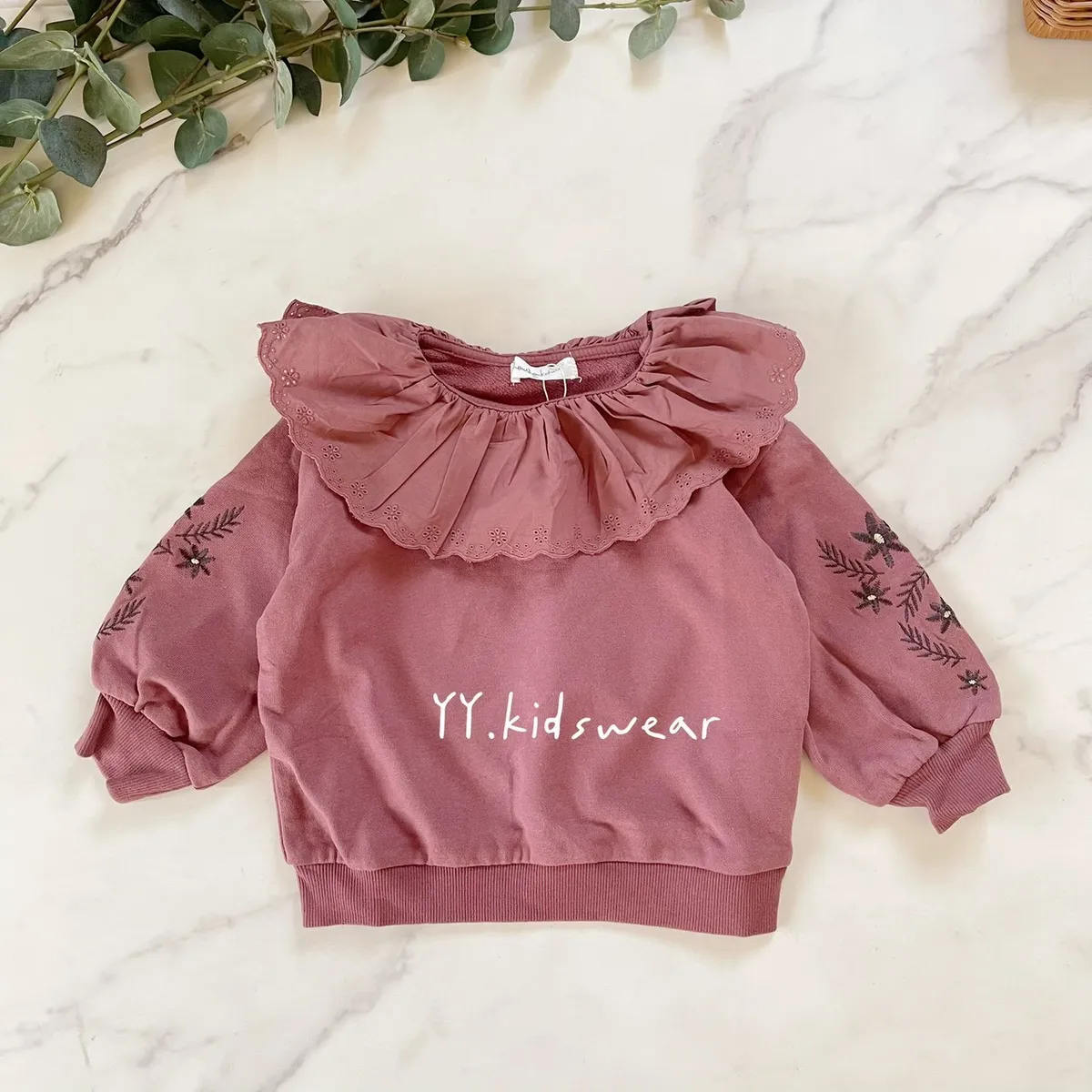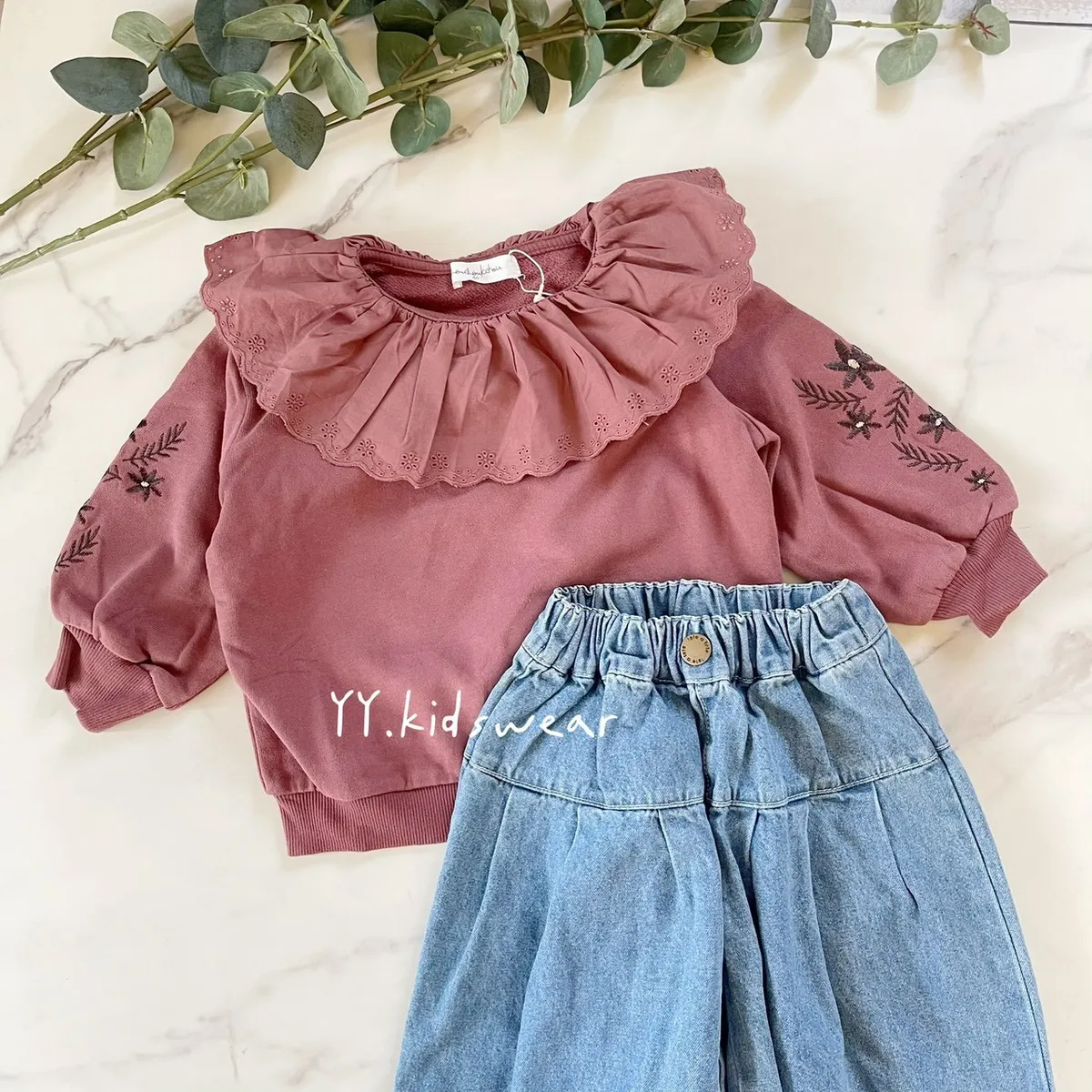 ✨優雅小女孩的秋日上衣,看似簡單,卻細節多多,純棉上衣, 結合立體刺繡花草刺繡,搭配大荷葉領翻翻, 上面還有雕花,細節滿滿、質感極佳~
