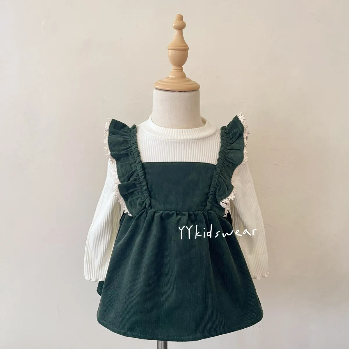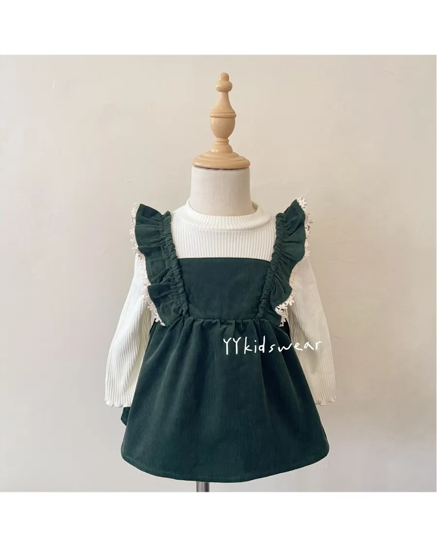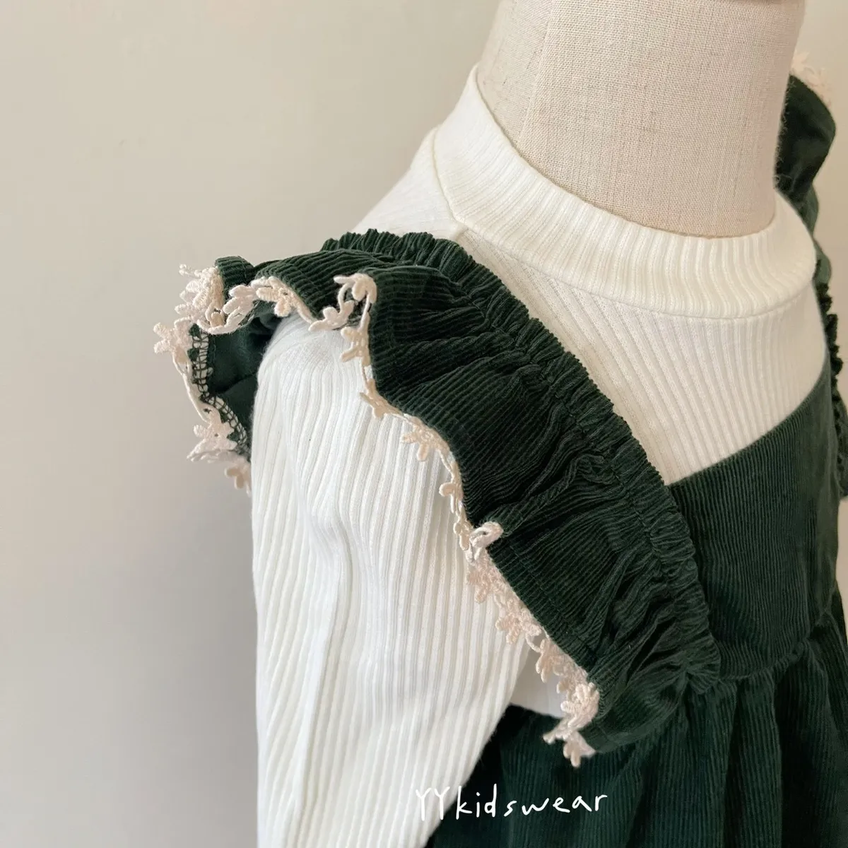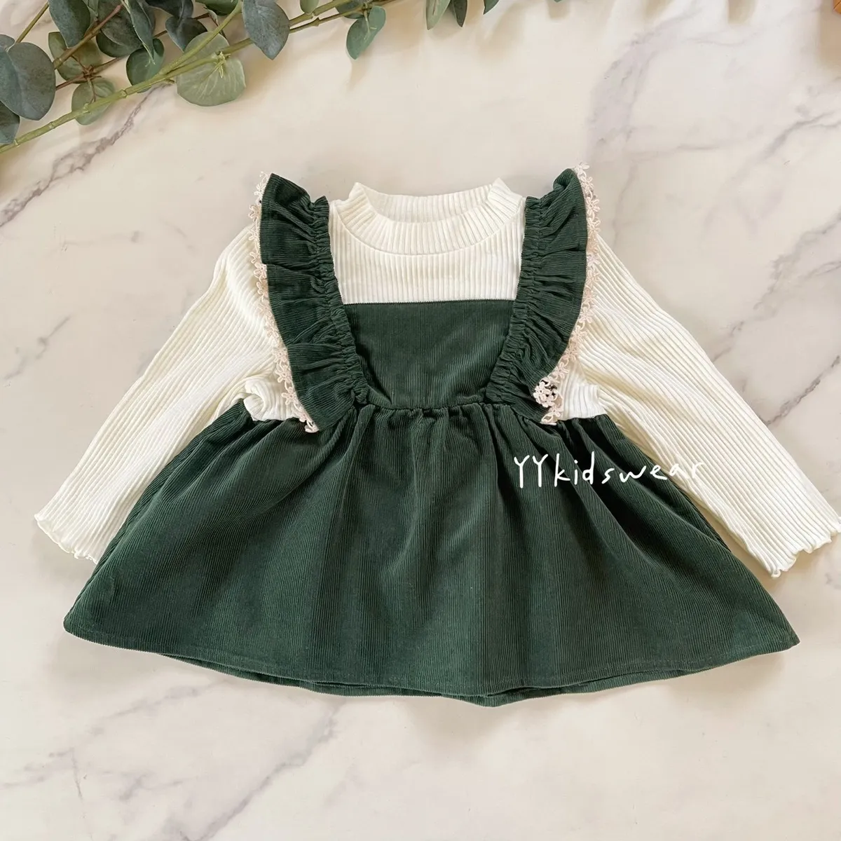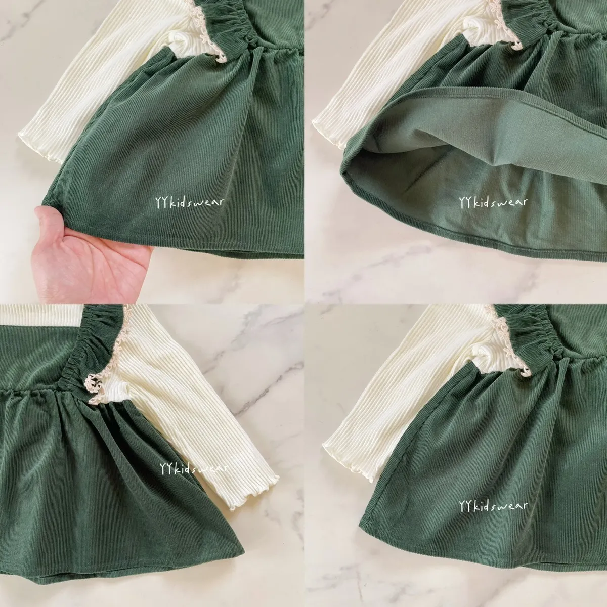 ✨這一款的顏色超級高級~暗綠色燈芯絨布料, 搭配優雅奶白色羅紋上衣,肩膀荷葉蕾絲滾邊,每一個角度都細膩又溫柔~仙氣十足~