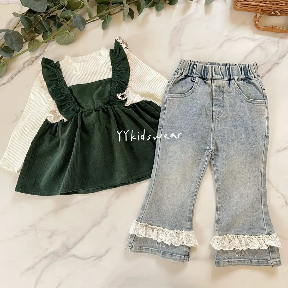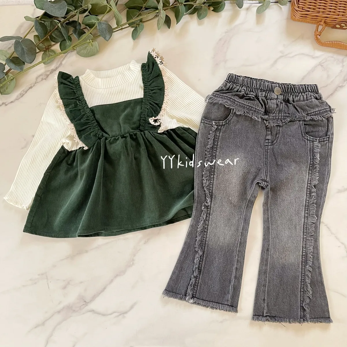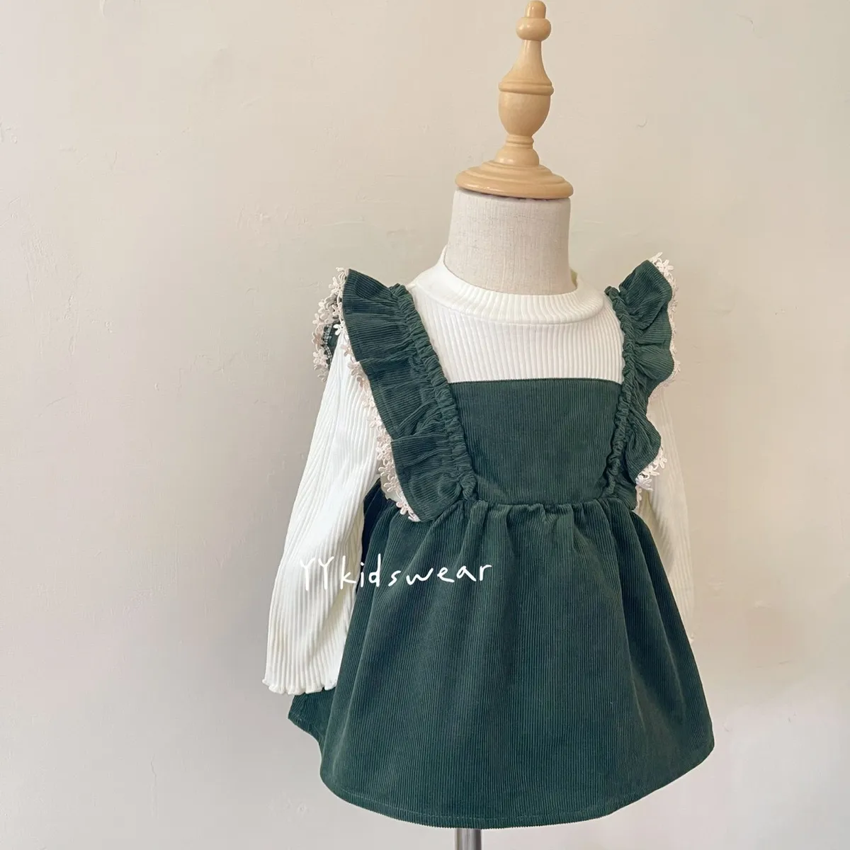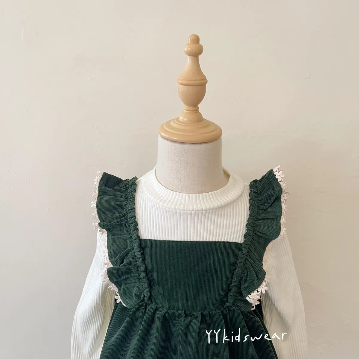 ✨這一款的顏色超級高級~暗綠色燈芯絨布料, 搭配優雅奶白色羅紋上衣,肩膀荷葉蕾絲滾邊,每一個角度都細膩又溫柔~仙氣十足~