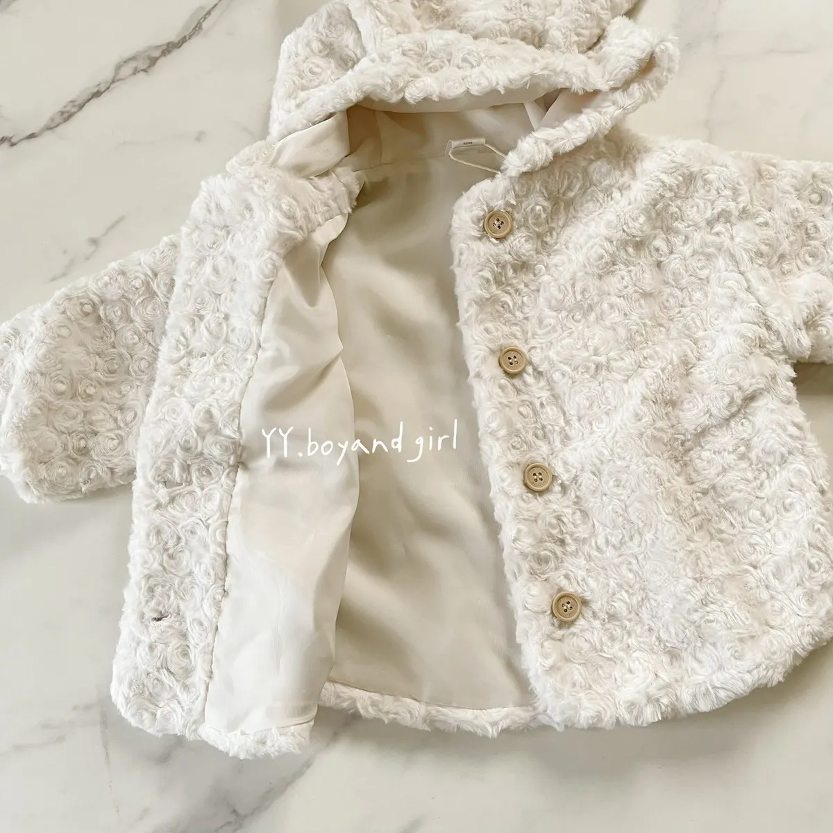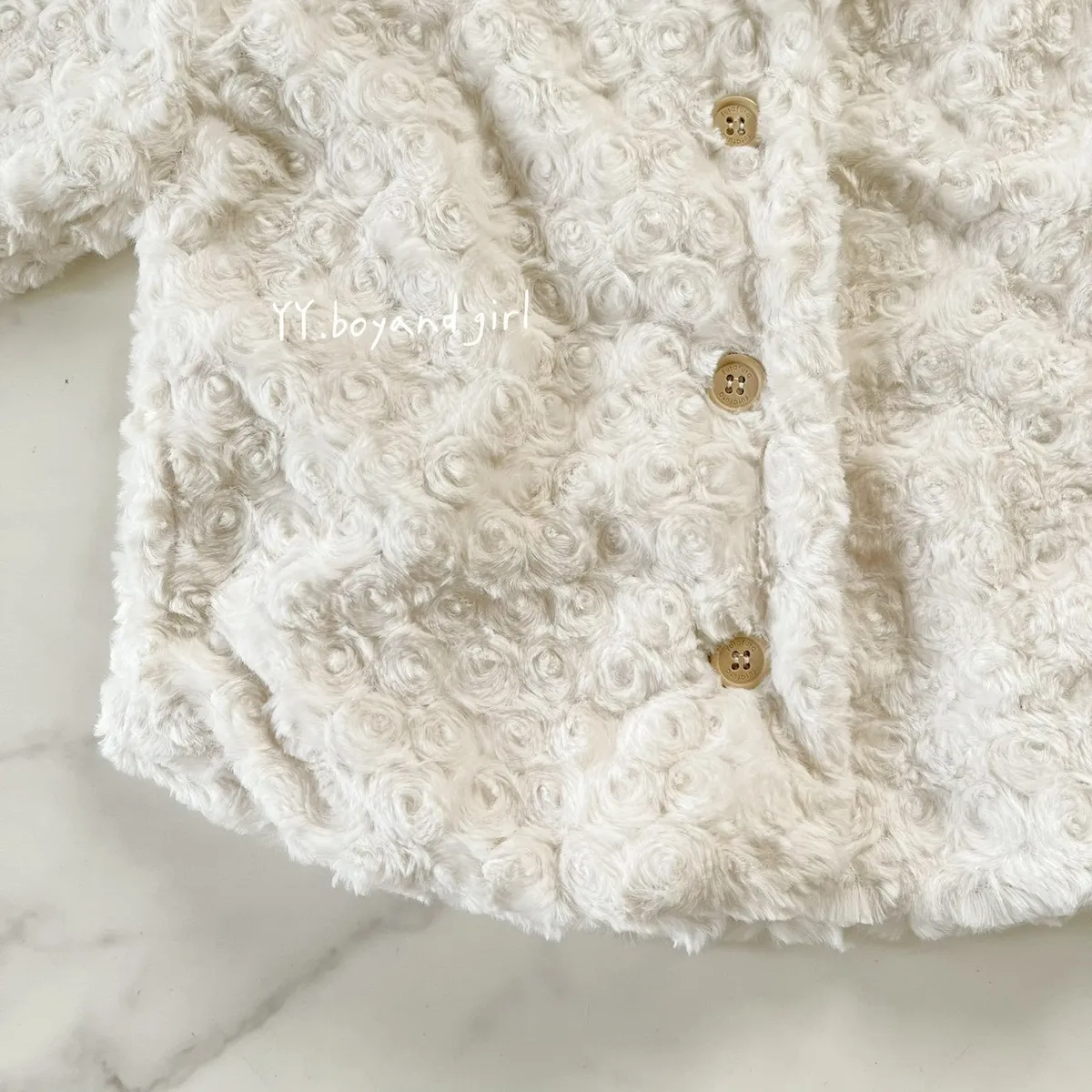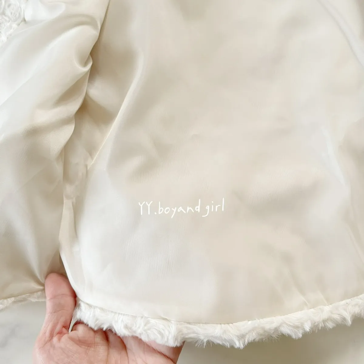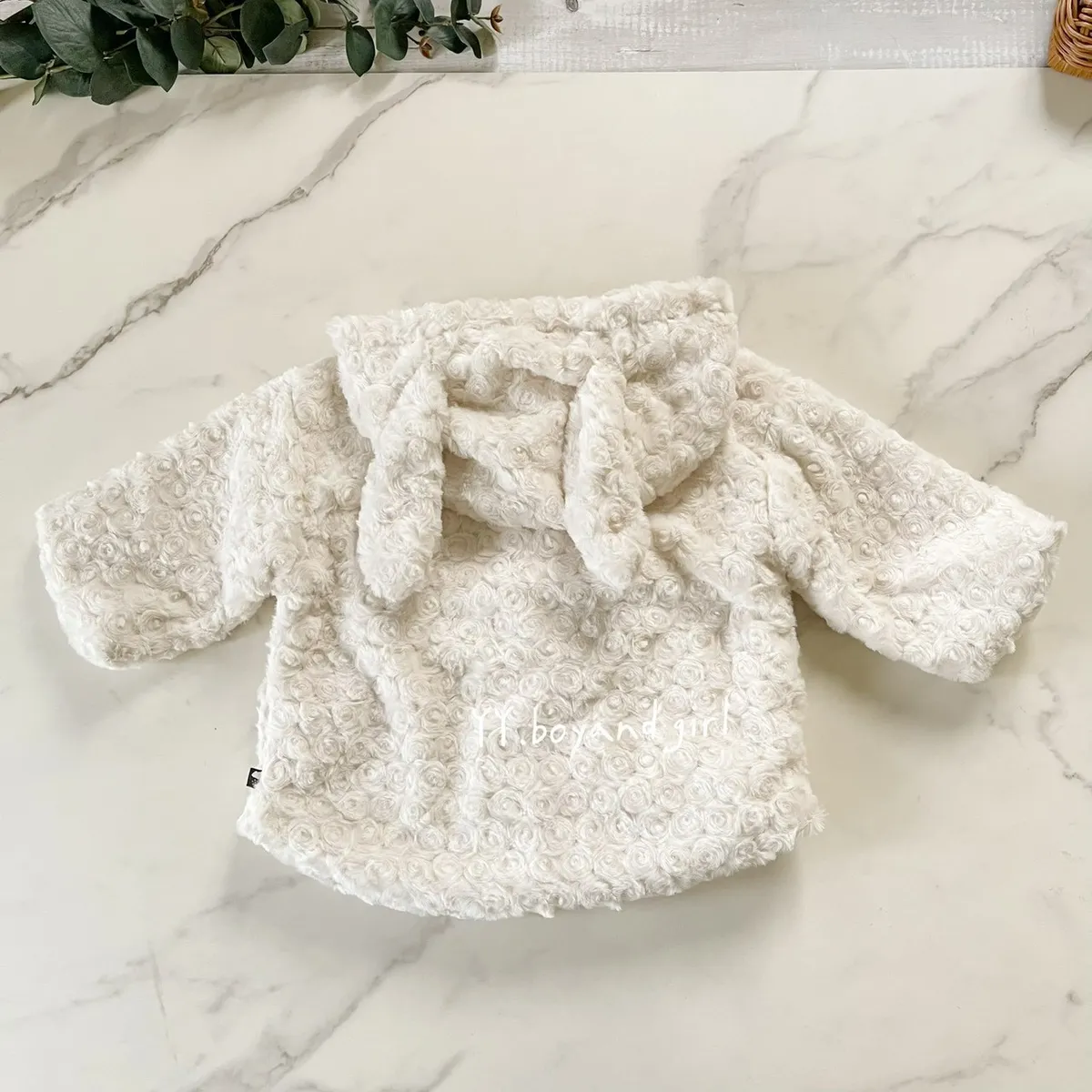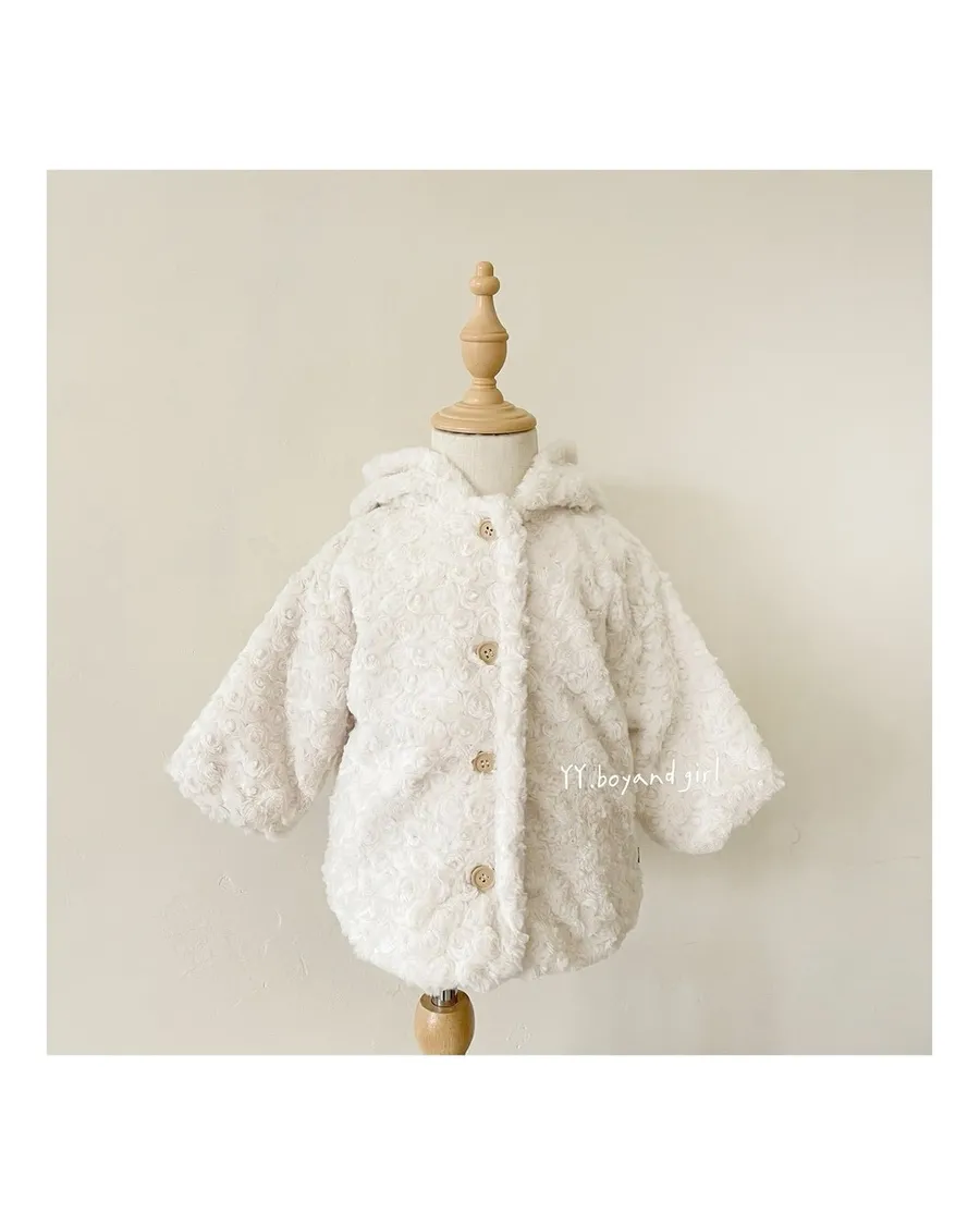 布料很高級, 摸起來很柔順舒服,附加價值是摸起來很有療癒感,絨毛的花紋很美, 仔細看會發現是玫瑰花紋,內裡走高級風, 質感很好,穿上身超級可愛, 很適合小女寶穿~