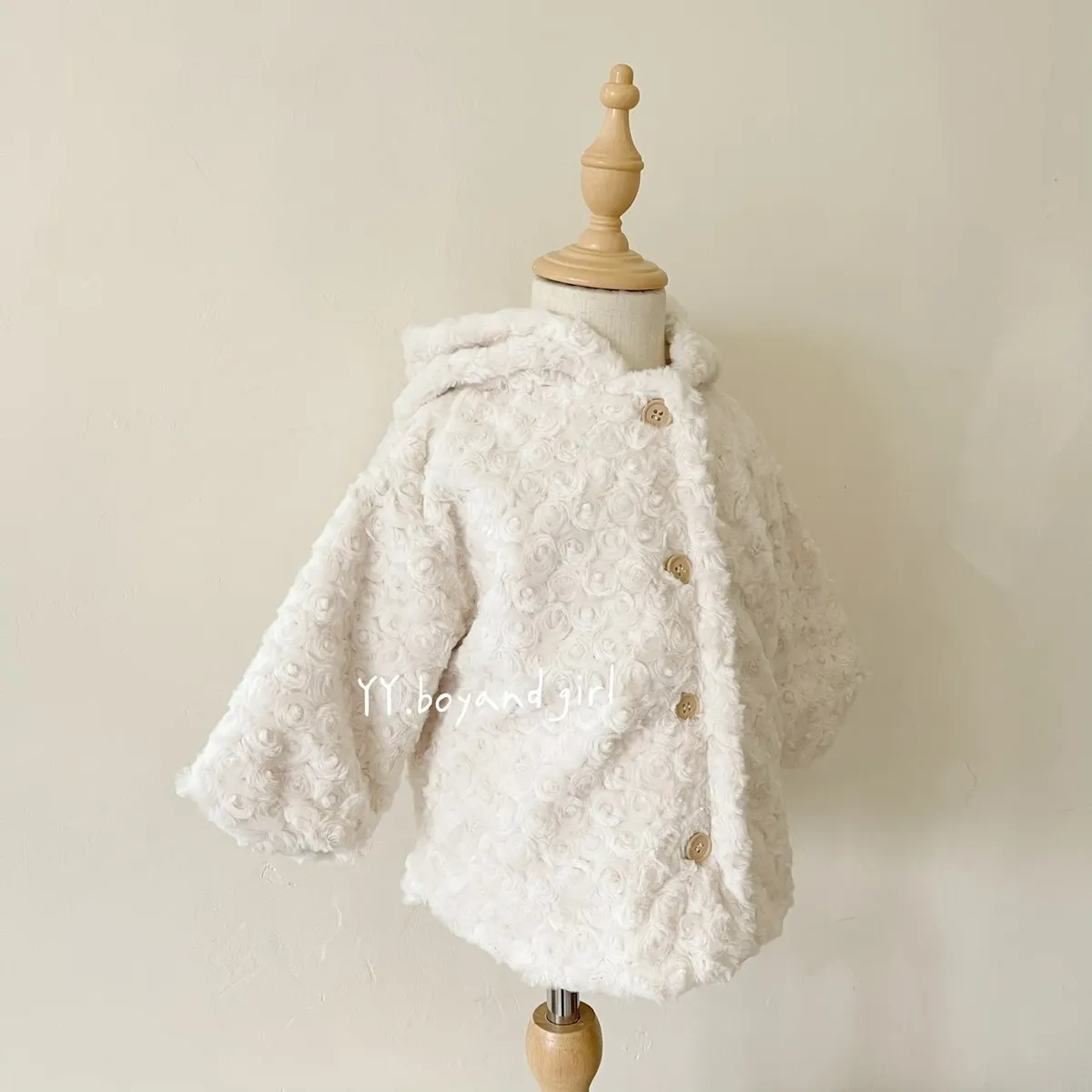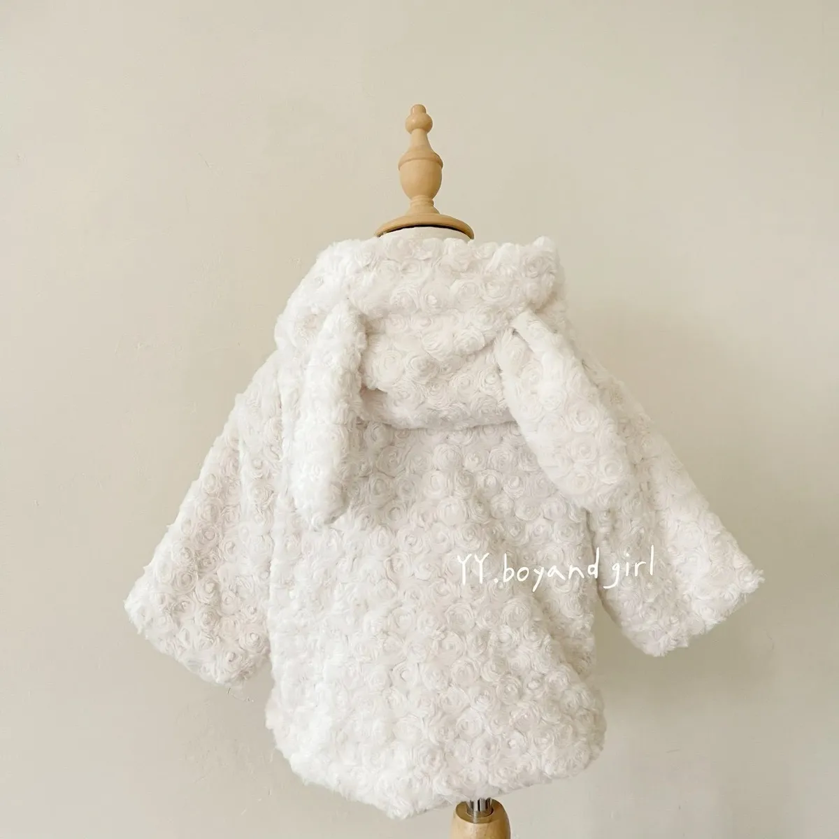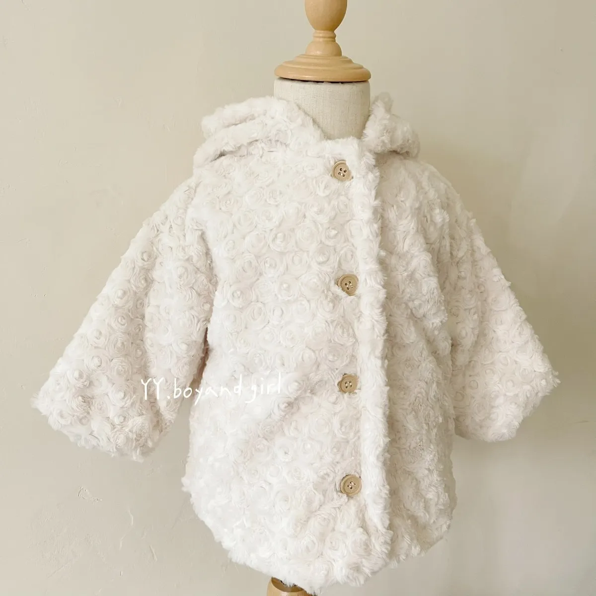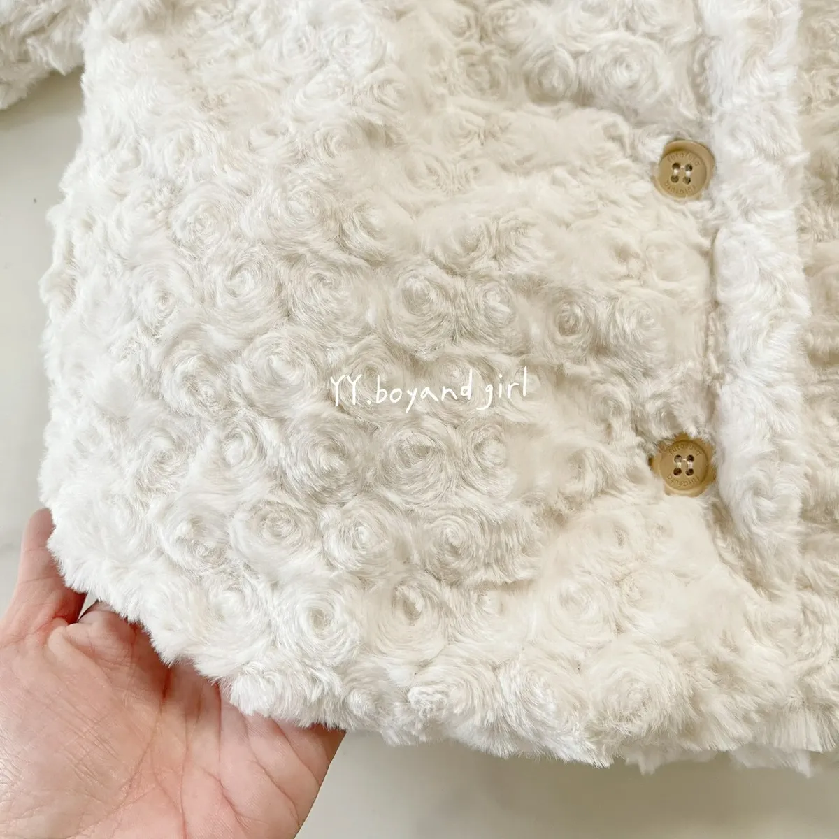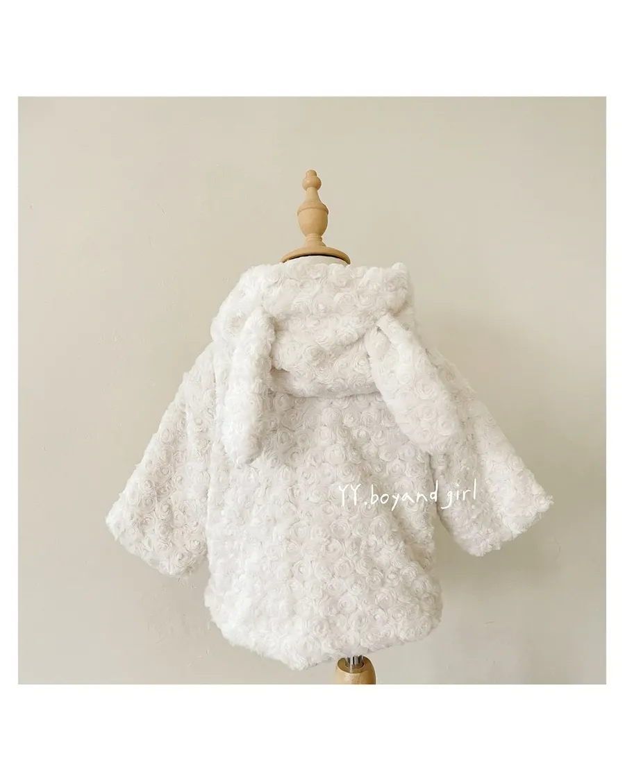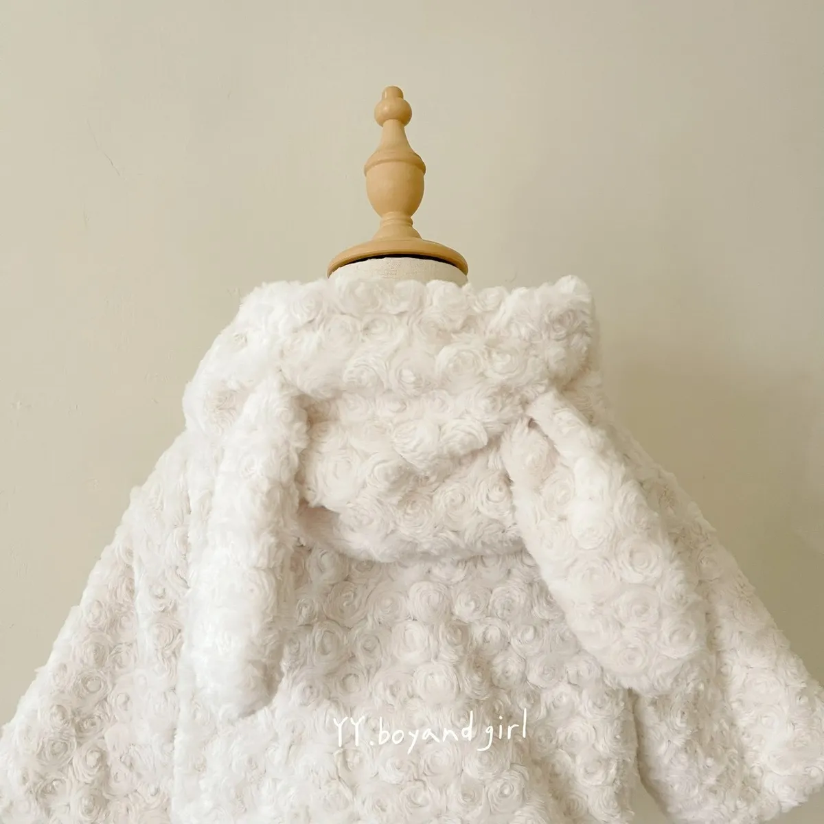 布料很高級, 摸起來很柔順舒服,附加價值是摸起來很有療癒感,絨毛的花紋很美, 仔細看會發現是玫瑰花紋,內裡走高級風, 質感很好,穿上身超級可愛, 很適合小女寶穿~