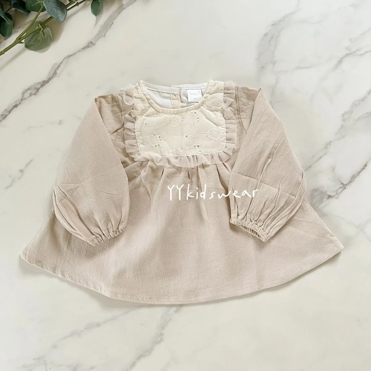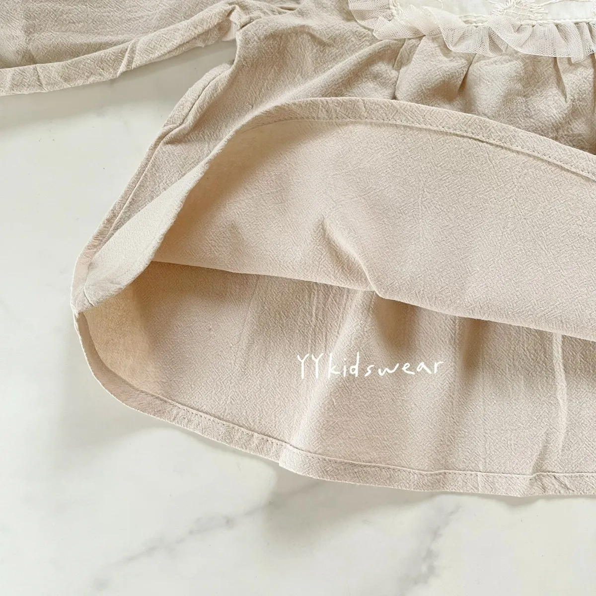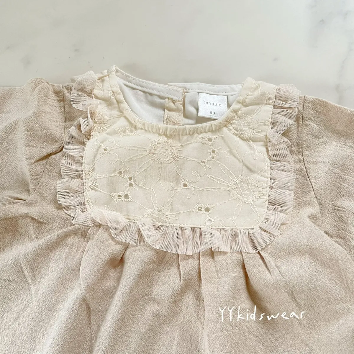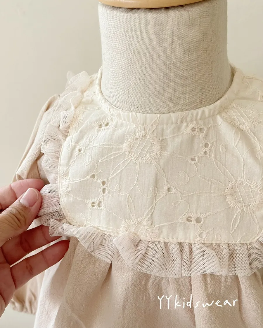 柔柔的杏奶色搭配立體刺繡蕾絲方領,