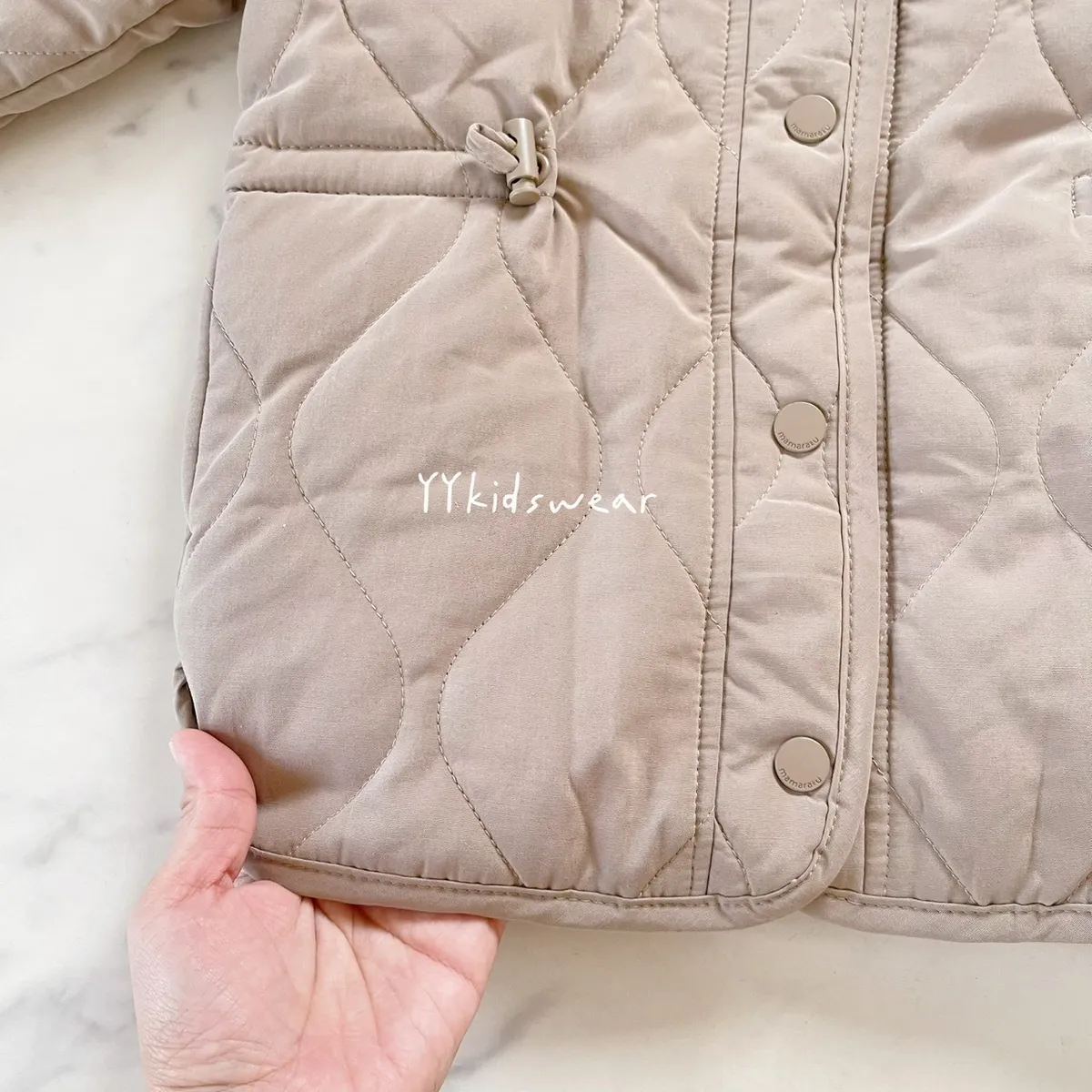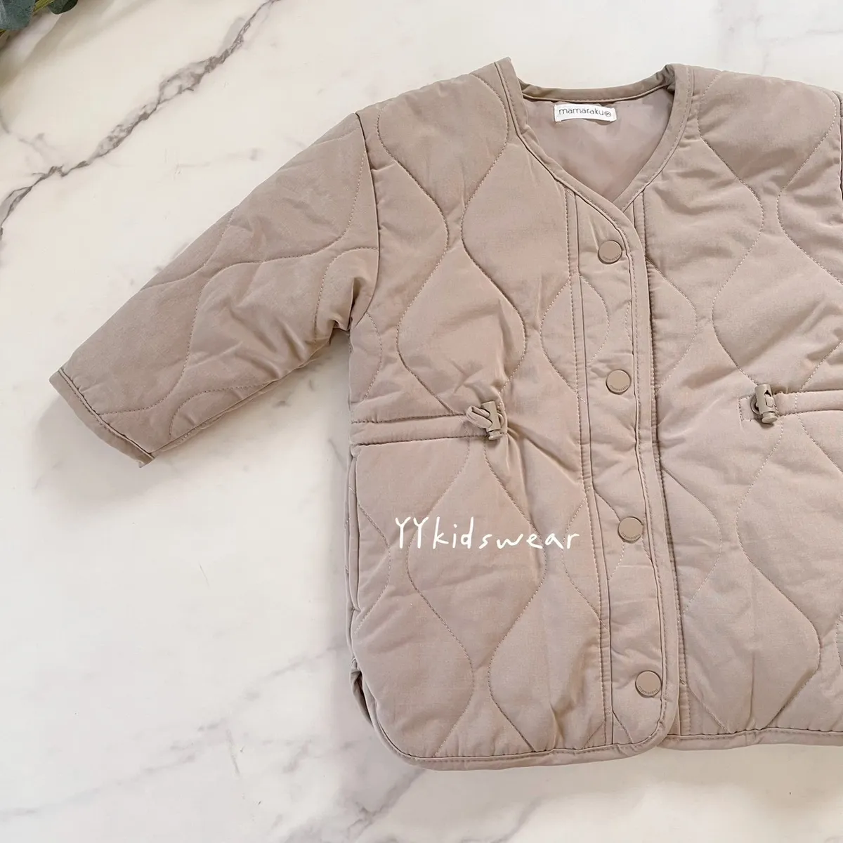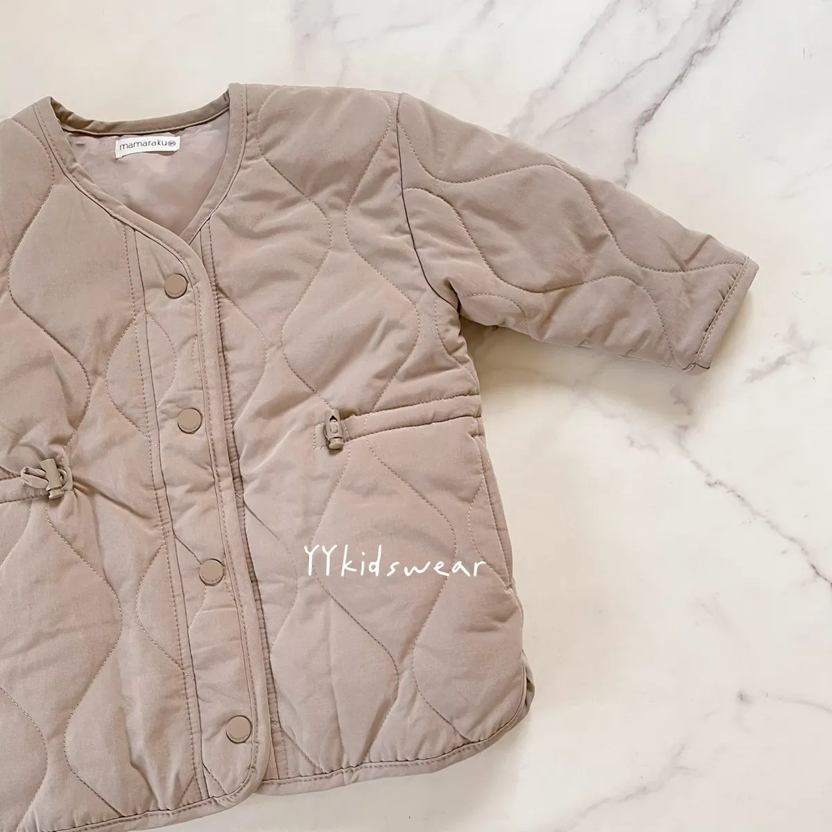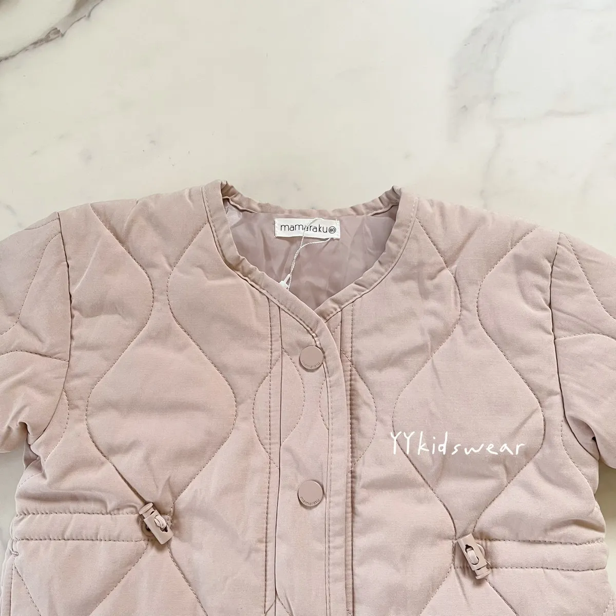 溫柔色系 奶霧粉/溫柔奶茶+波浪鋪棉線條,簡單設計, 顯氣質外套鋪棉、布料柔軟、穿起來不厚重,兩側有抽繩設計, 拉緊顯腰身, 還有兩個小口袋,實用度滿滿材質: 表布60%棉+40%尼龍裡布:94%聚酯纖維+6%棉彈力: 無