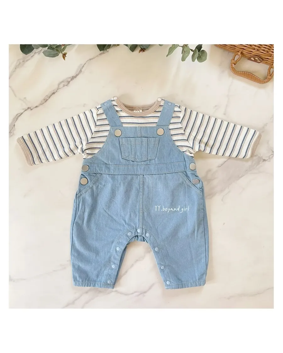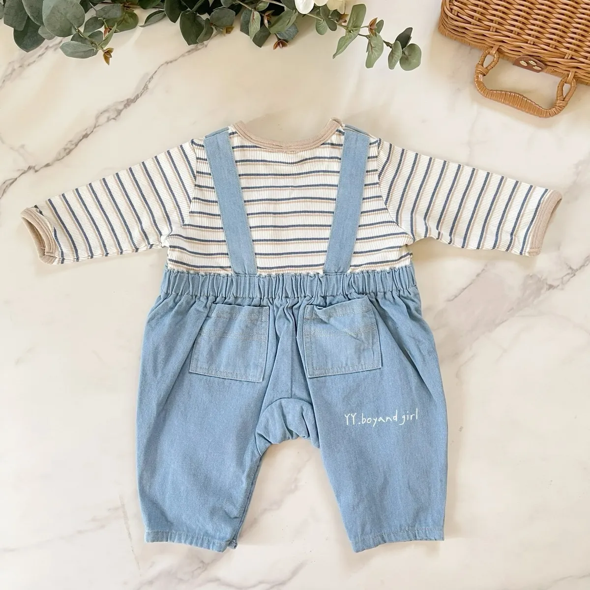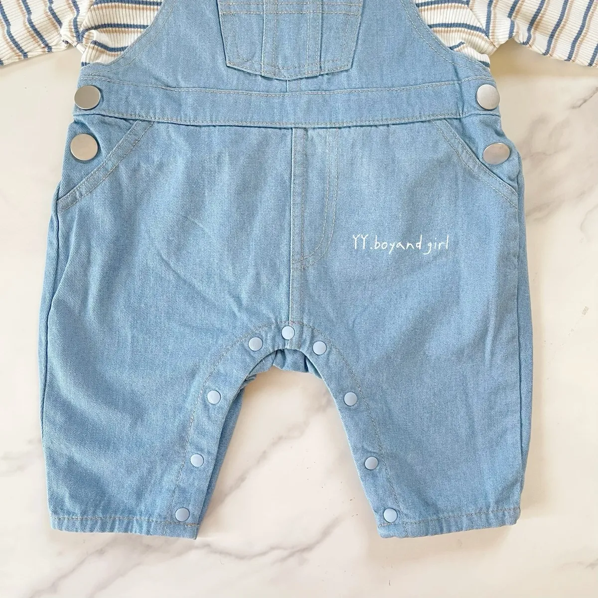 中性款,男女寶都可穿純棉材質,條紋配牛仔的造型很時髦,這件的質感很好,假兩件吊帶造型很方便, 適合小寶寶的外出服~