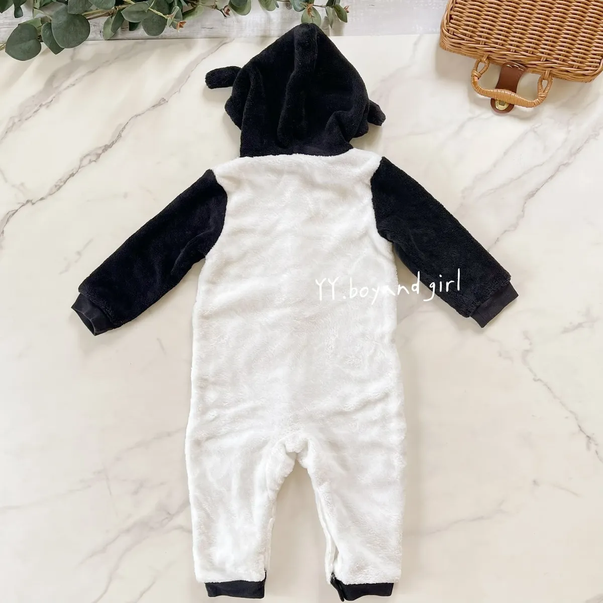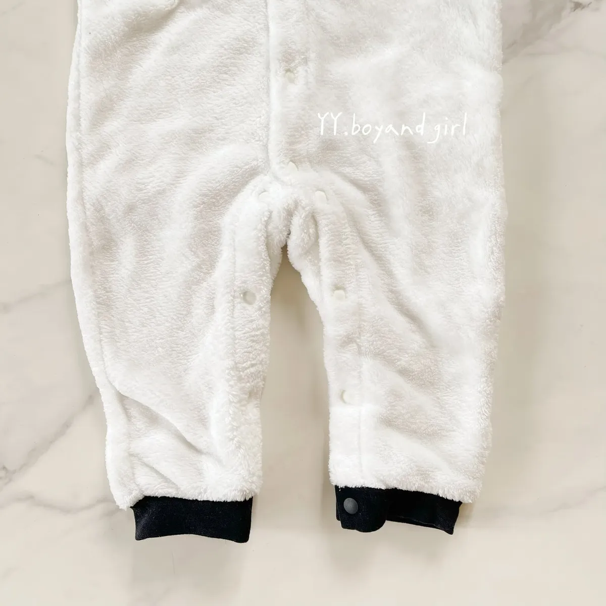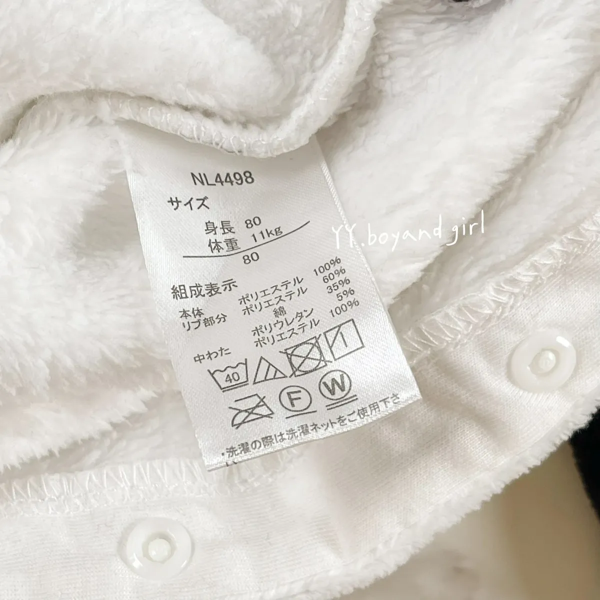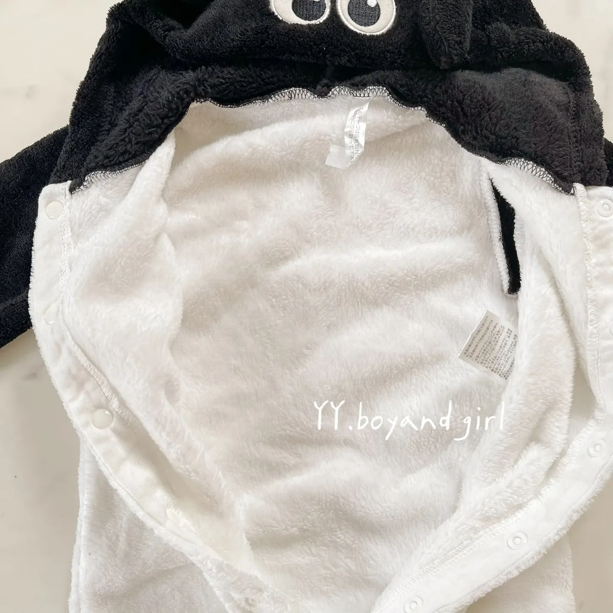 日單中性款黑白色小羊珊瑚絨保暖連帽爬服(內刷毛)-80cm