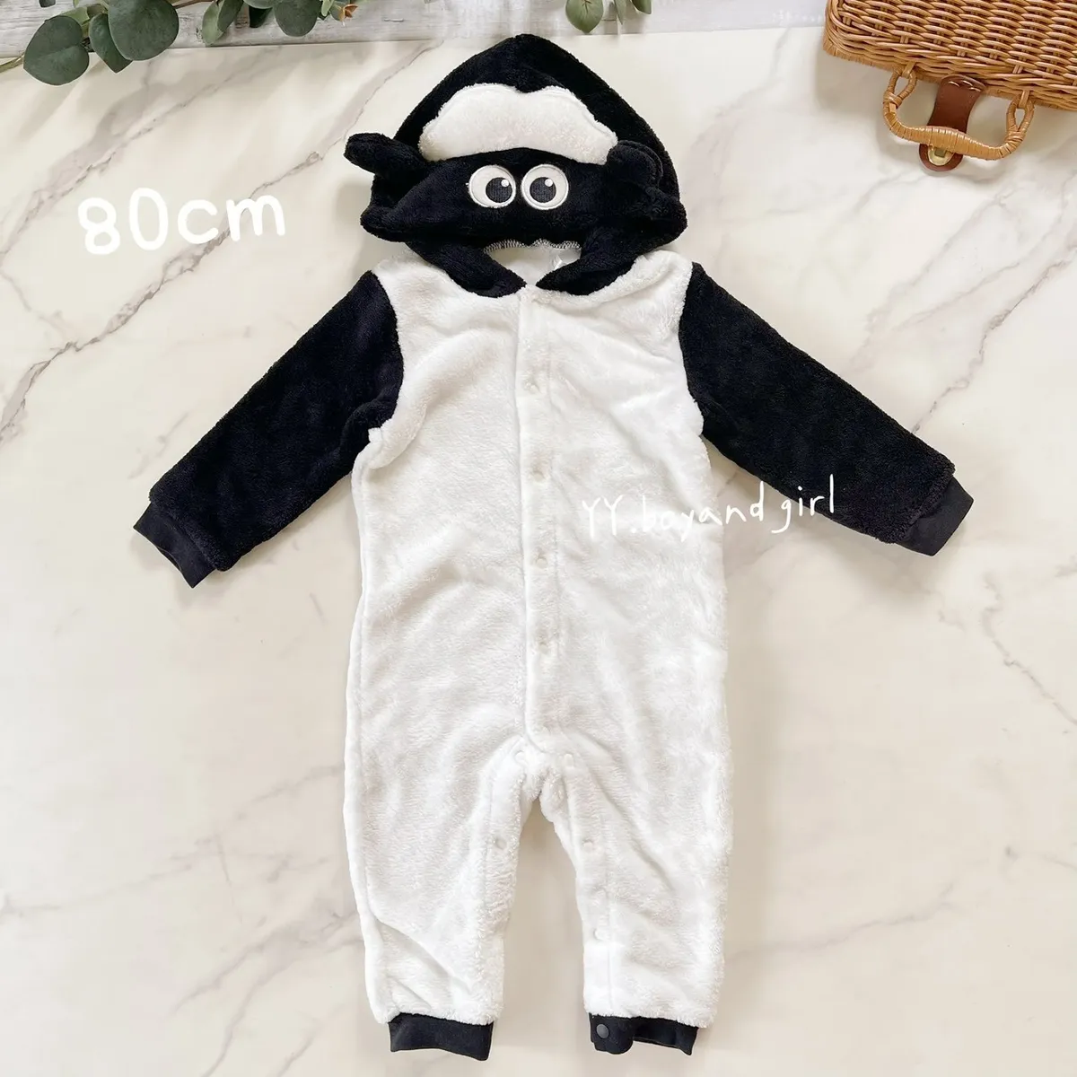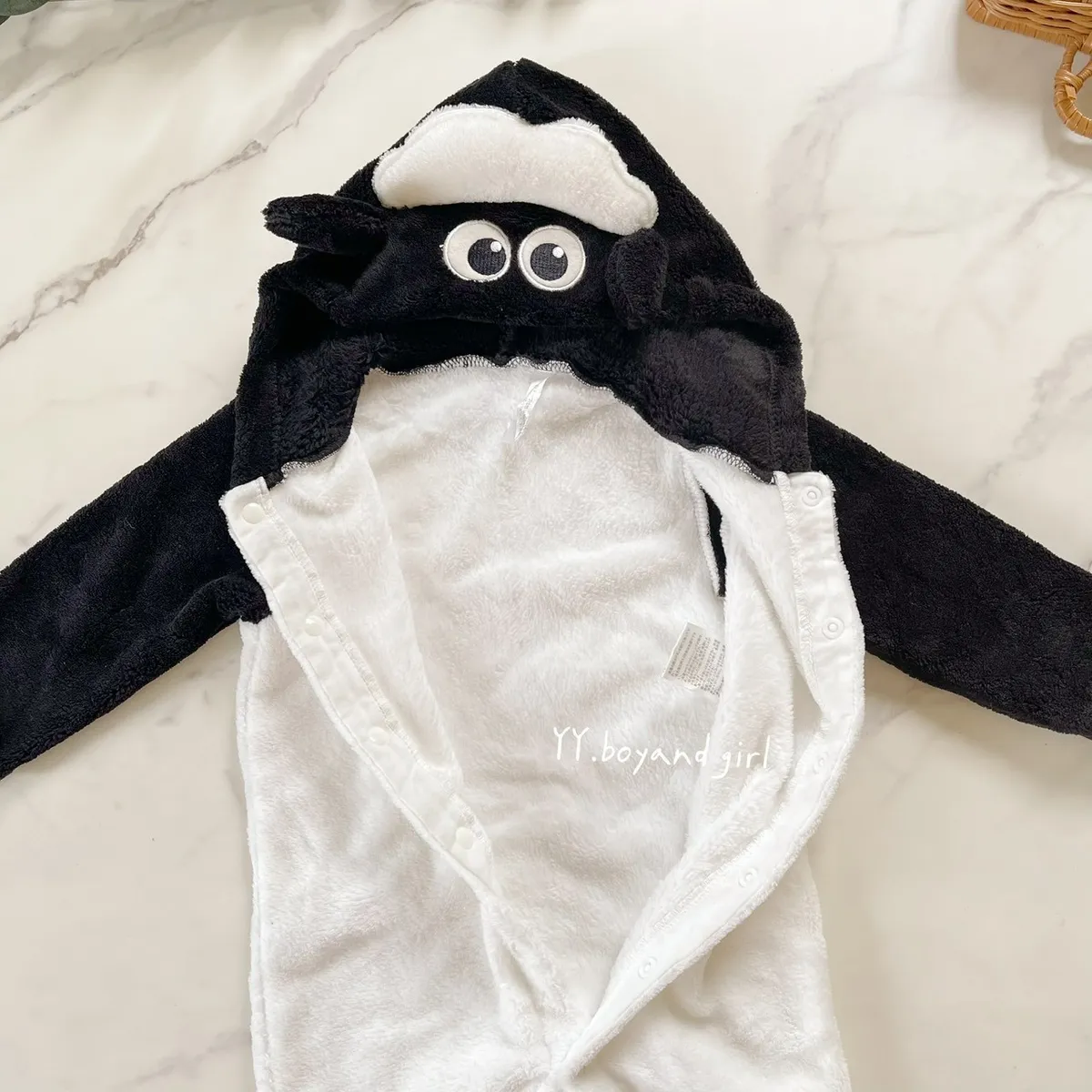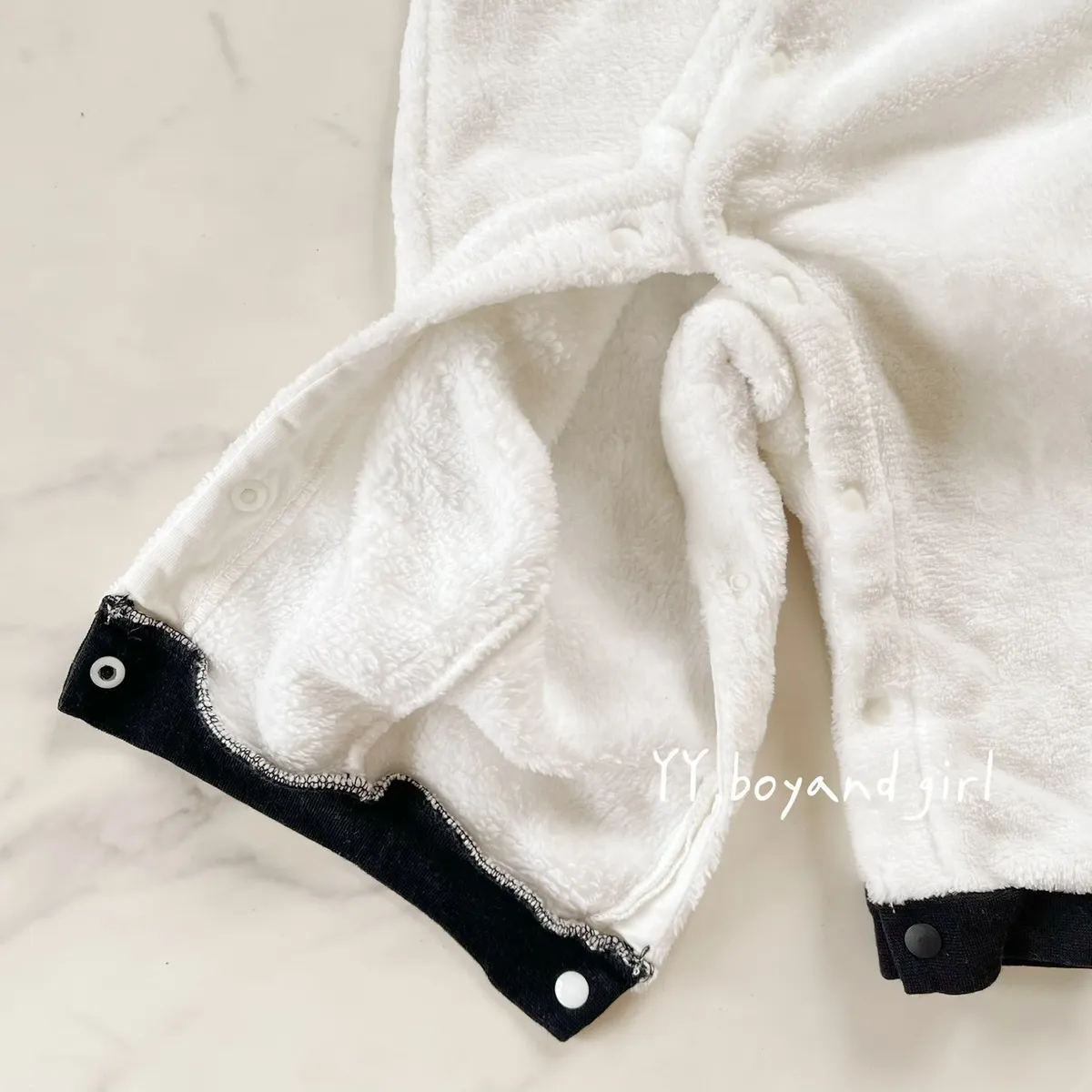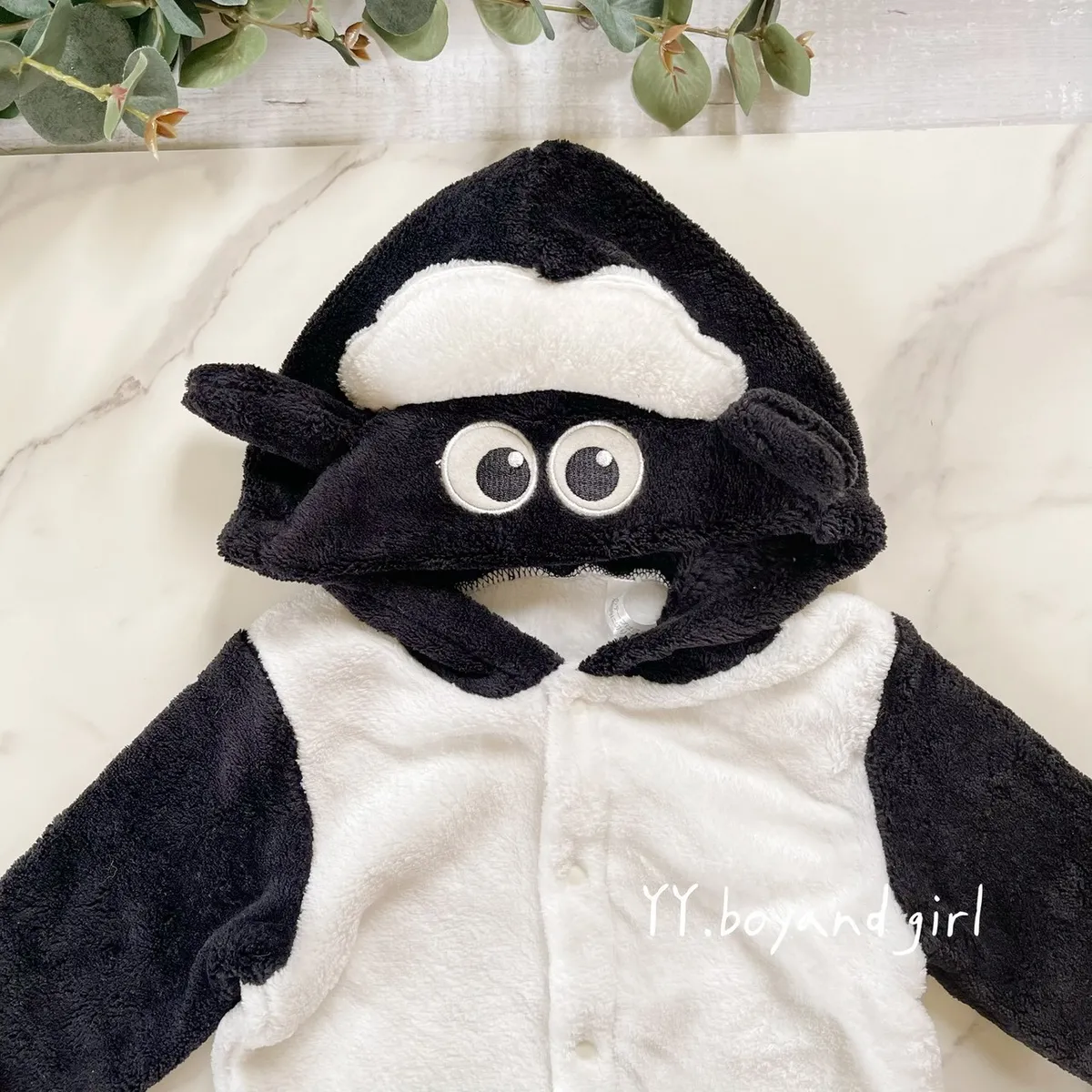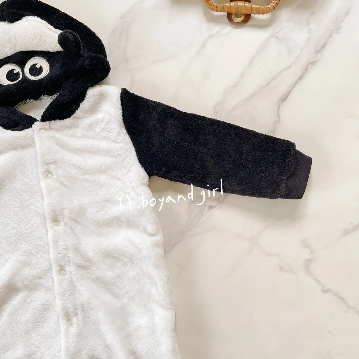 日單中性款黑白色小羊珊瑚絨保暖連帽爬服(內刷毛)-80cm