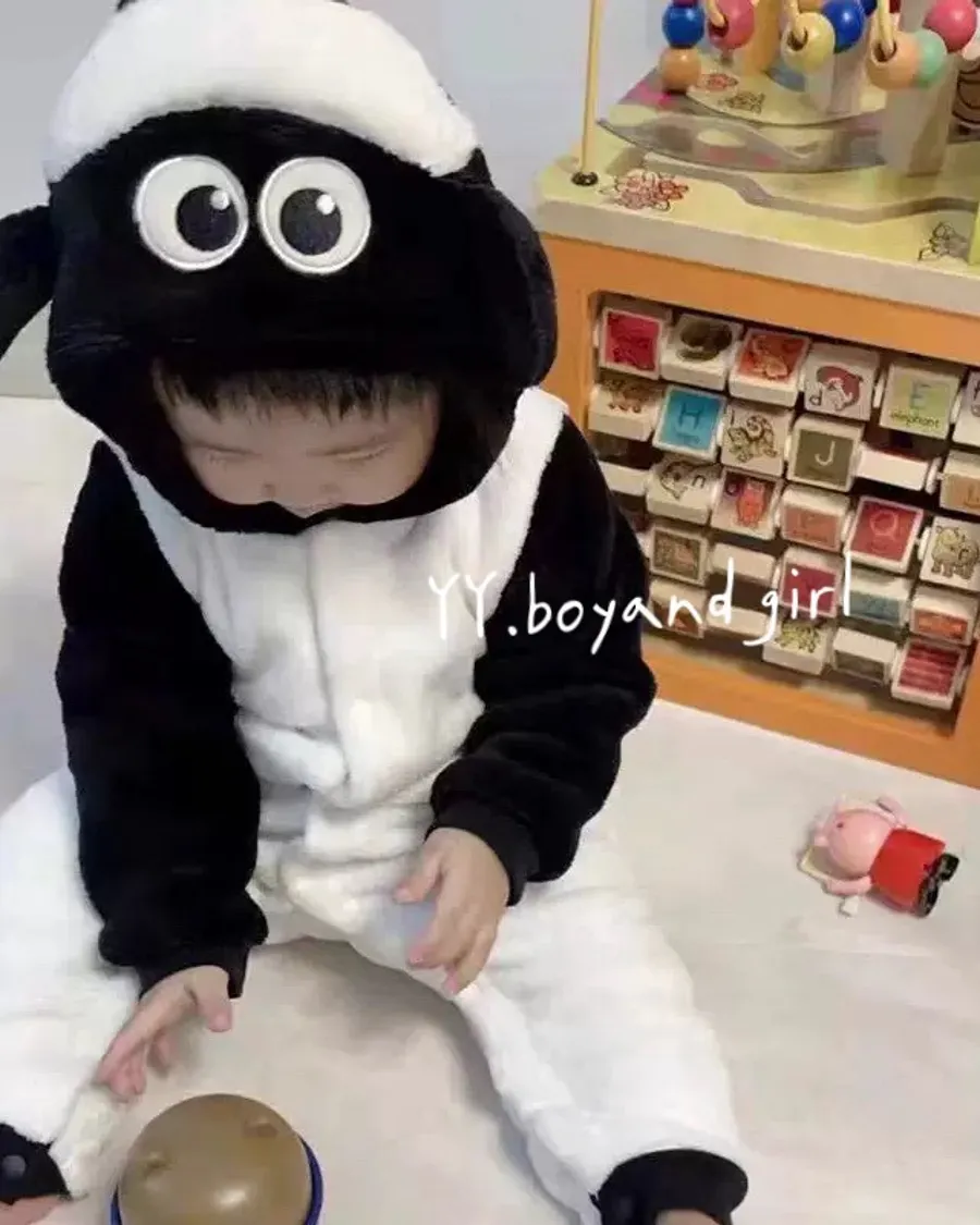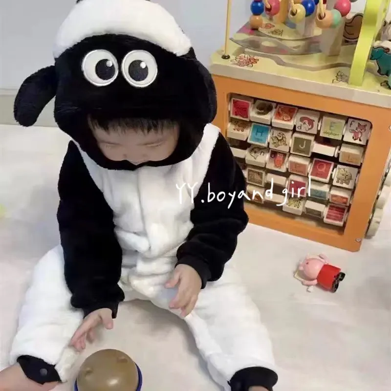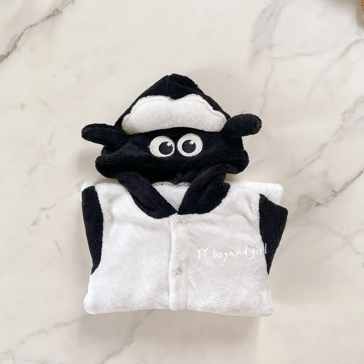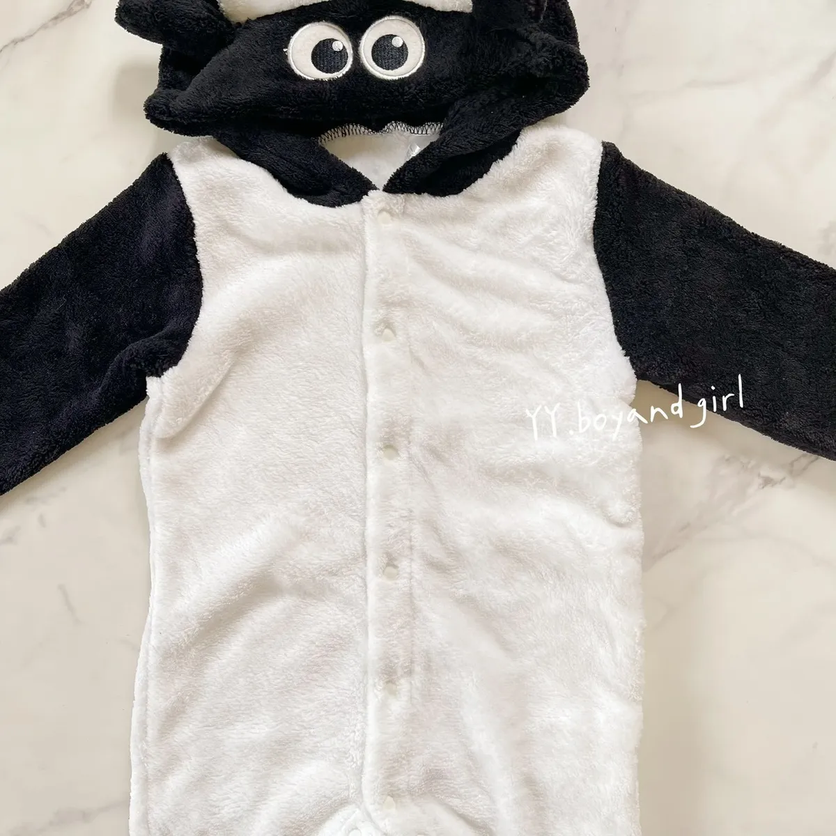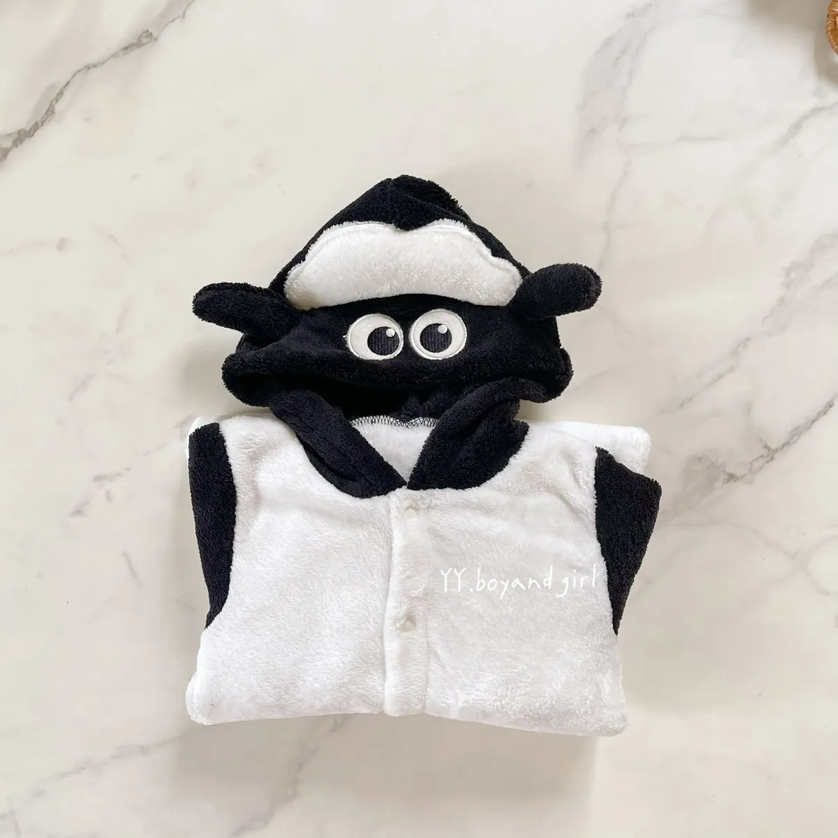 日單中性款黑白色小羊珊瑚絨保暖連帽爬服(內刷毛)-80cm
