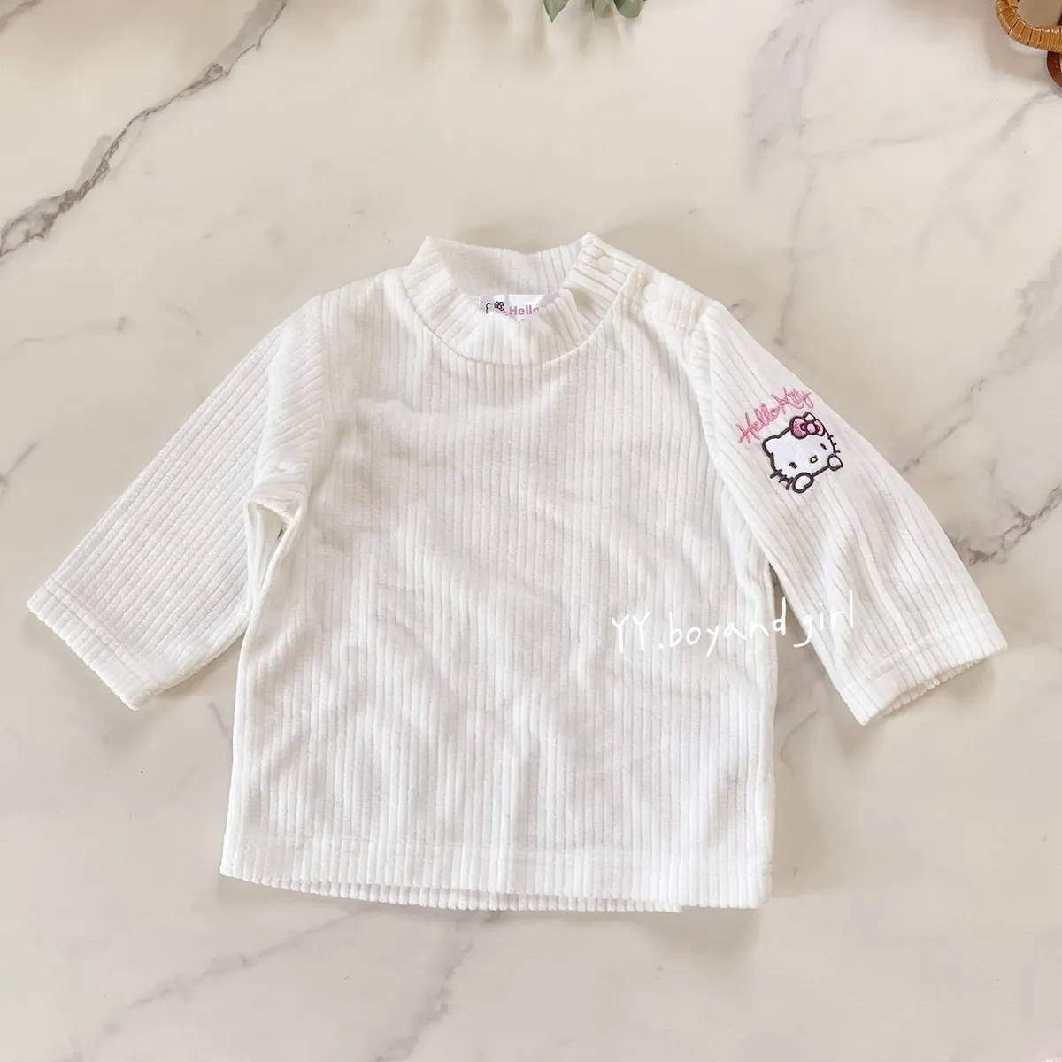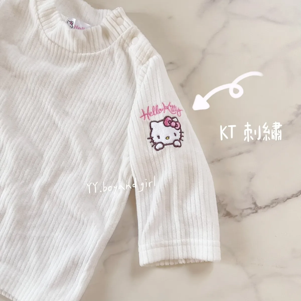 右手臂上面有KT 刺繡的圖案,