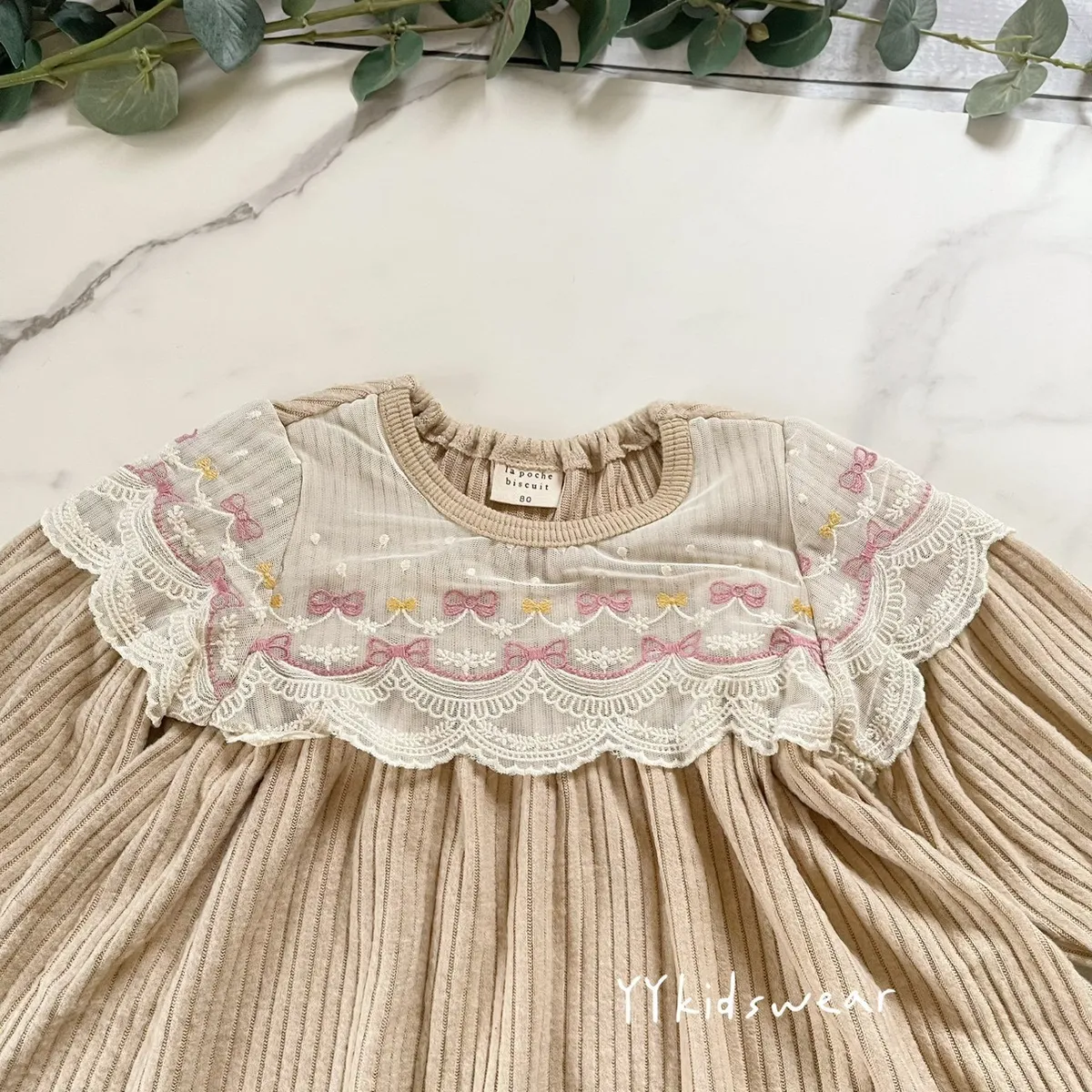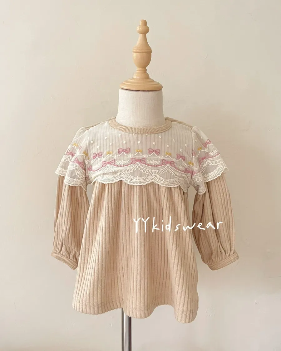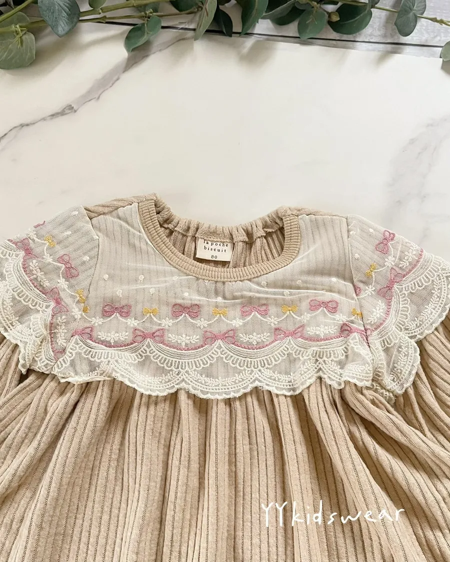 表布磨髦感, 上身拼接細緻蕾絲、粉嫩小蝴蝶結、點點珍珠刺繡,