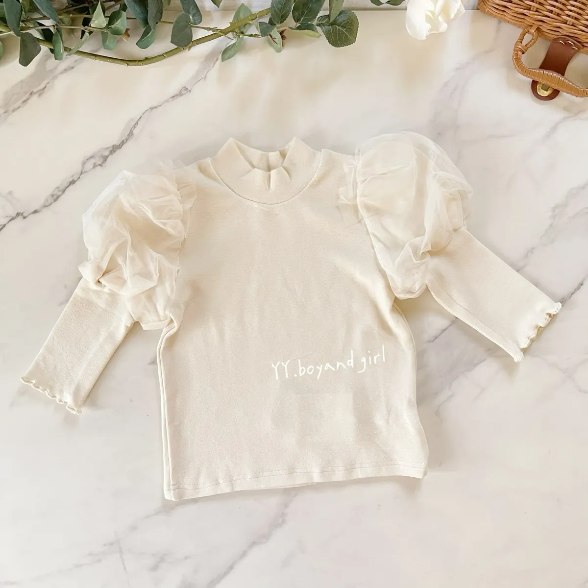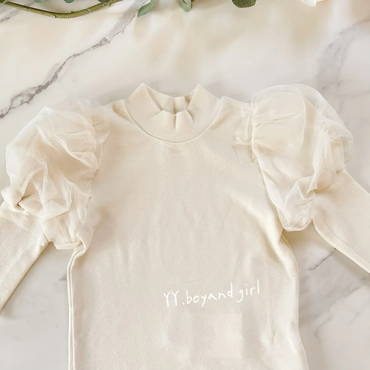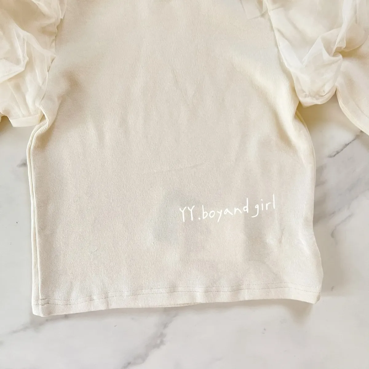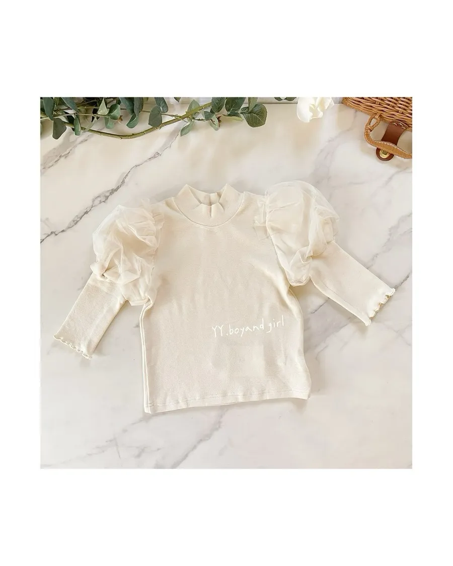 奶油白上衣搭配澎澎紗袖,