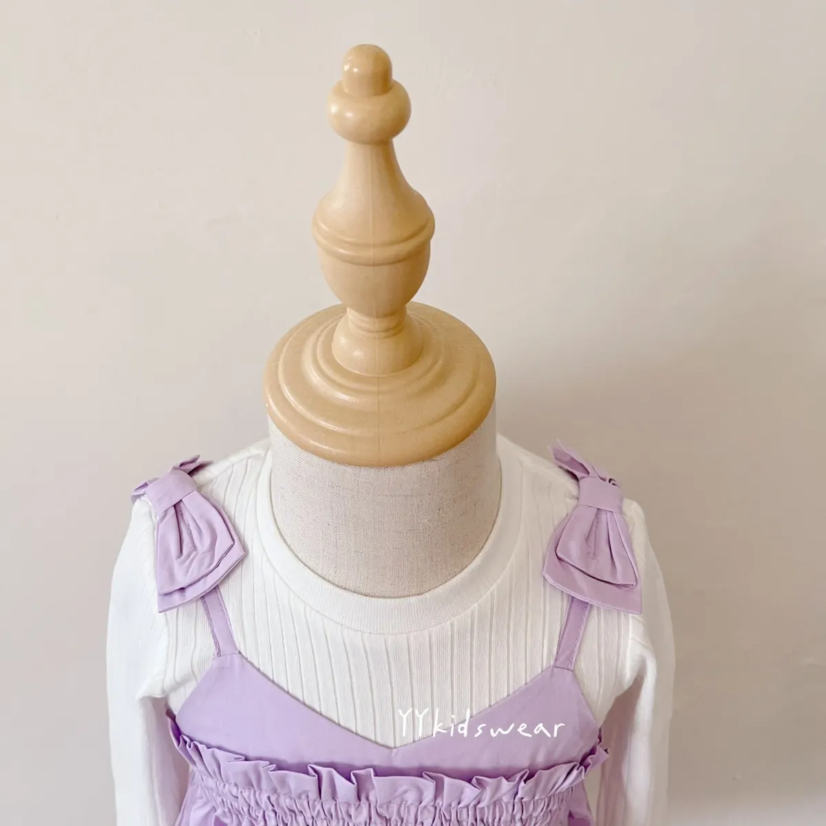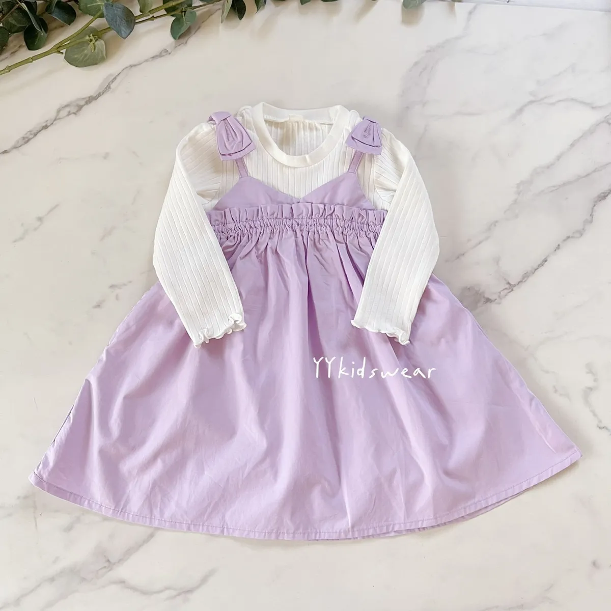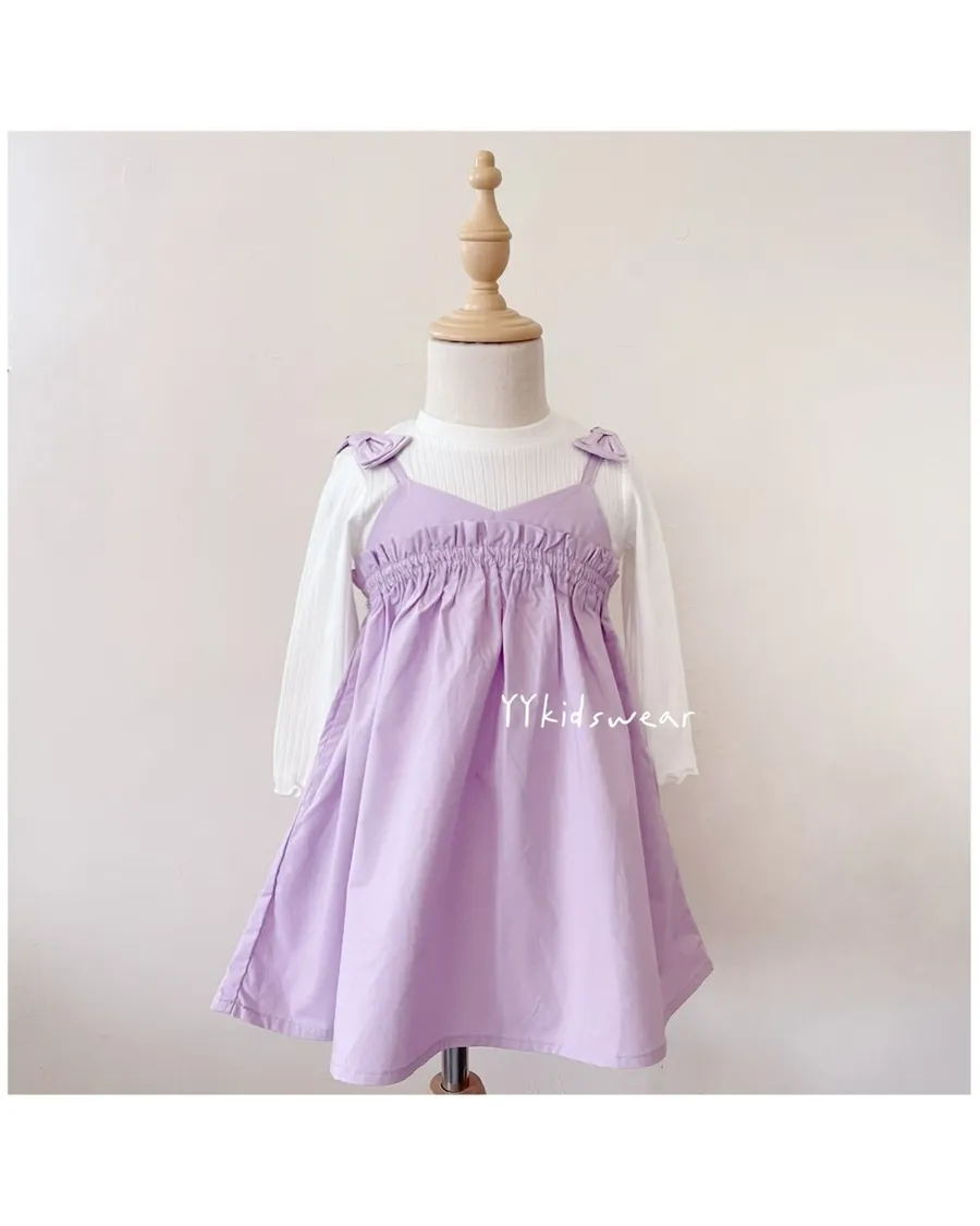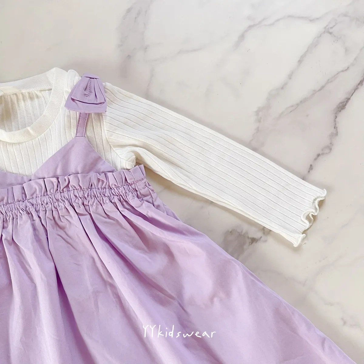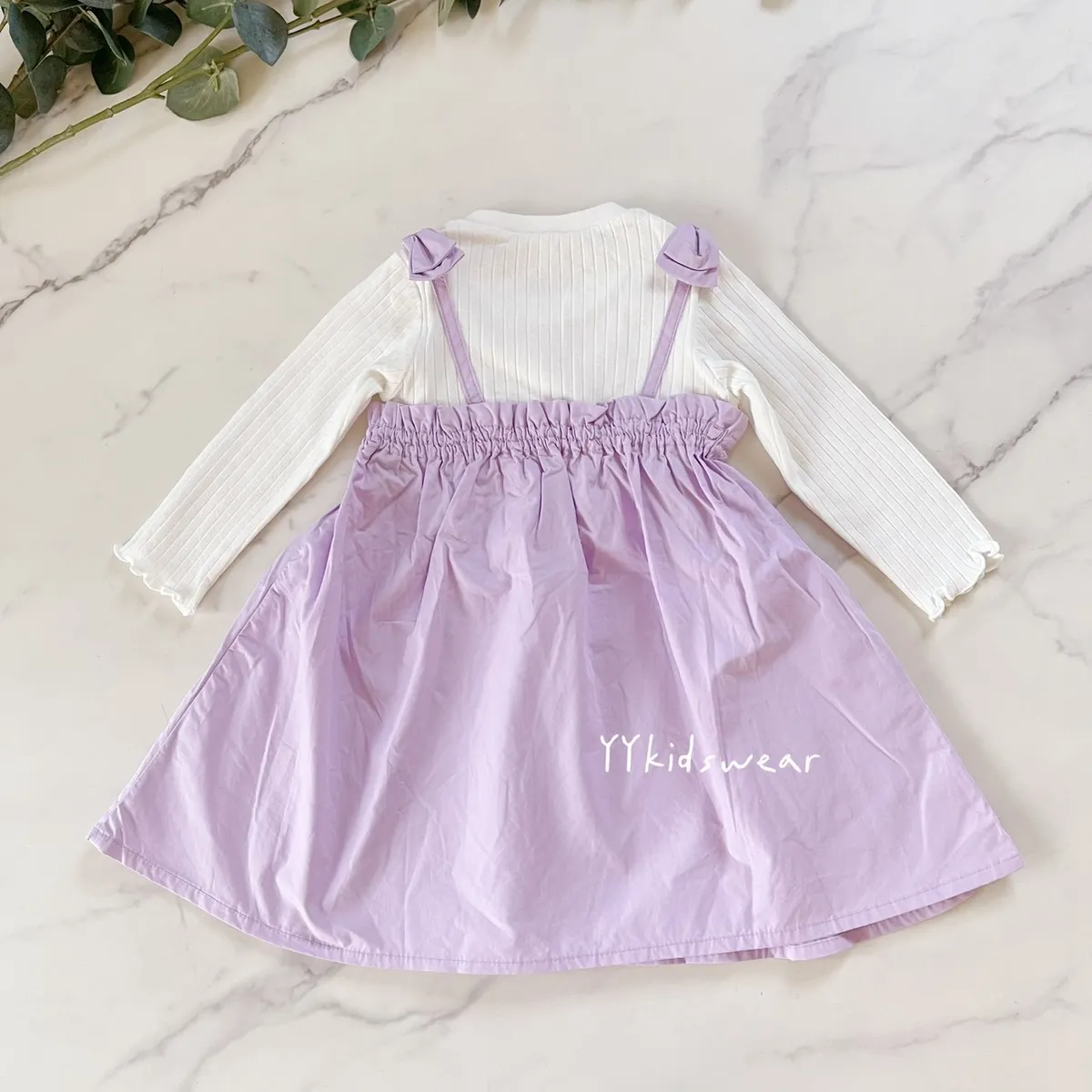 溫柔的紫藤色 💜假兩件的吊帶設計搭配肩上立體蝴蝶結,胸前細緻抓皺,讓裙擺自然垂墜。內搭白色坑條長袖上衣, 洋裝左右兩側有口袋, 甜美中帶點小大人感, 整件散發出高級感的小洋裝~ 彈力: 白色打底: 有| 紫色洋裝:無