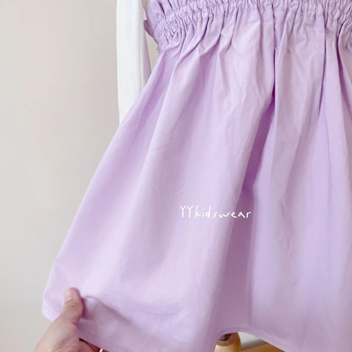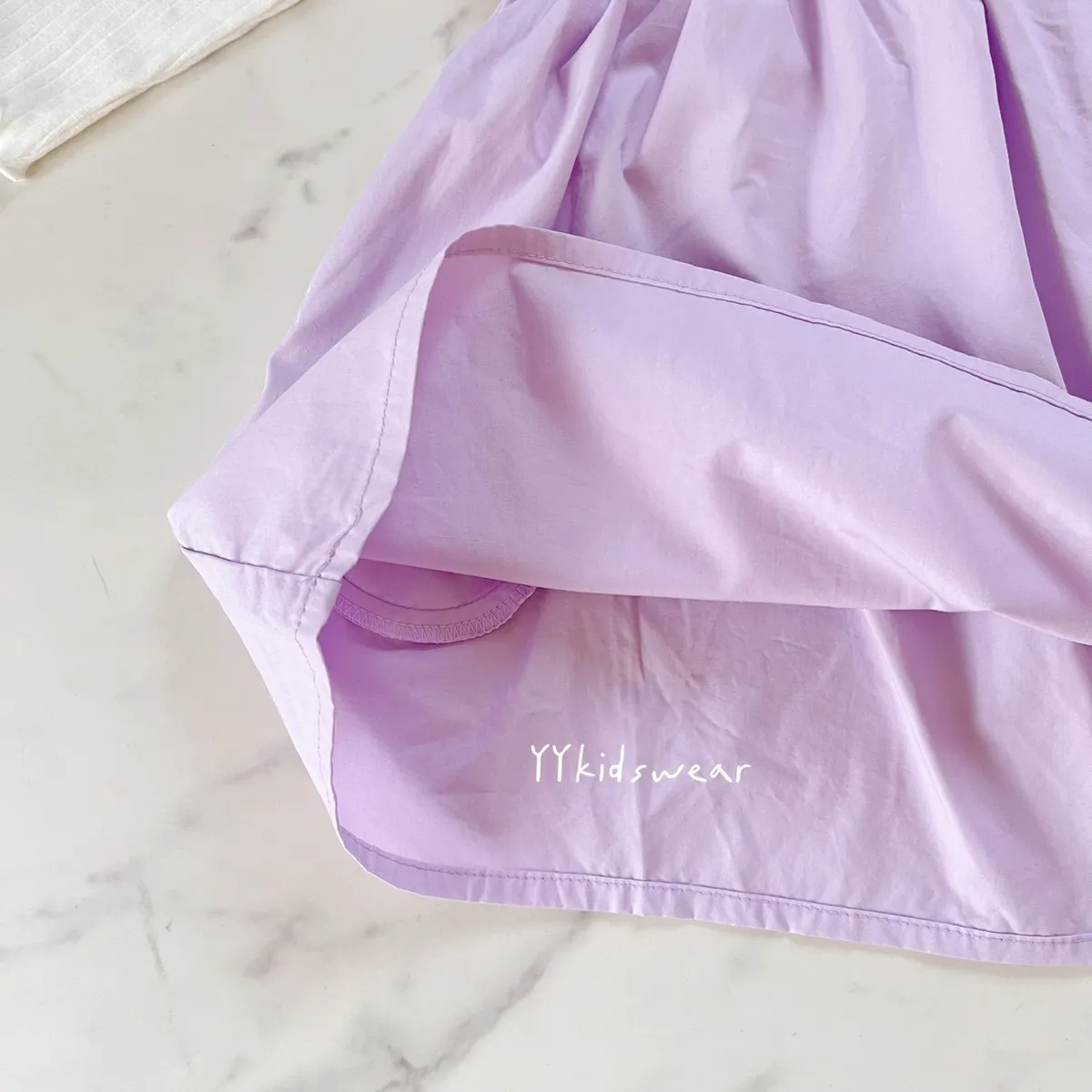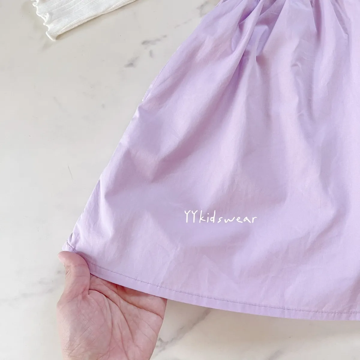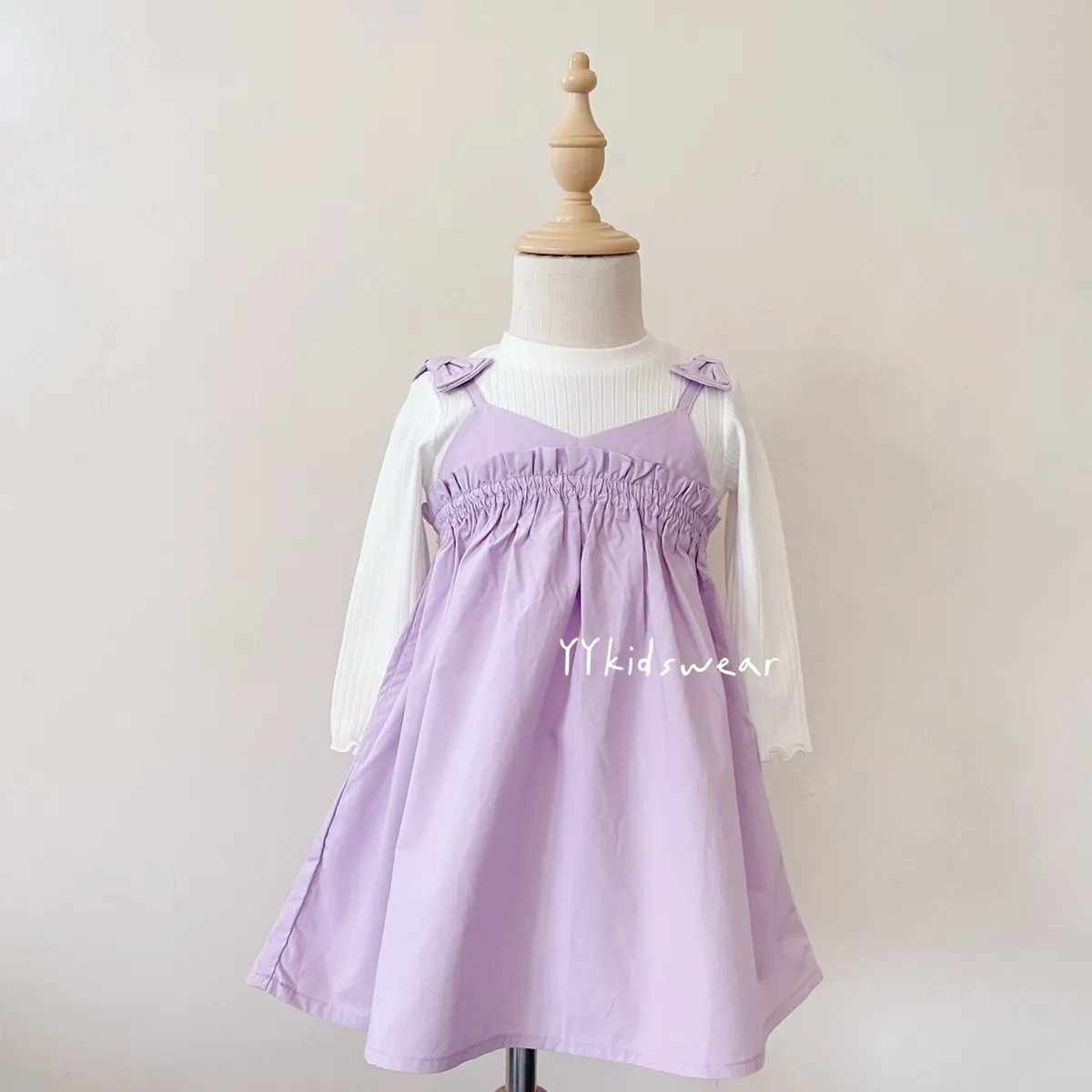 溫柔的紫藤色 💜假兩件的吊帶設計搭配肩上立體蝴蝶結,胸前細緻抓皺,讓裙擺自然垂墜。內搭白色坑條長袖上衣, 洋裝左右兩側有口袋, 甜美中帶點小大人感, 整件散發出高級感的小洋裝~ 彈力: 白色打底: 有| 紫色洋裝:無