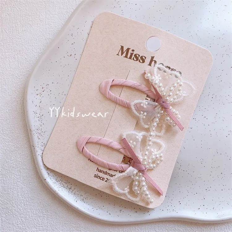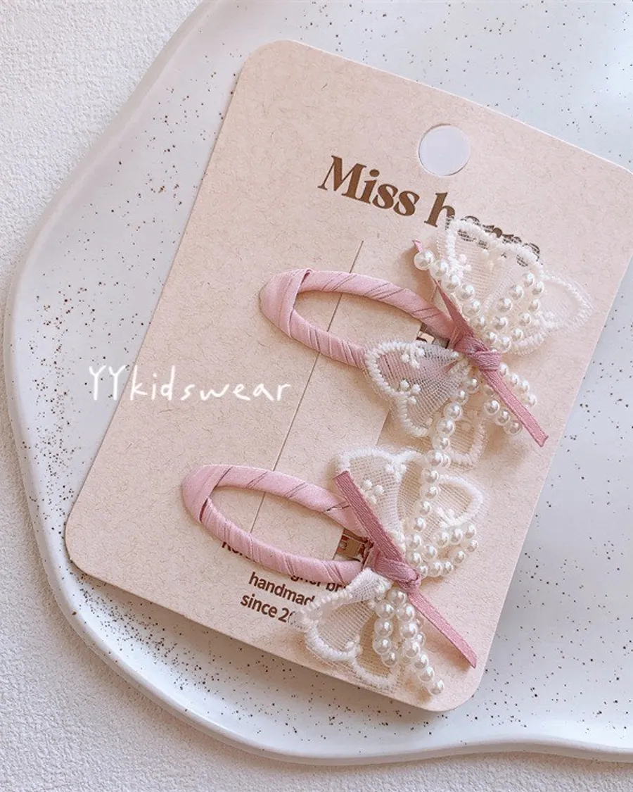 粉雪蕾絲珍珠蝴蝶結雙夾
