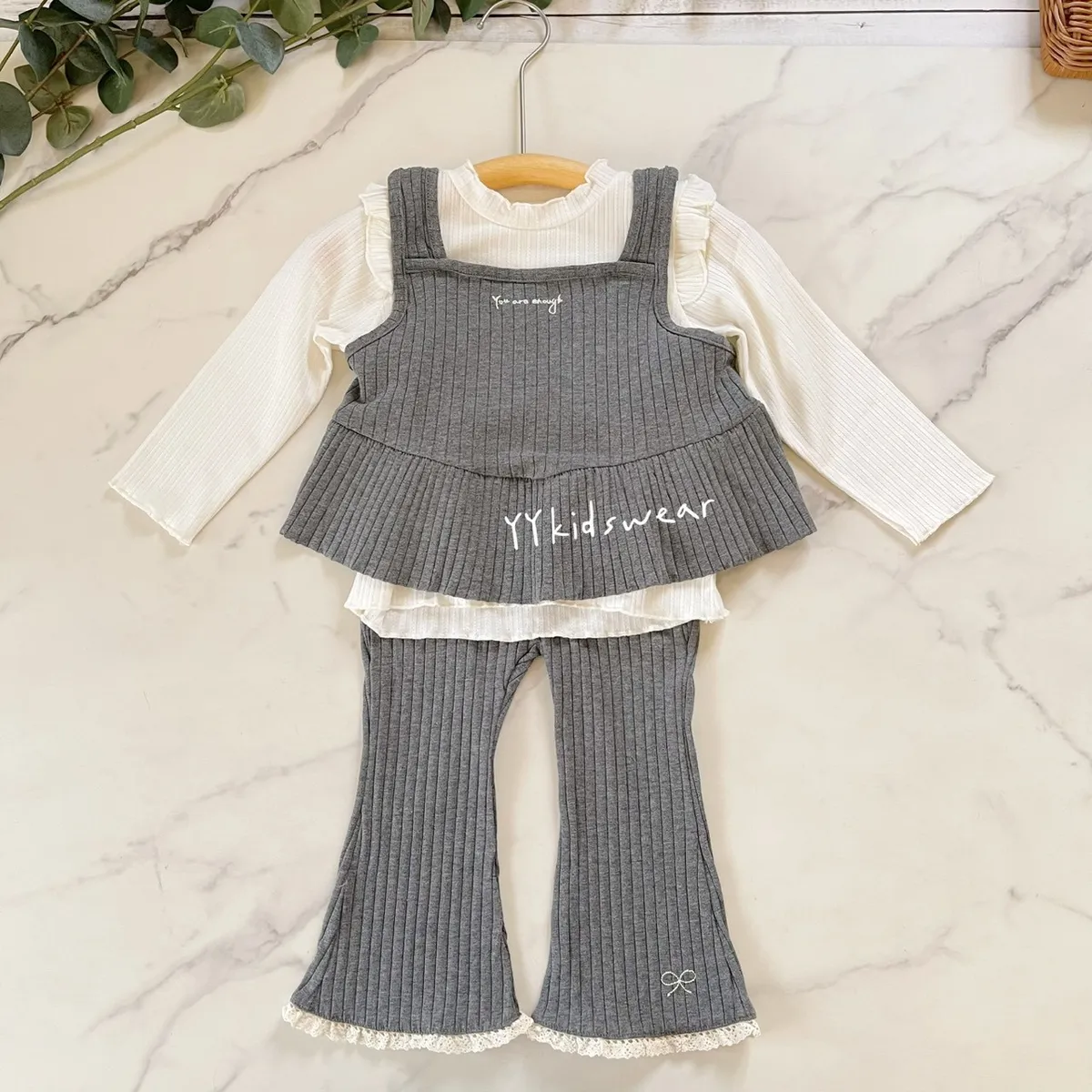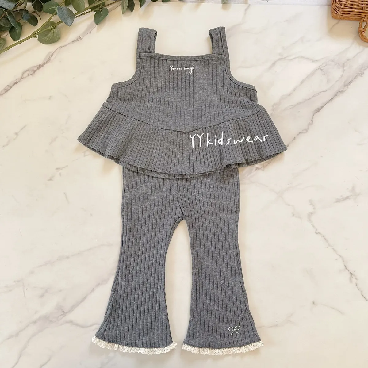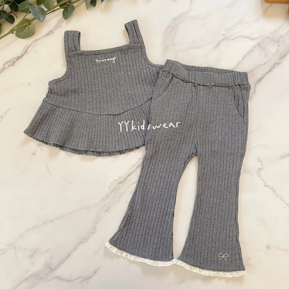 背心下擺是小荷葉,褲管蕾絲小喇叭超修飾腿型。