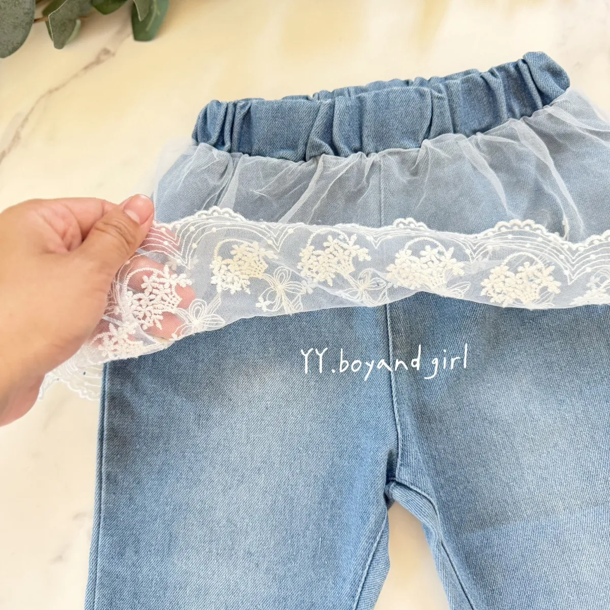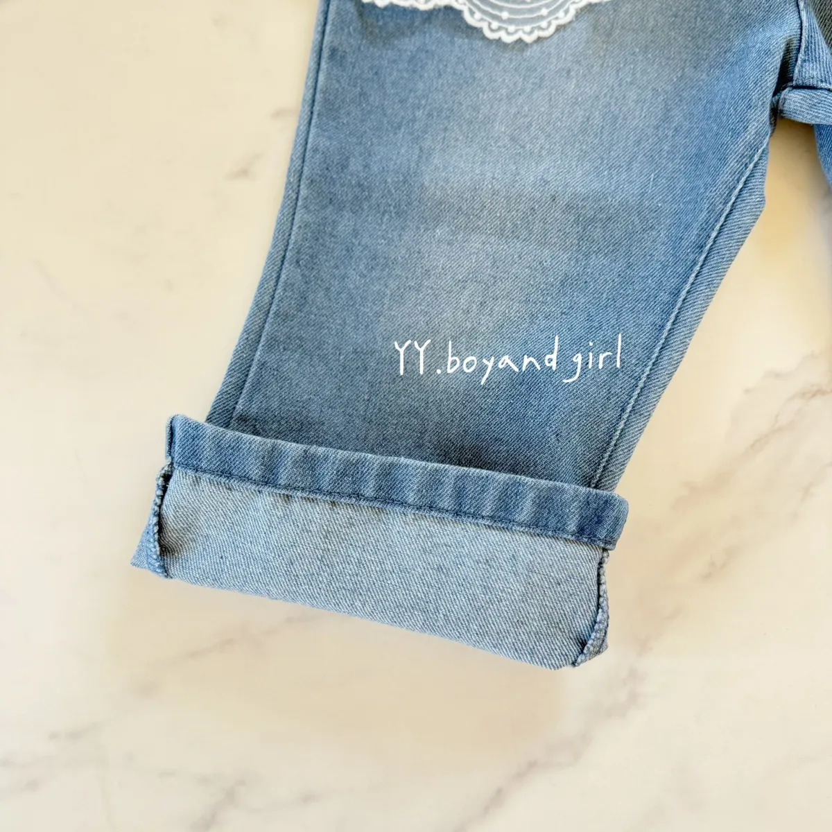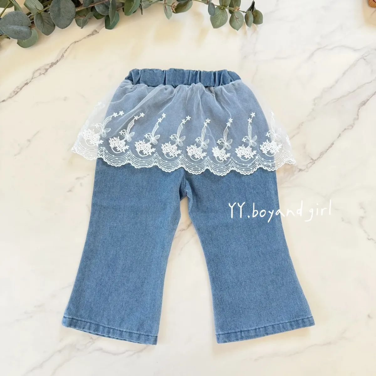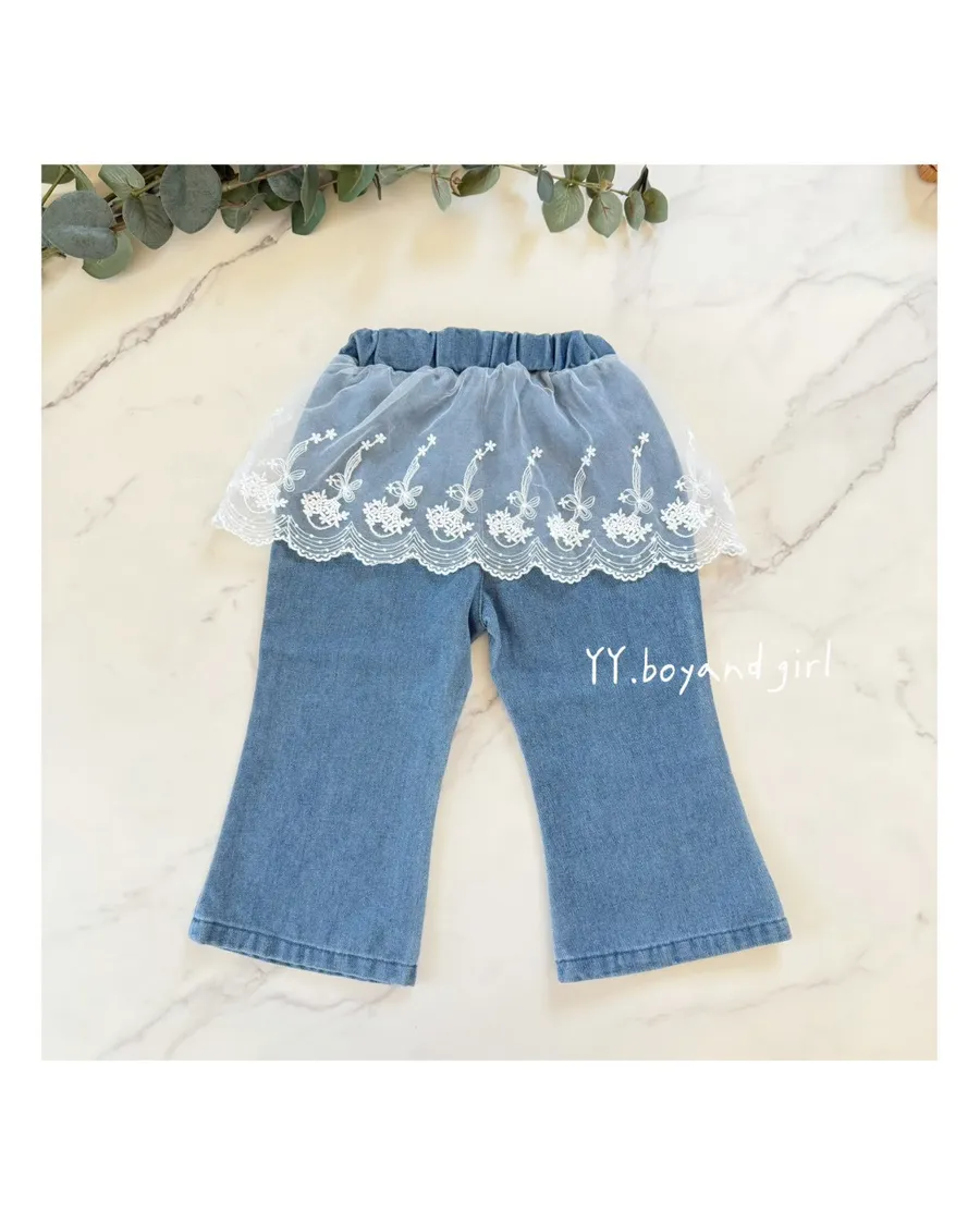 日單蕾絲花語純棉微喇叭牛仔寬褲