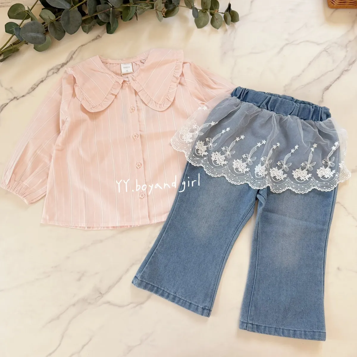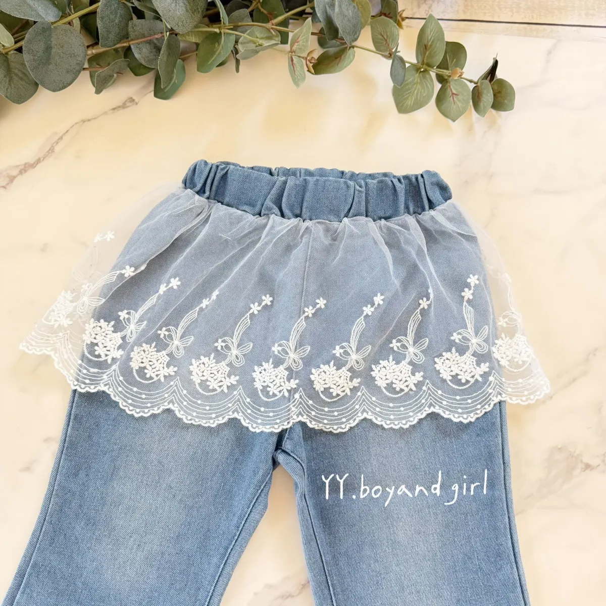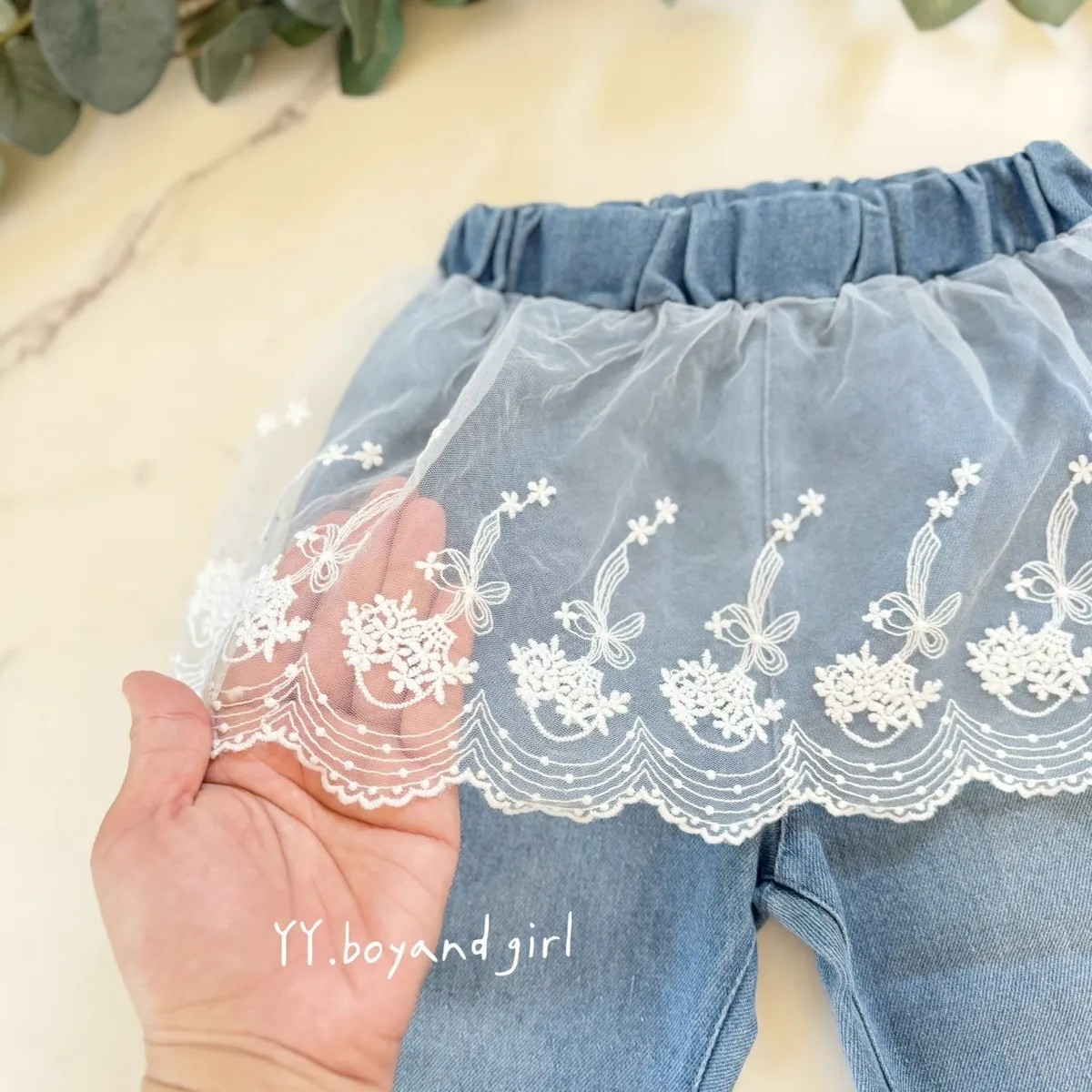 日單蕾絲花語純棉微喇叭牛仔寬褲