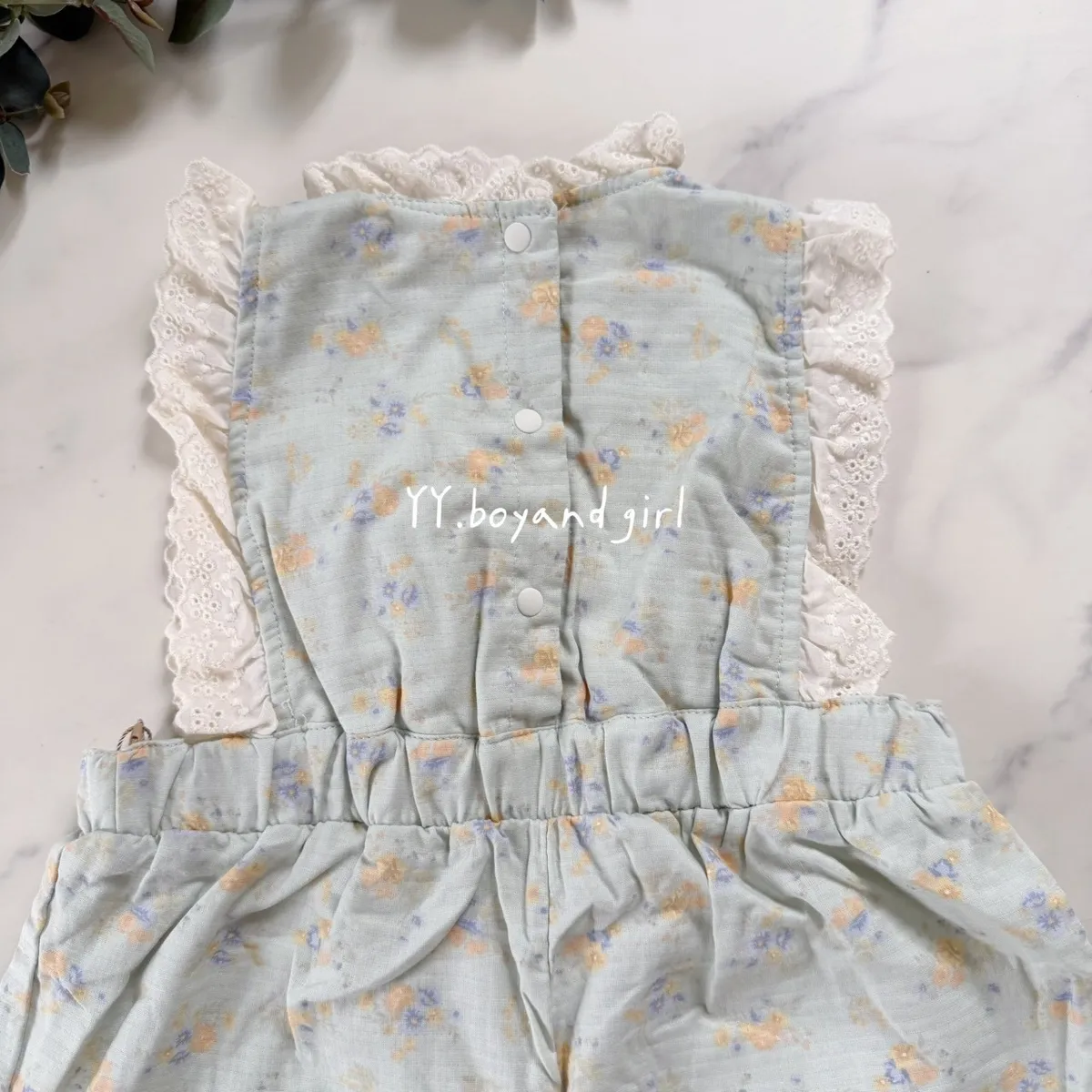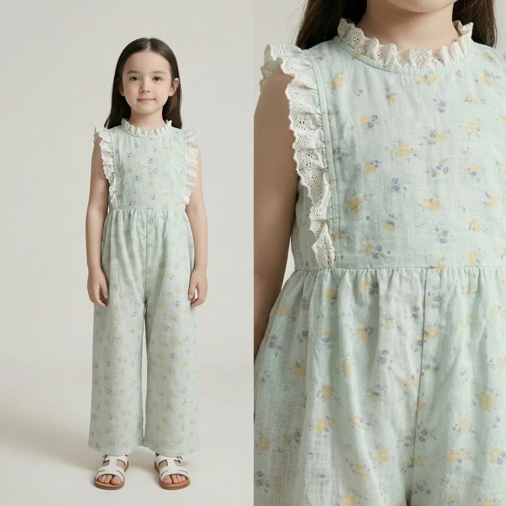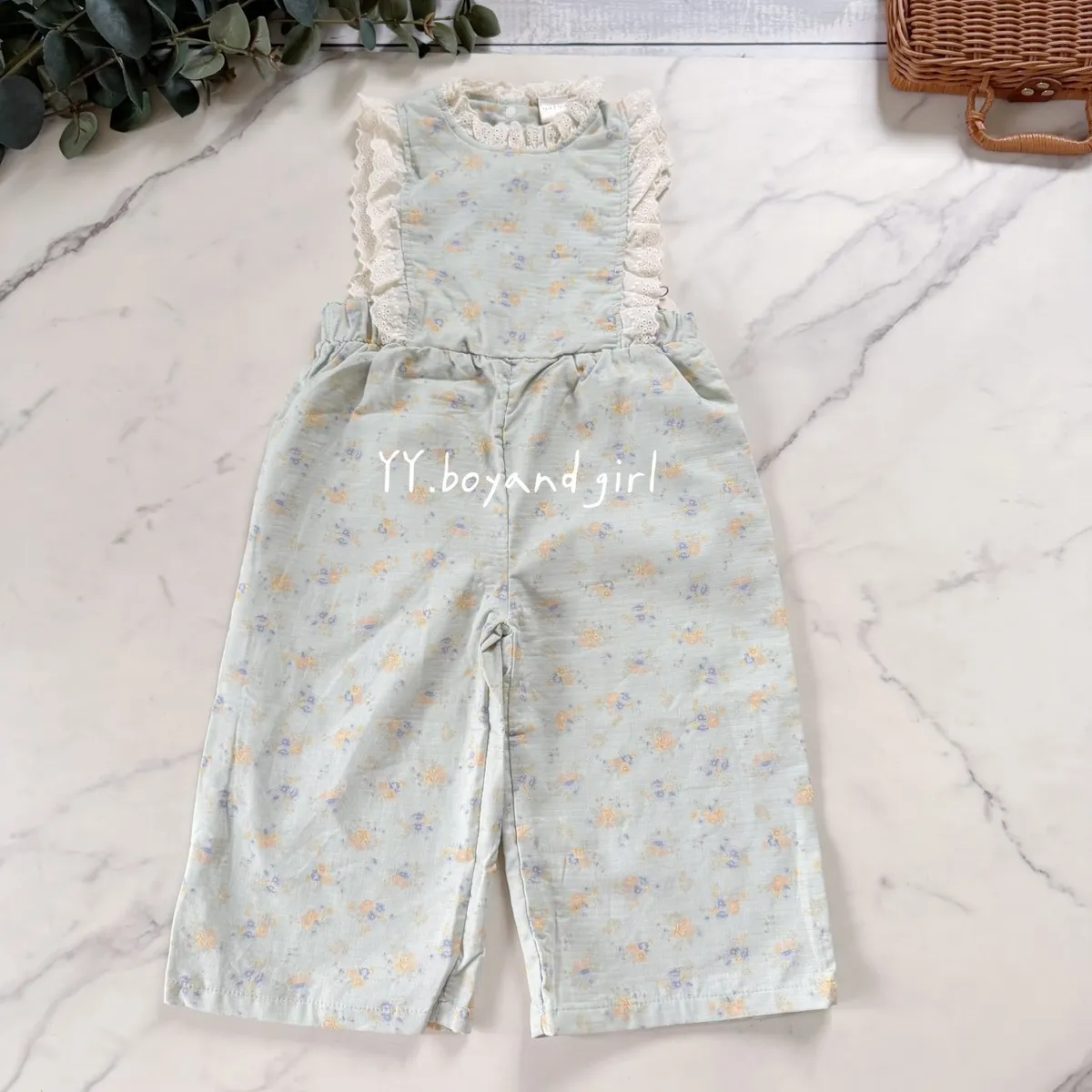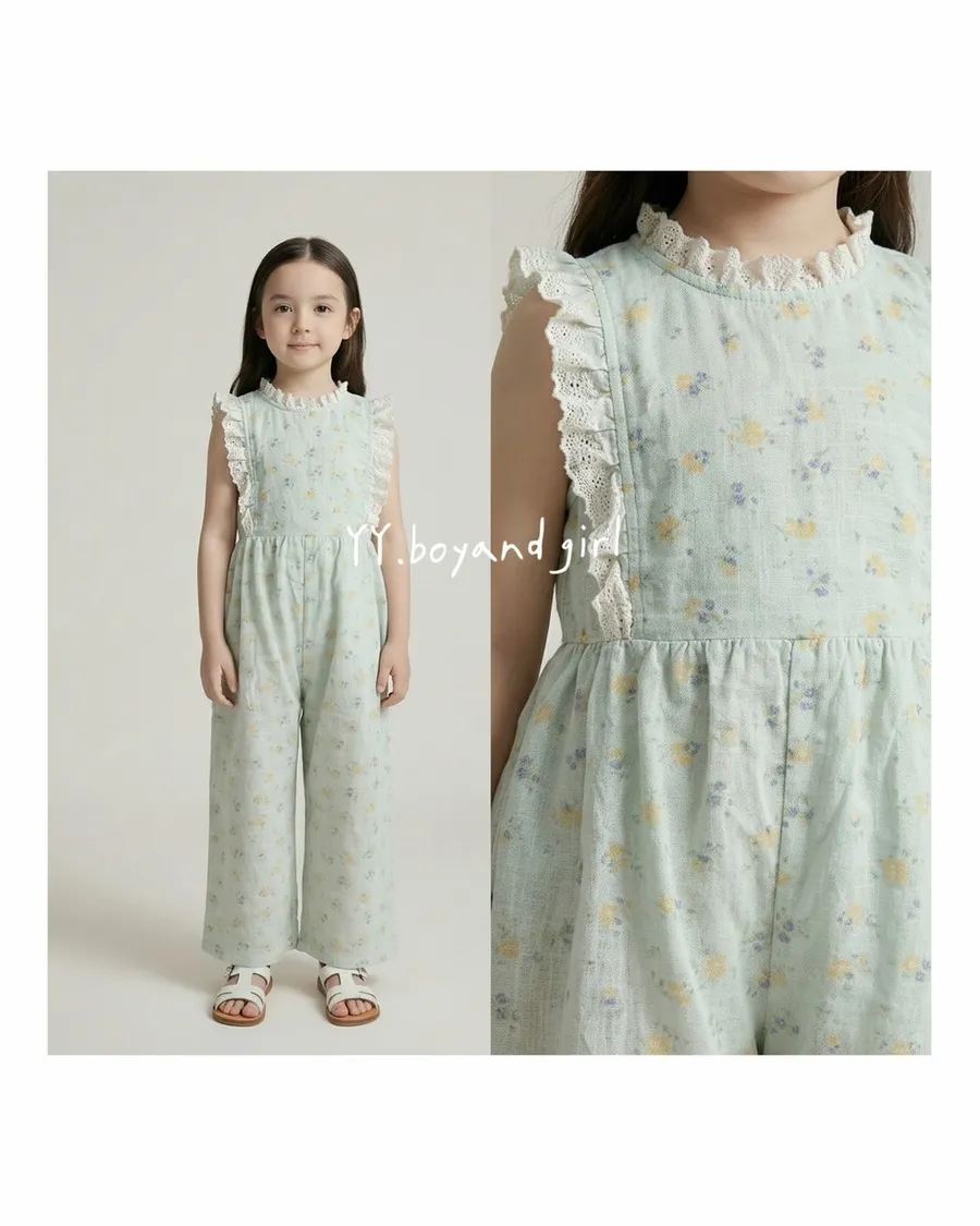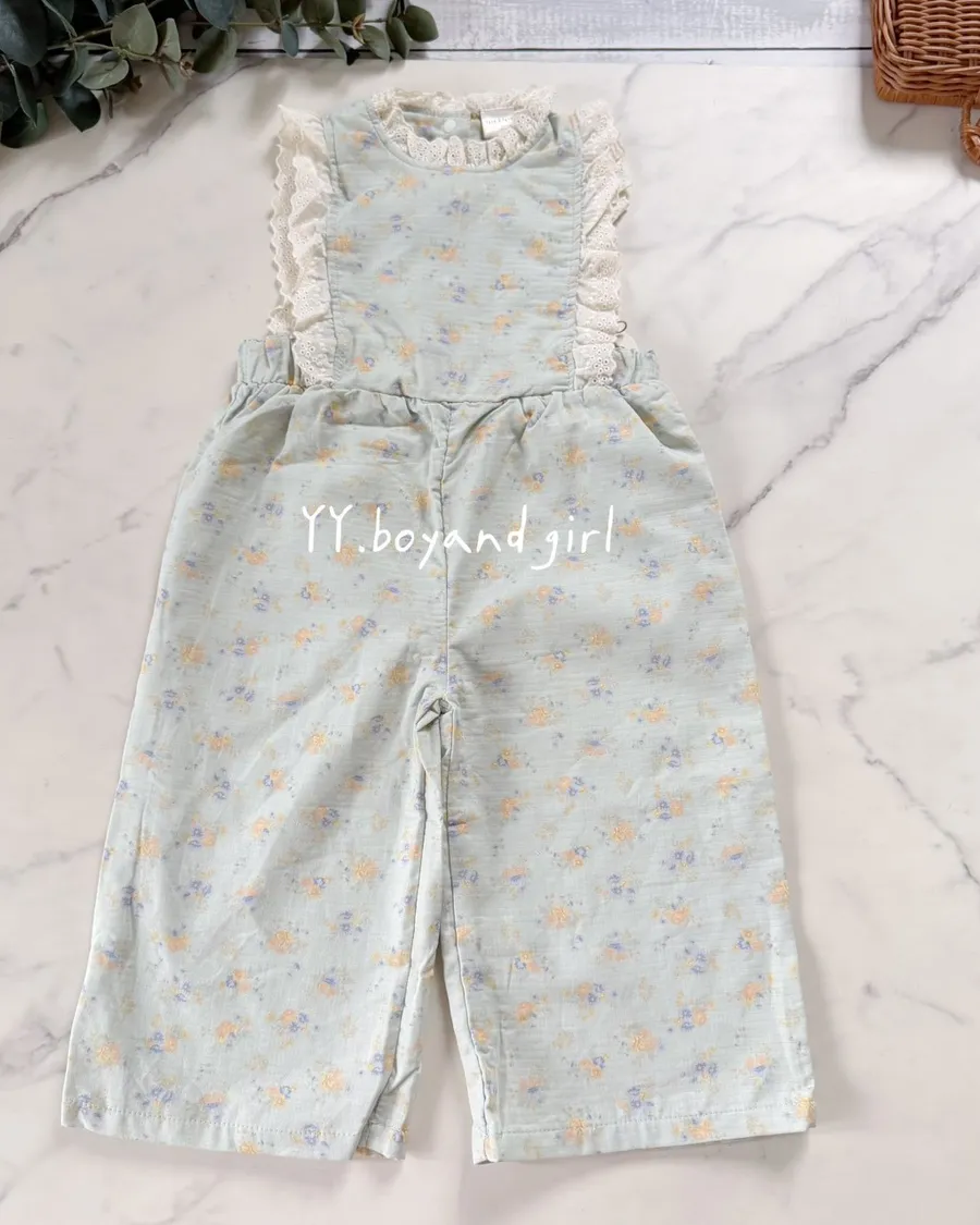 日單霧水藍小花蕾絲輕柔連身褲