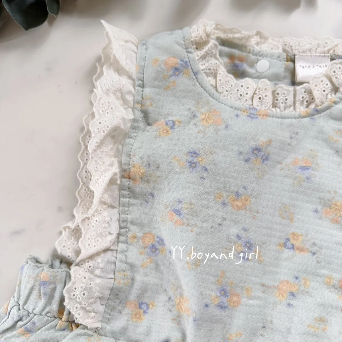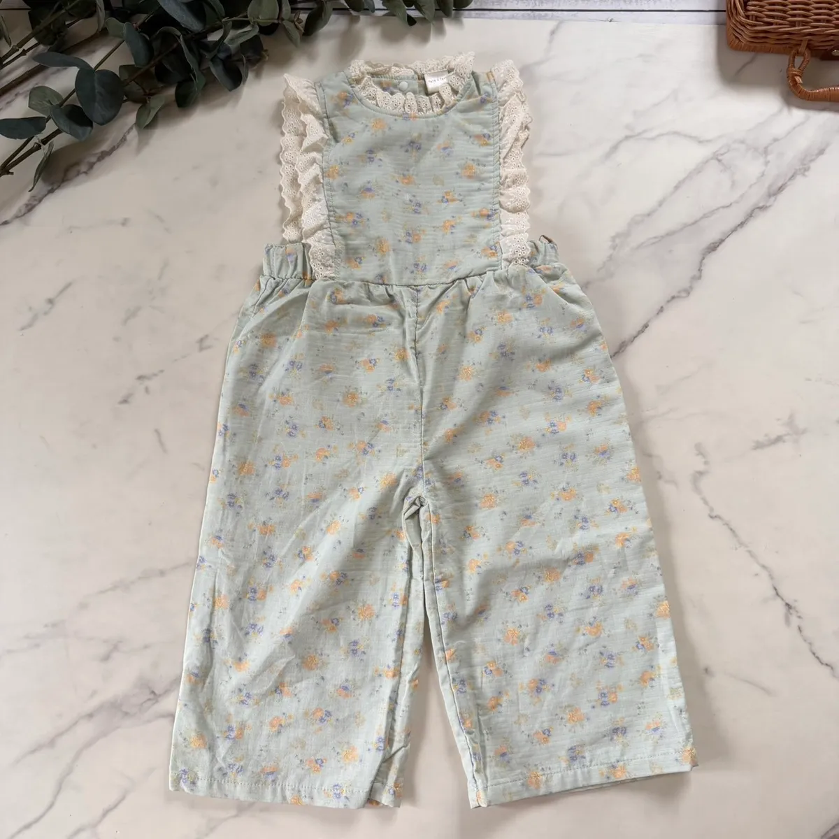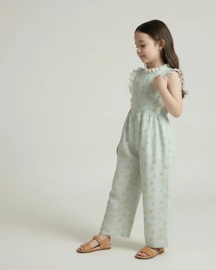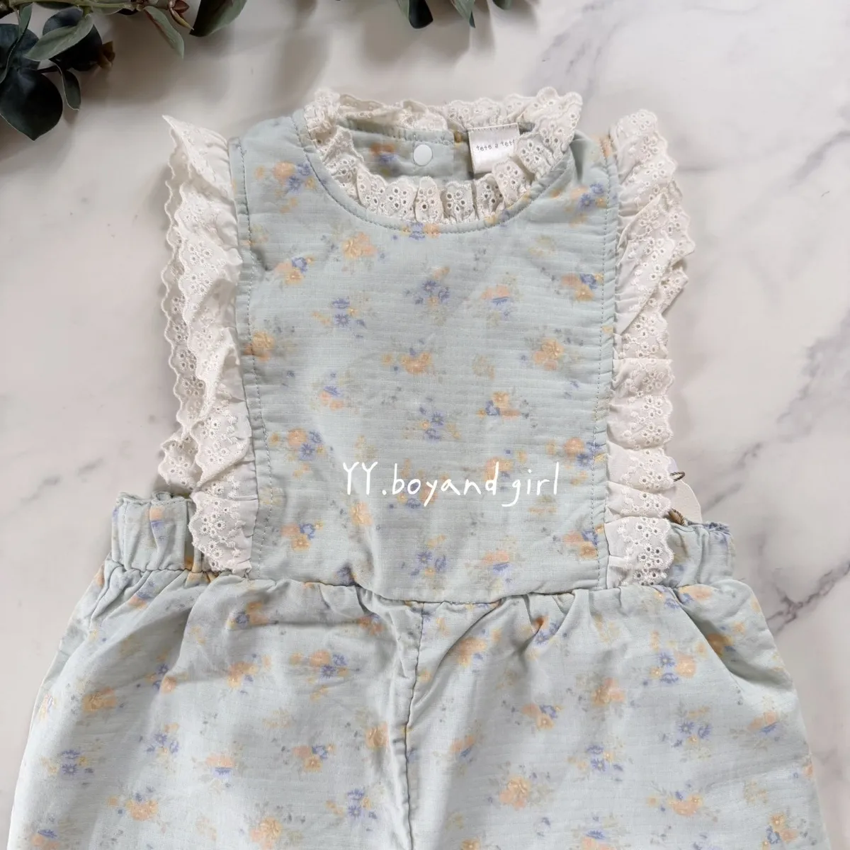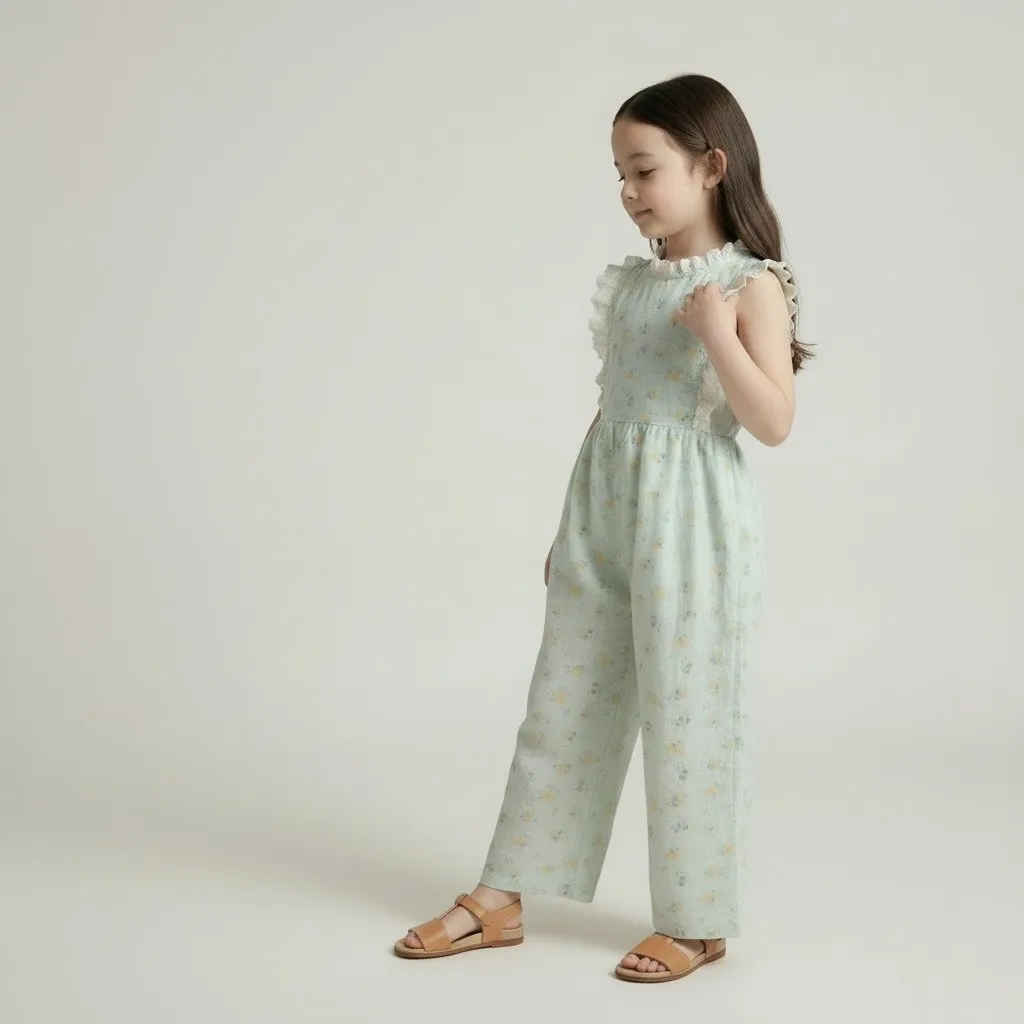 日單霧水藍小花蕾絲輕柔連身褲